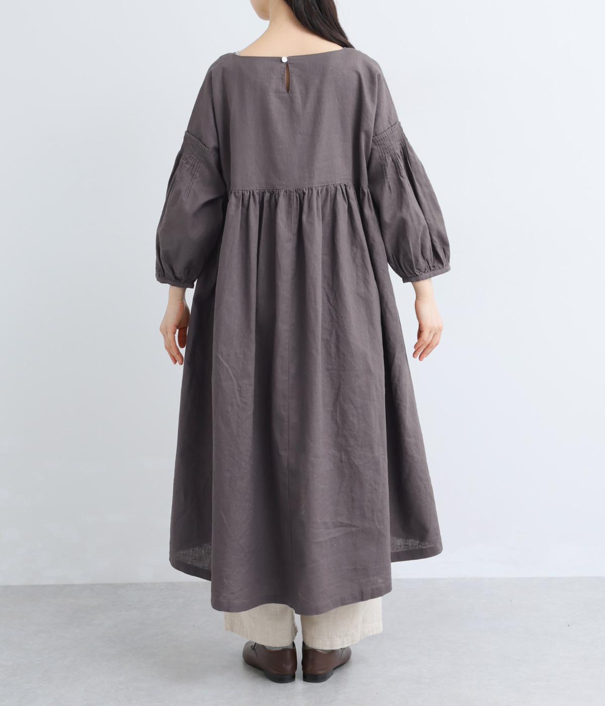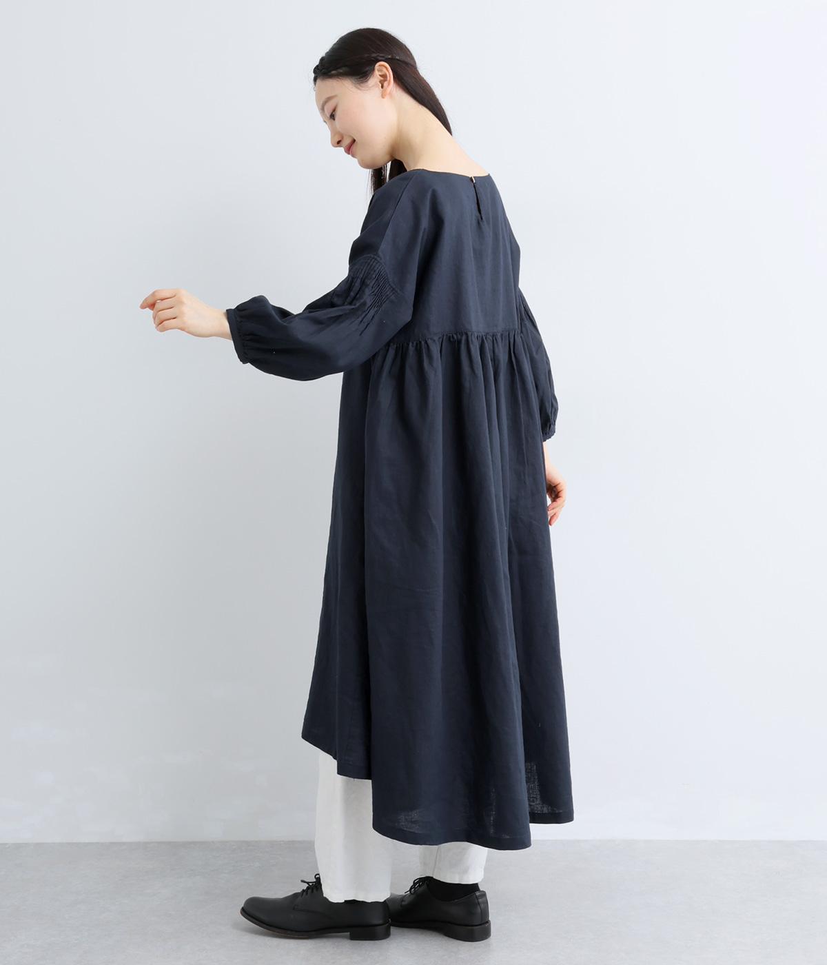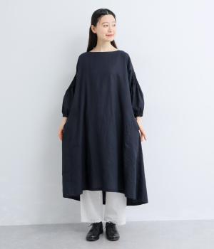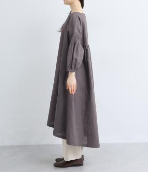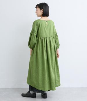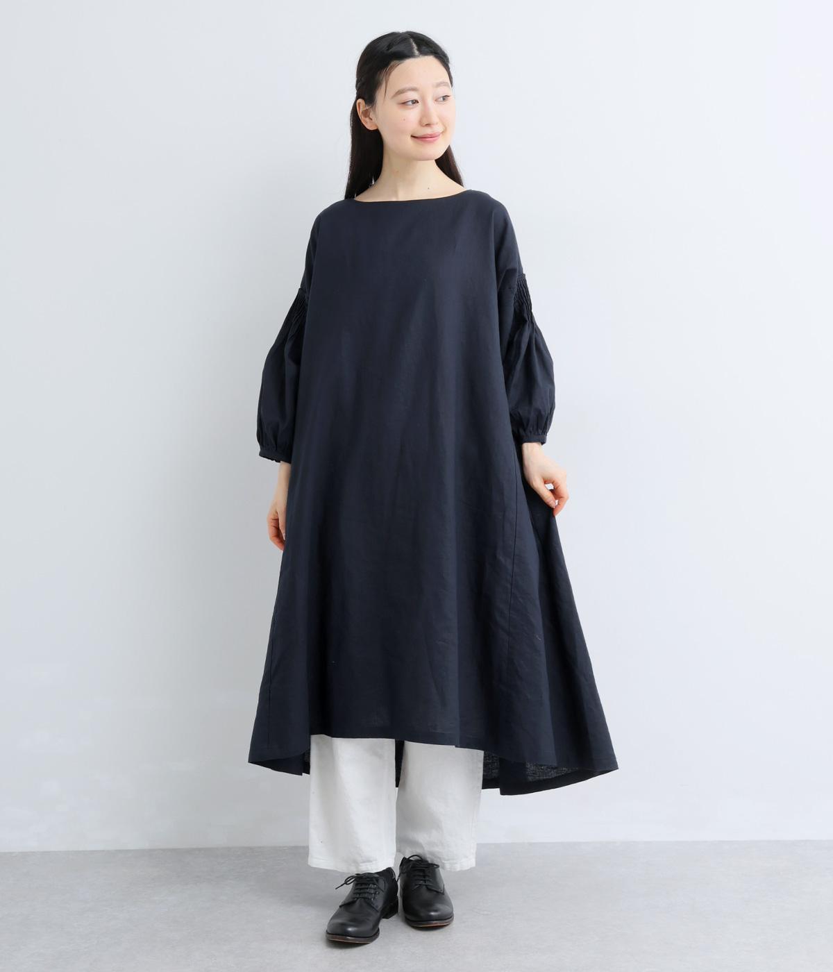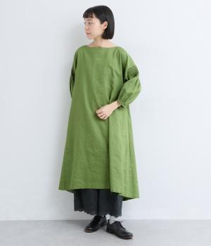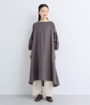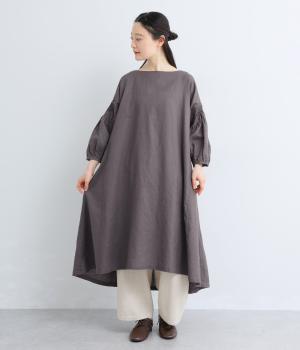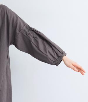 落ち着いた佇まいのなかに、さりげない華やかさを忍ばせたワンピースです。フロントはシンプルに、背面はヨーク下にギャザーを施し、うしろ姿にやさしいボリュームを加えました。袖のピンタックが陰影を生み、ふっくらとした立体感をプラス。前後差のある裾が足元に抜け感をつくり、レイヤードを軽やかに仕上げます。