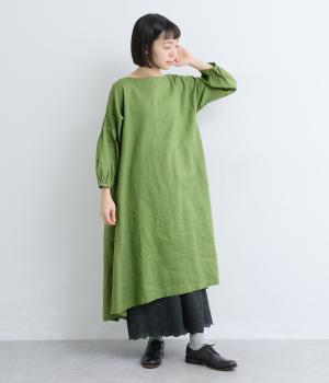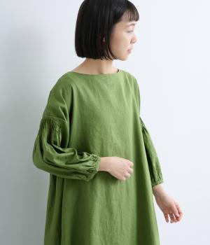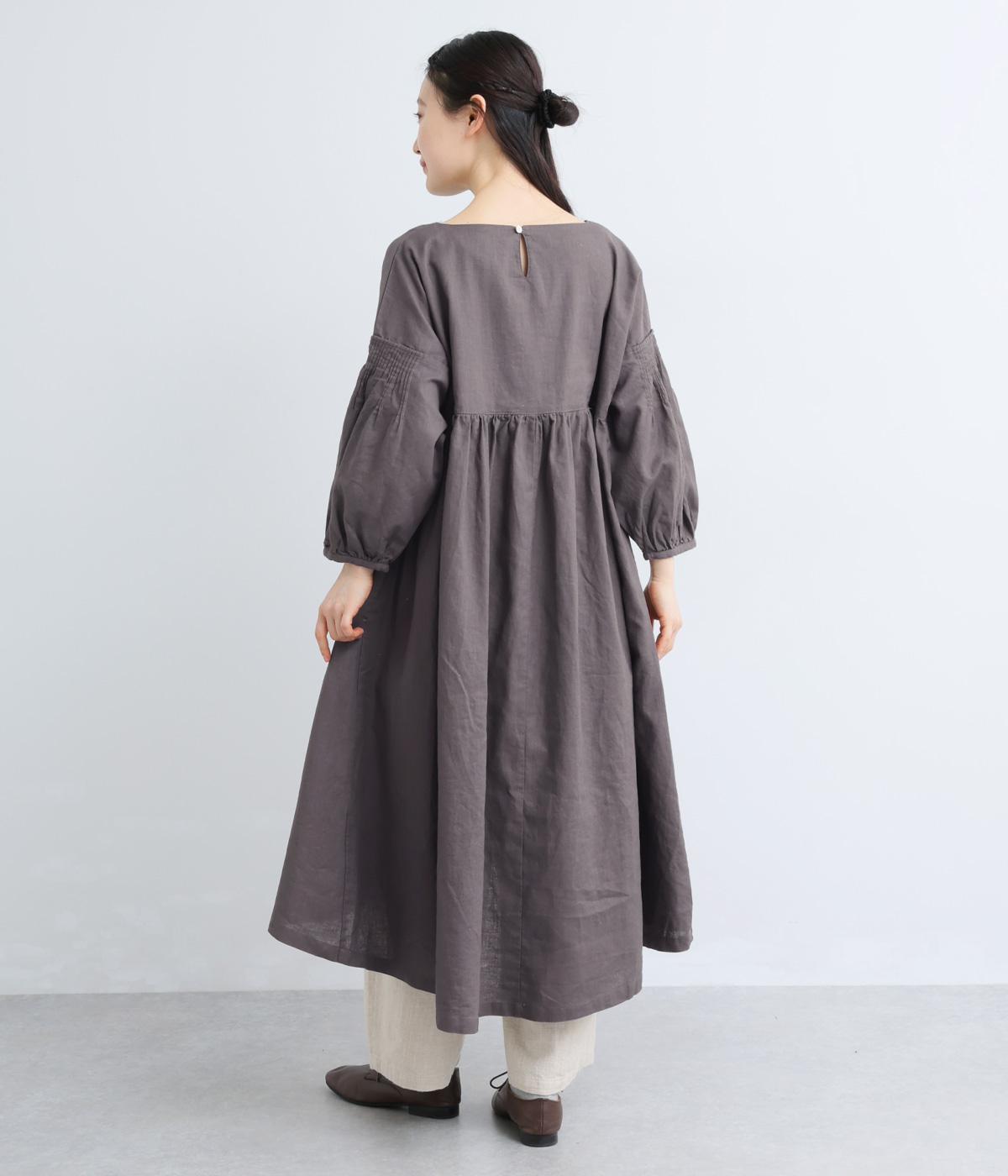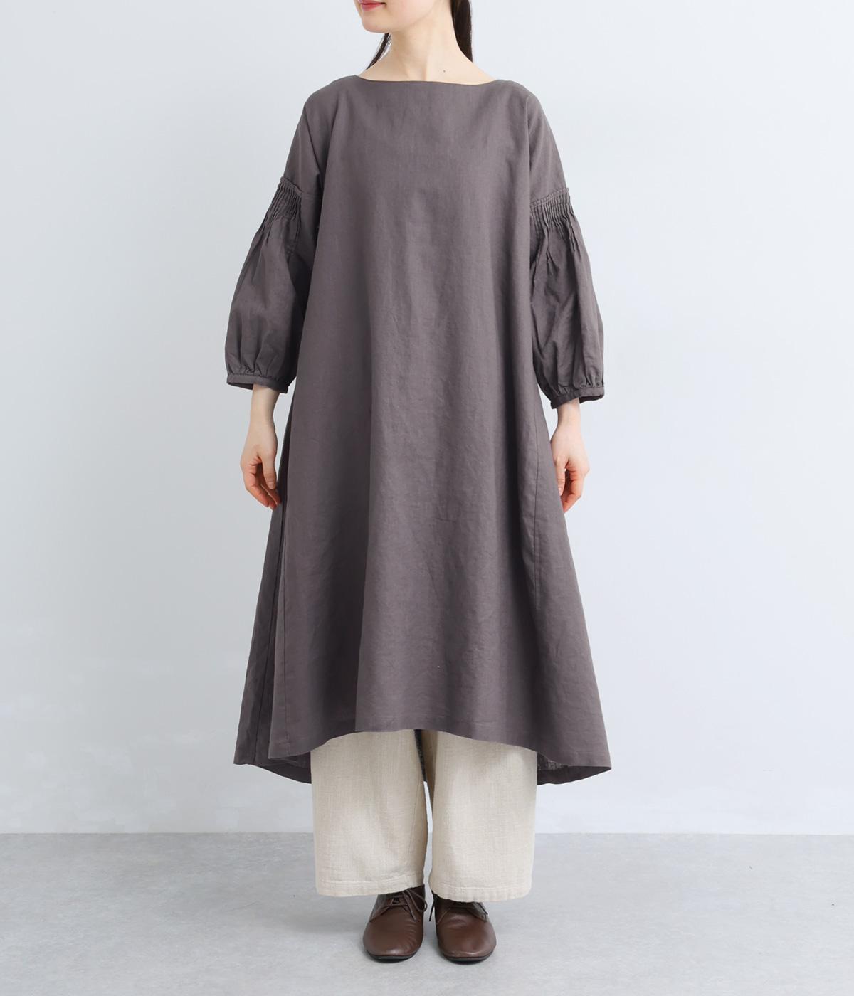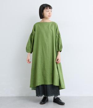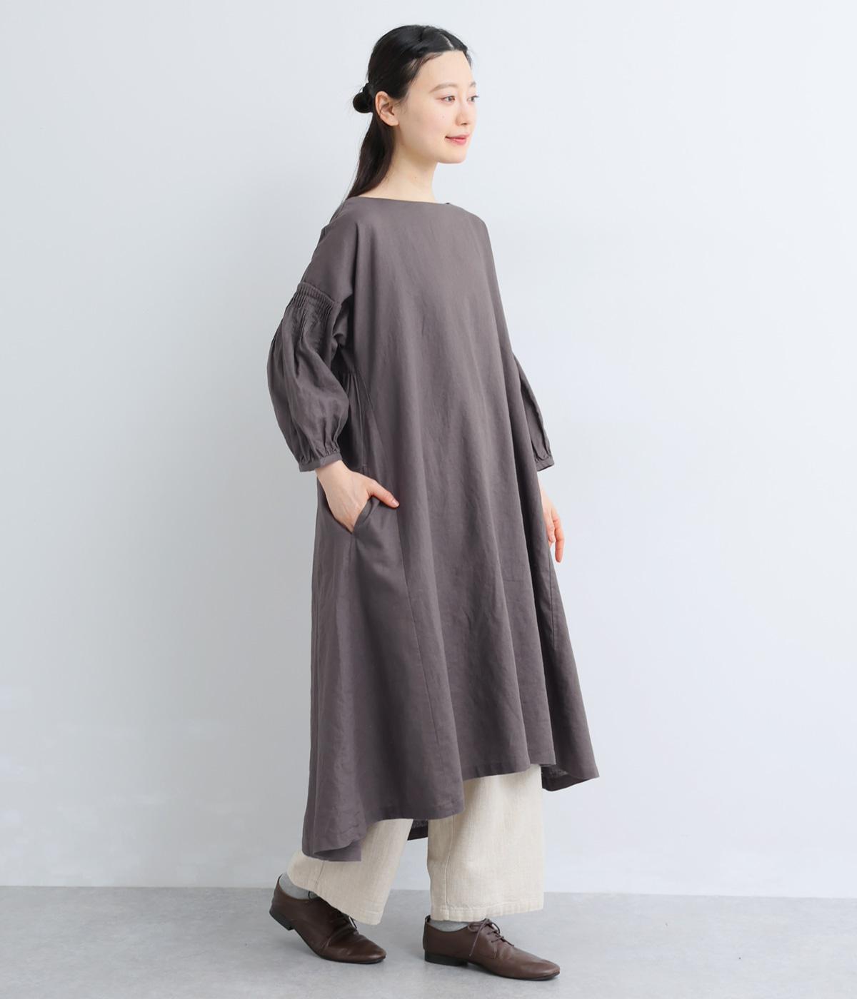 落ち着いた佇まいのなかに、さりげない華やかさを忍ばせたワンピースです。フロントはシンプルに、背面はヨーク下にギャザーを施し、うしろ姿にやさしいボリュームを加えました。袖のピンタックが陰影を生み、ふっくらとした立体感をプラス。前後差のある裾が足元に抜け感をつくり、レイヤードを軽やかに仕上げます。