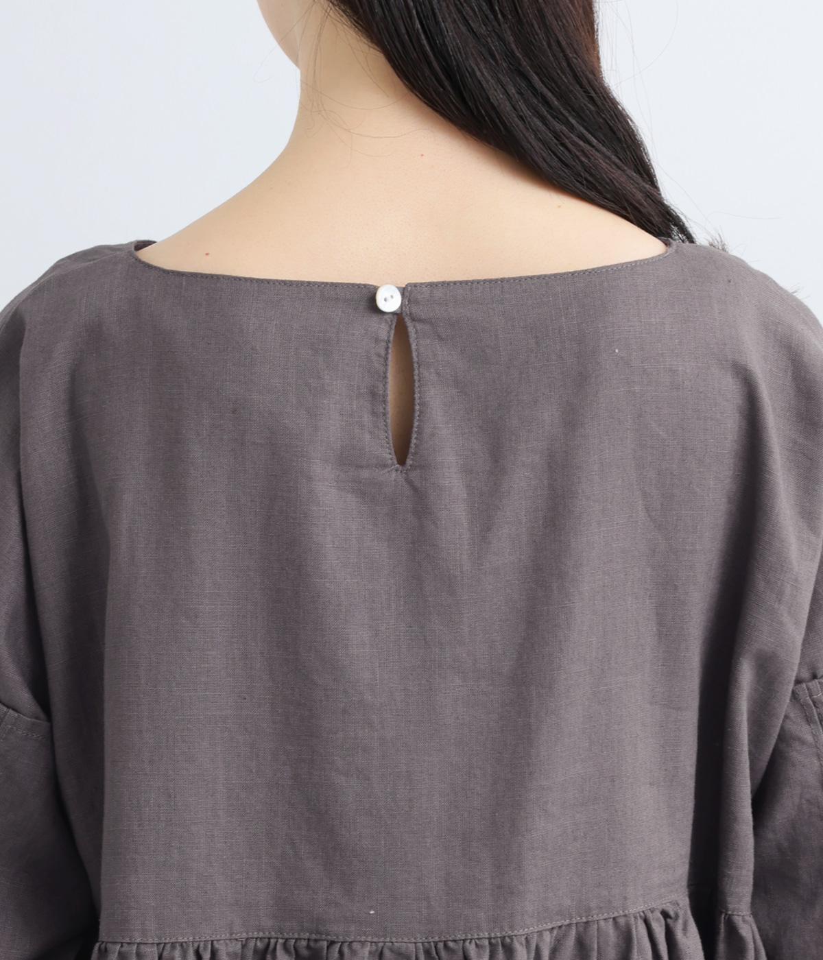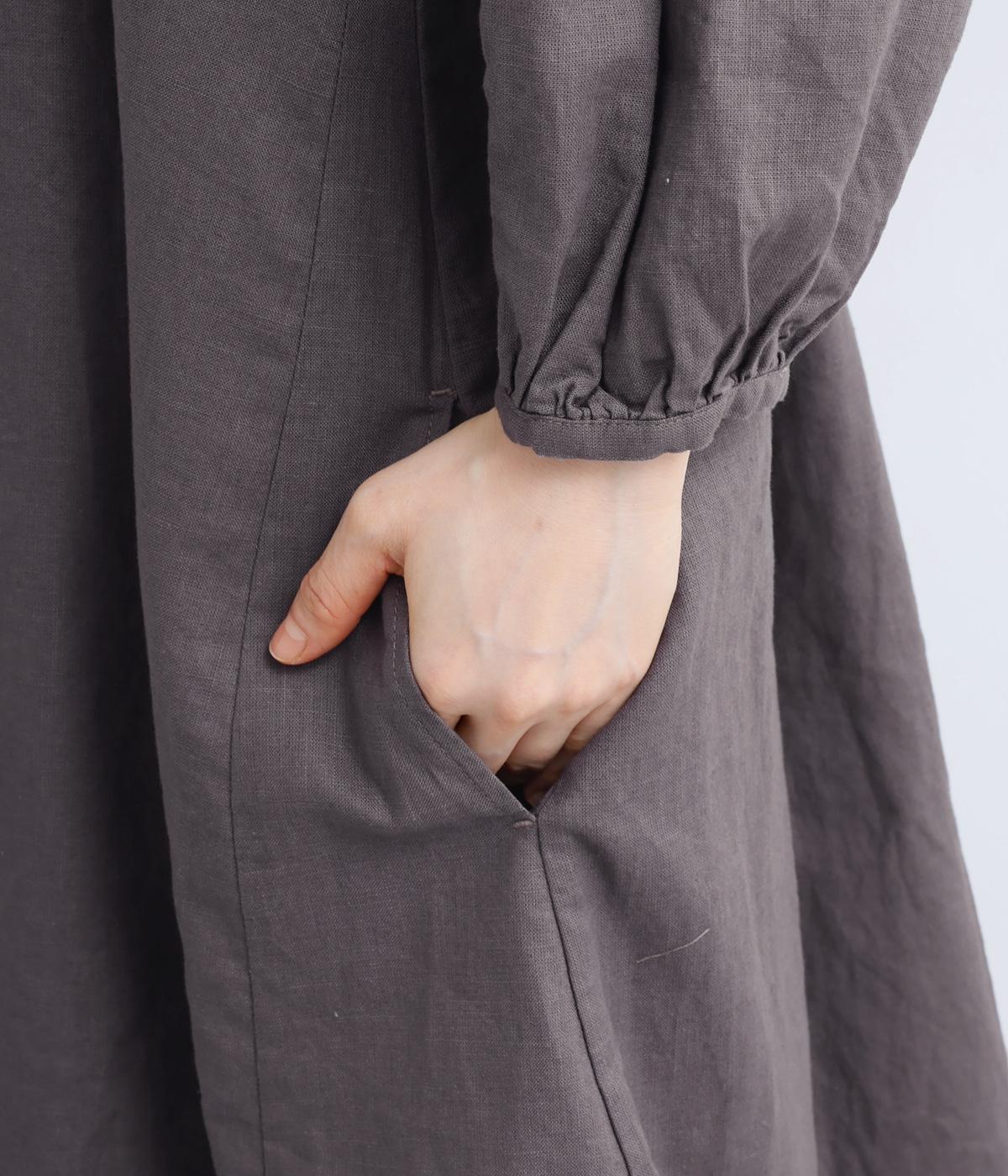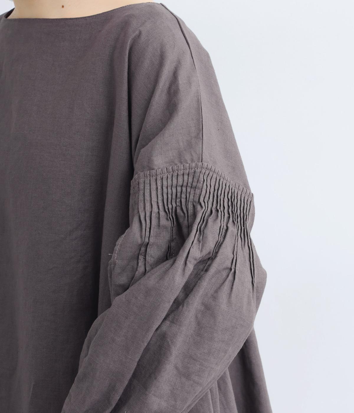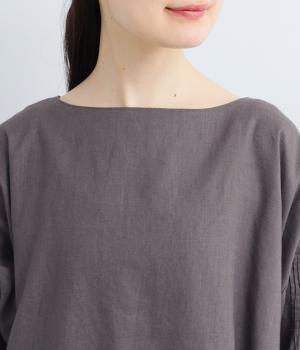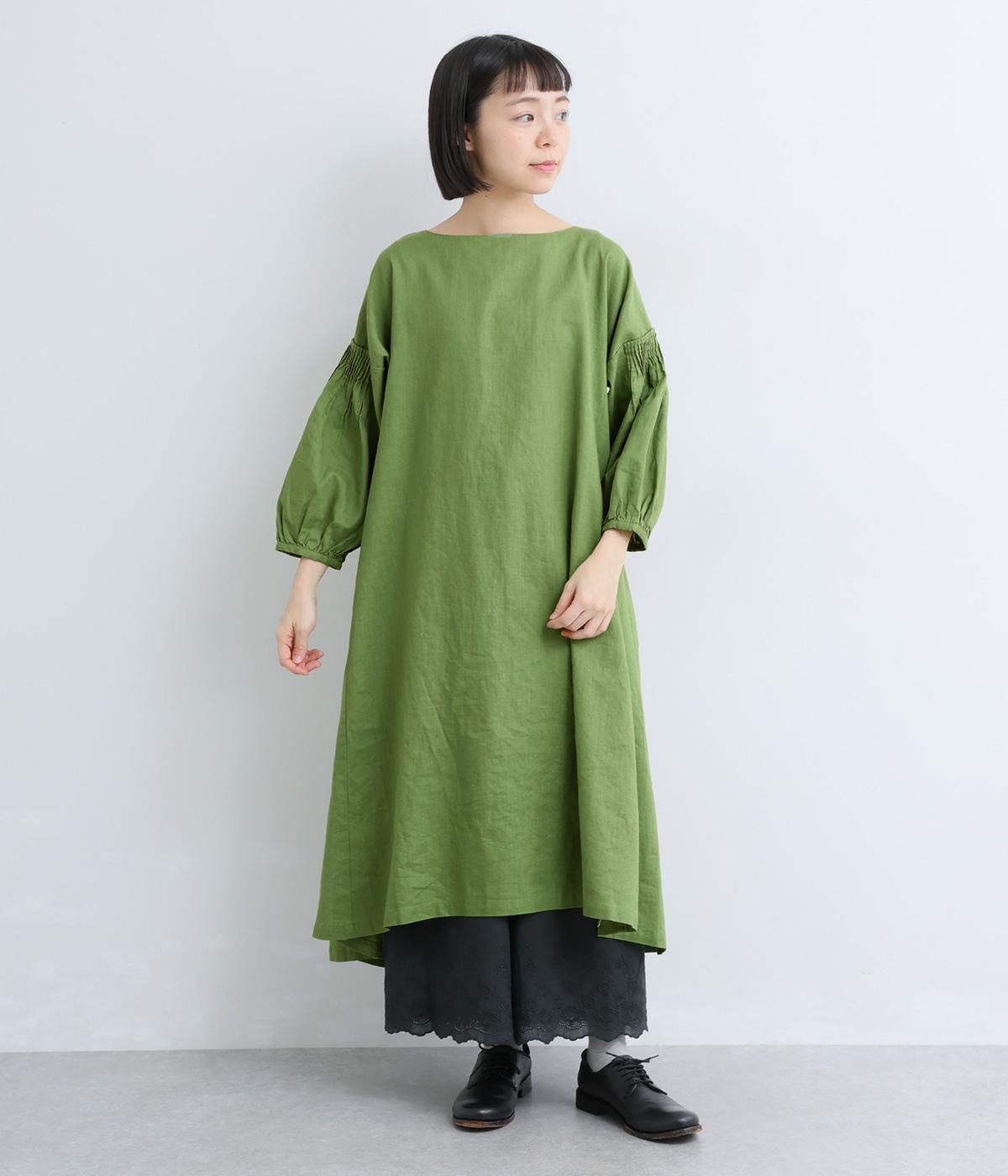 落ち着いた佇まいのなかに、さりげない華やかさを忍ばせたワンピースです。フロントはシンプルに、背面はヨーク下にギャザーを施し、うしろ姿にやさしいボリュームを加えました。袖のピンタックが陰影を生み、ふっくらとした立体感をプラス。前後差のある裾が足元に抜け感をつくり、レイヤードを軽やかに仕上げます。