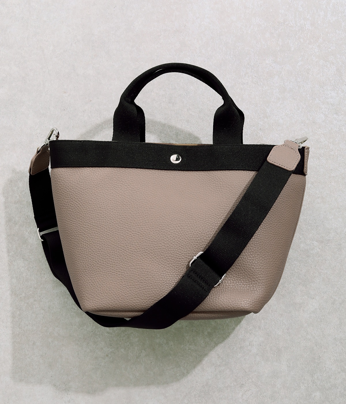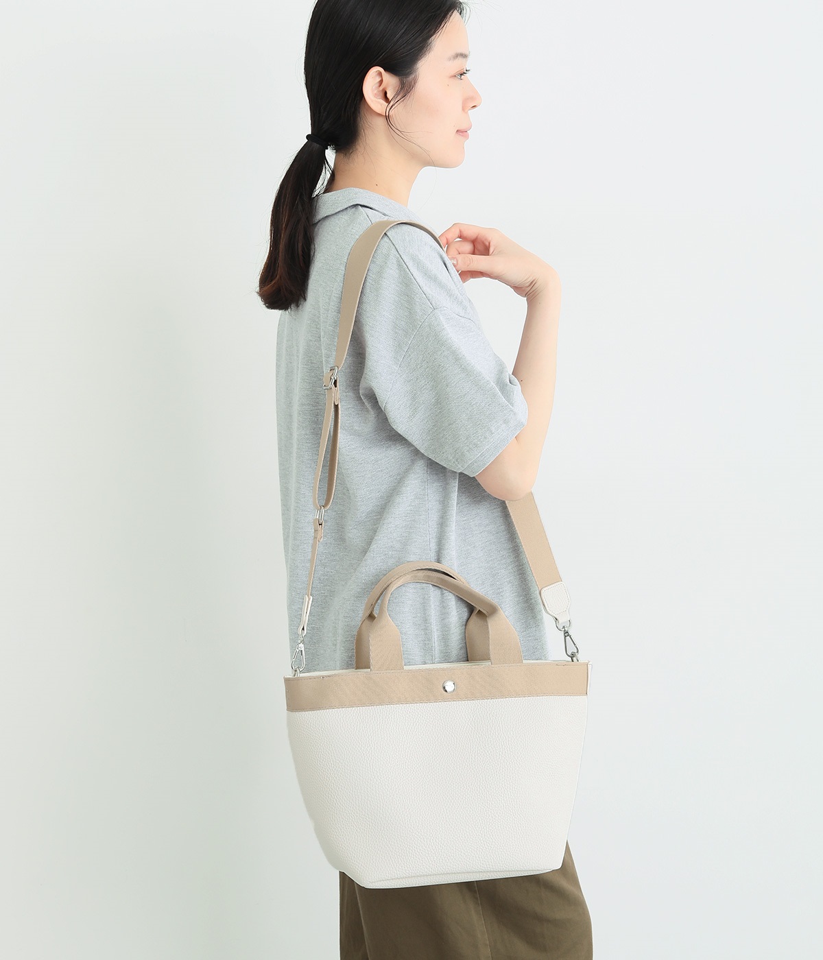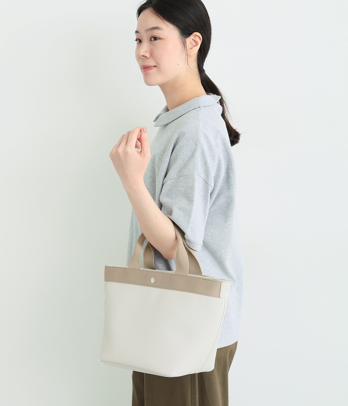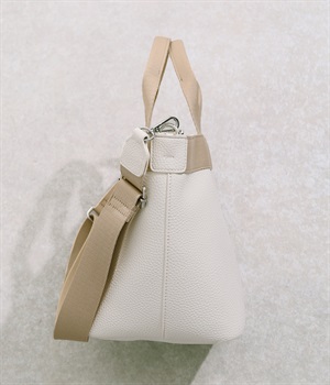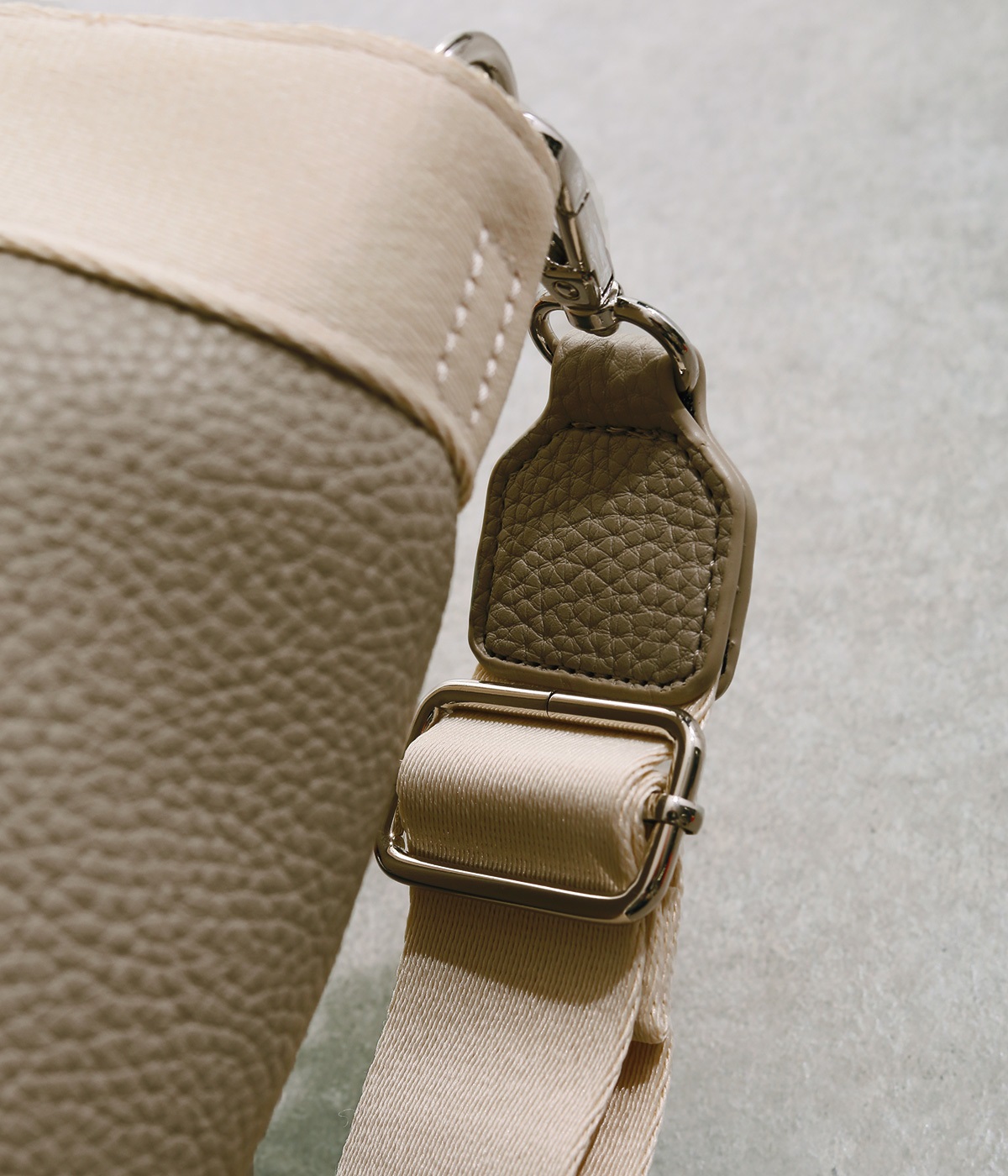 シボ感のあるセミマットな素材が品よく大人な表情を惹きたてます。合成皮革なのでケアしやすく、デイリーに使いやすいのもグッドポイント。
