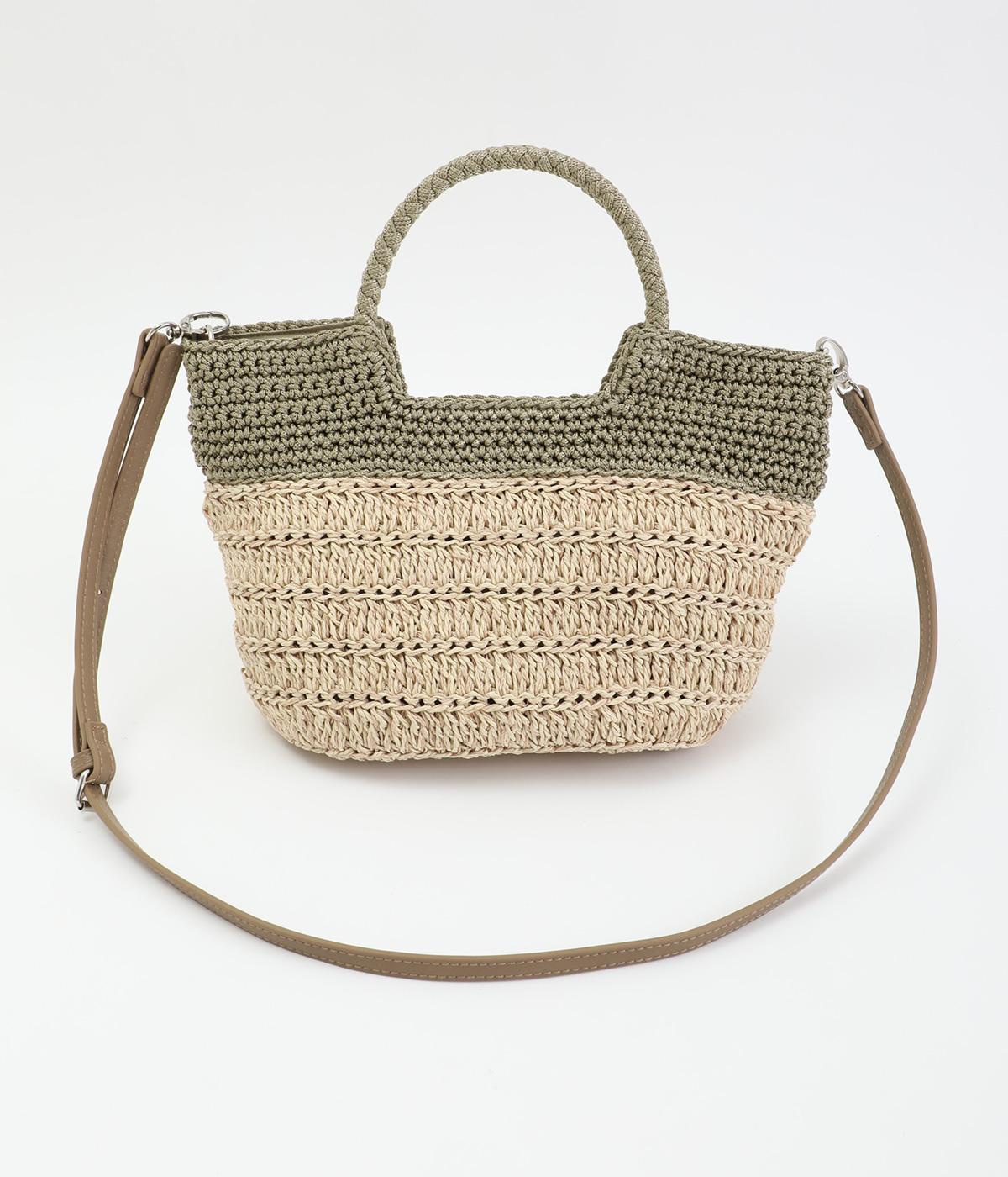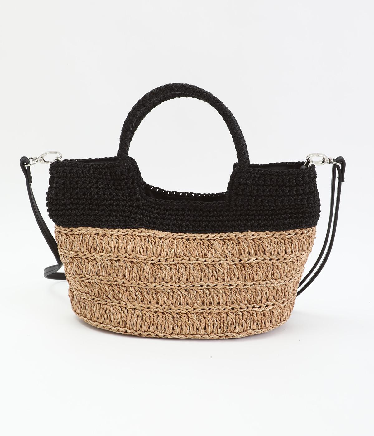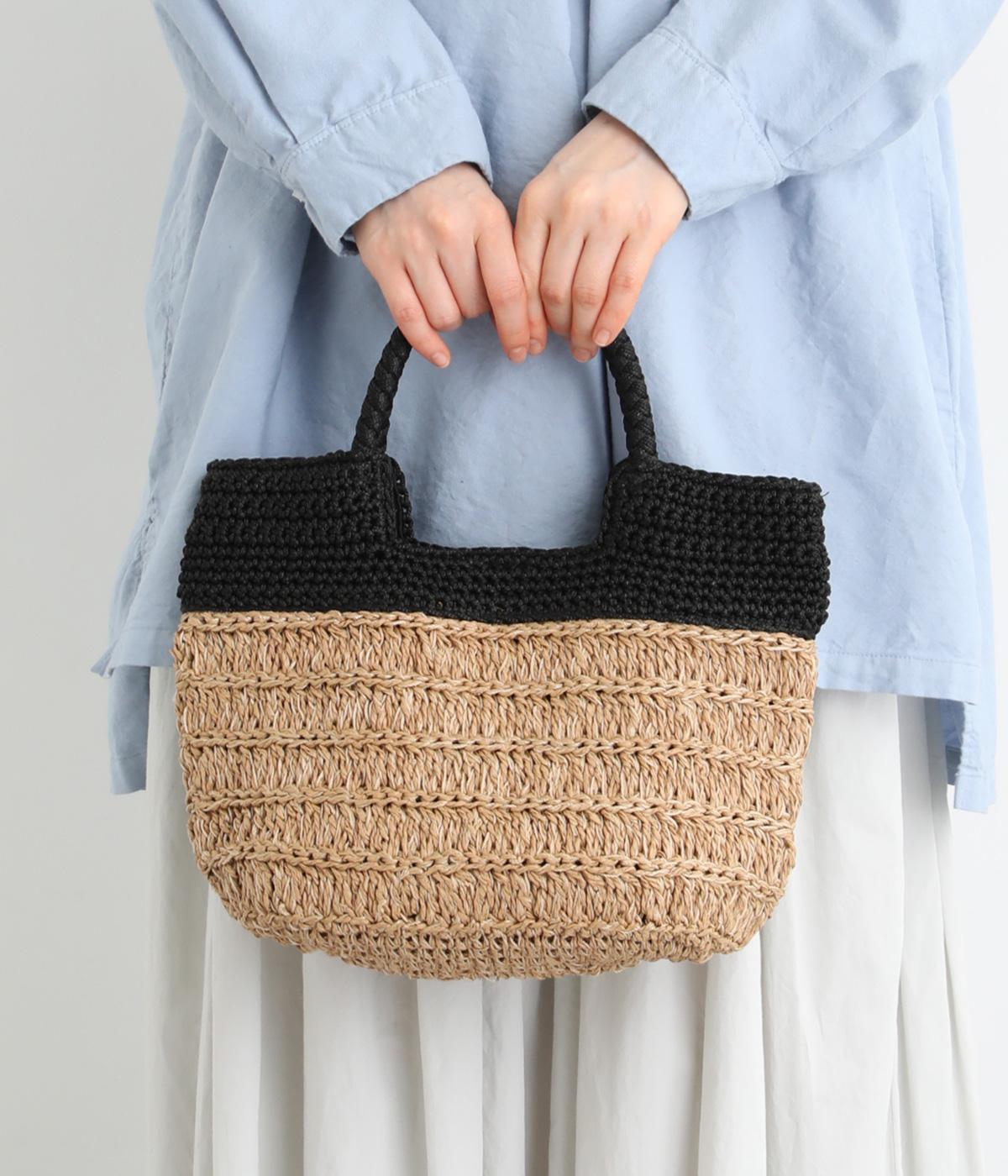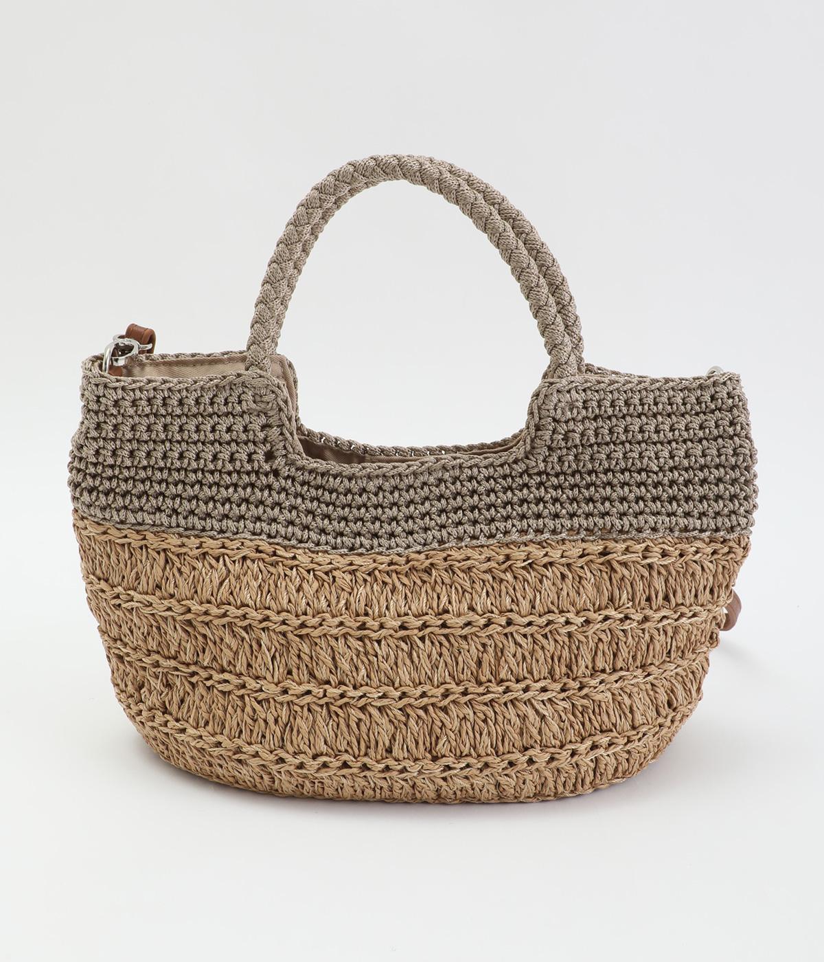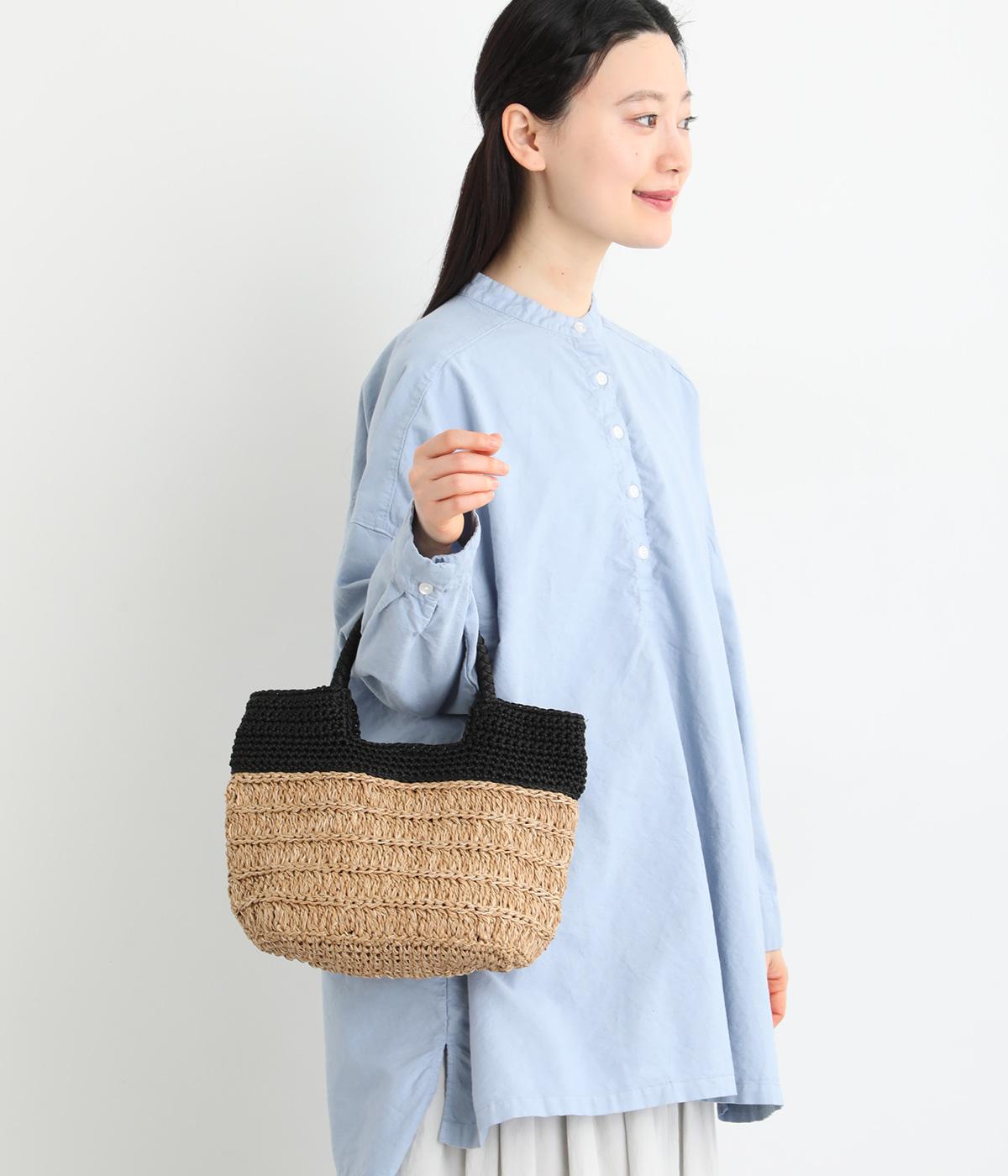 ハンドバッグとしても、ショルダーにもできる2way仕様。柄編みで表情をつけたボディに、配色切り替えでメリハリをつけました。ナチュラルな素材感に、クロッシェならではの立体感が映えます。長財布や500mlボトルが収まるサイズ感で、毎日のコーディネートに取り入れやすいアイテムです。