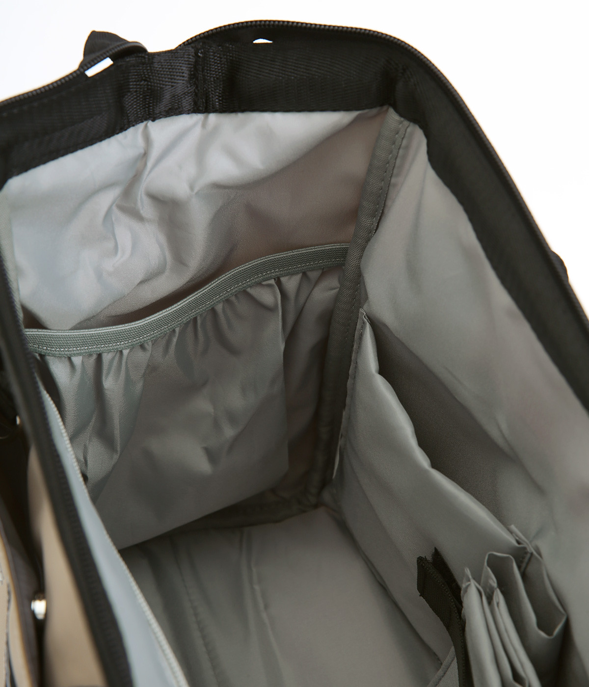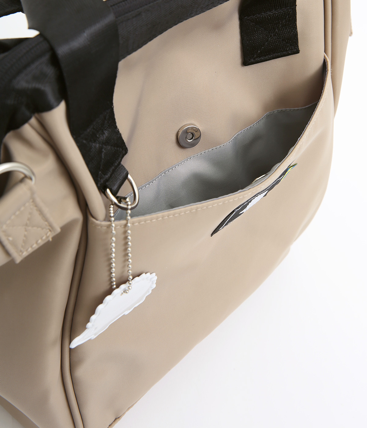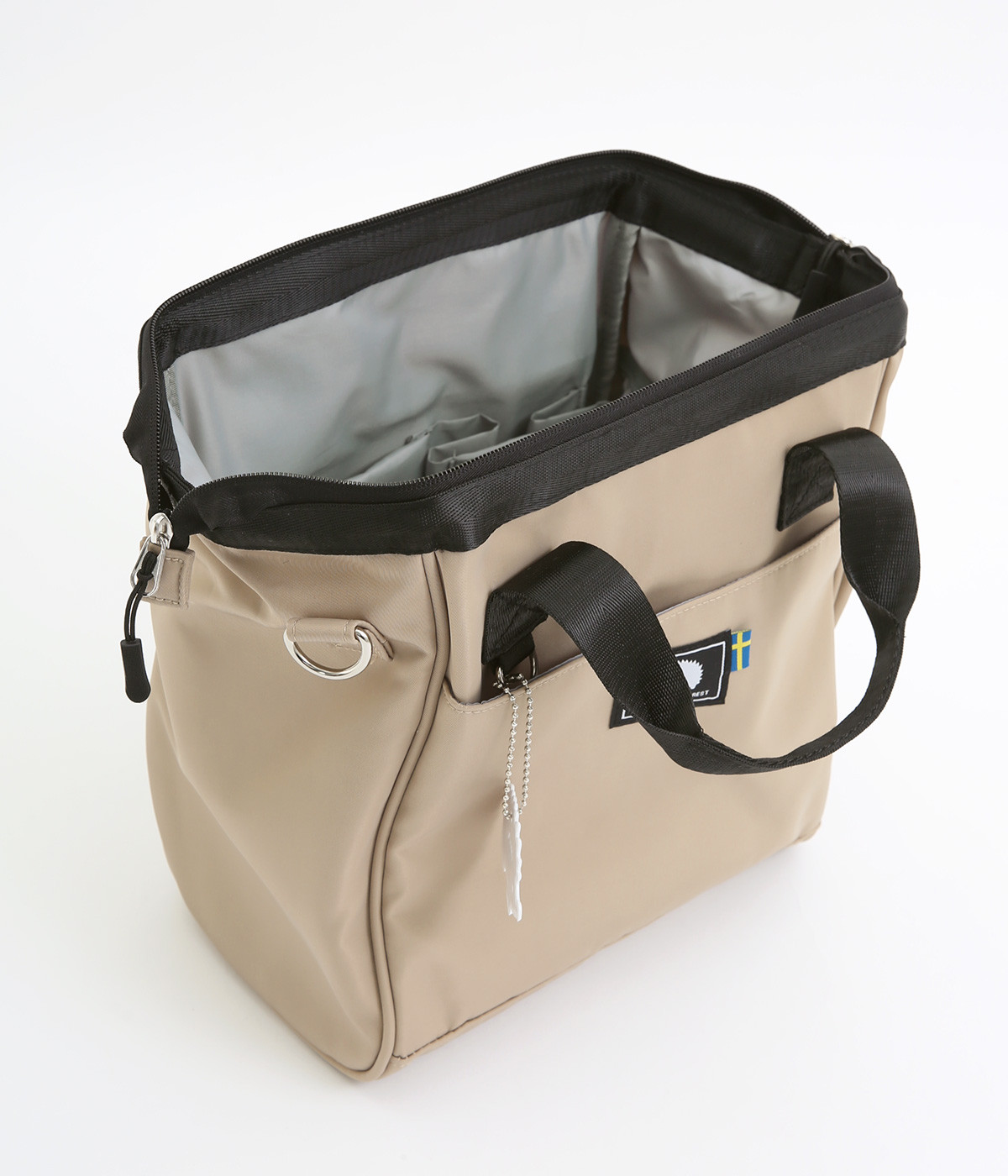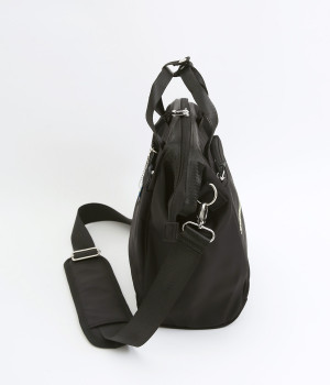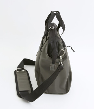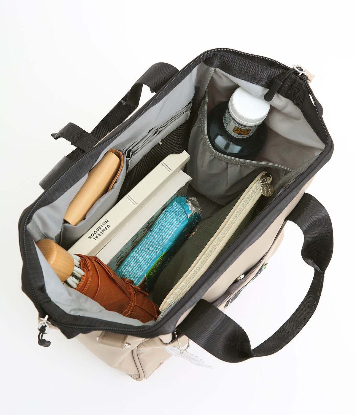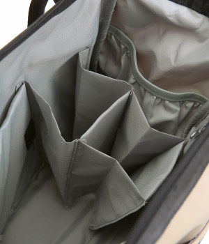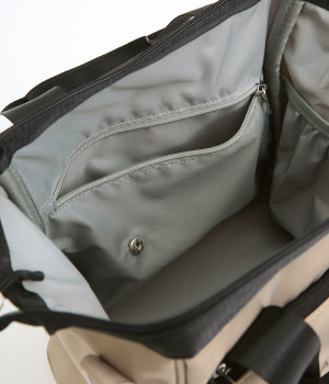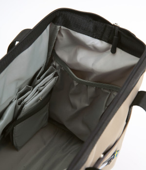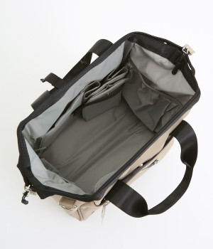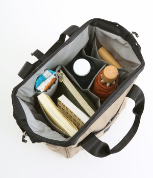 がばっと開いて中身が一目瞭然&物の出し入れもスムーズなバッグです。折り畳みできる仕切りがあるのでペットボトルなどを入れても整理整頓しやすい仕様に。取り外し可能なショルダーベルトは、肩パッドつきで荷物が多い日でも負担を軽減してくれます。