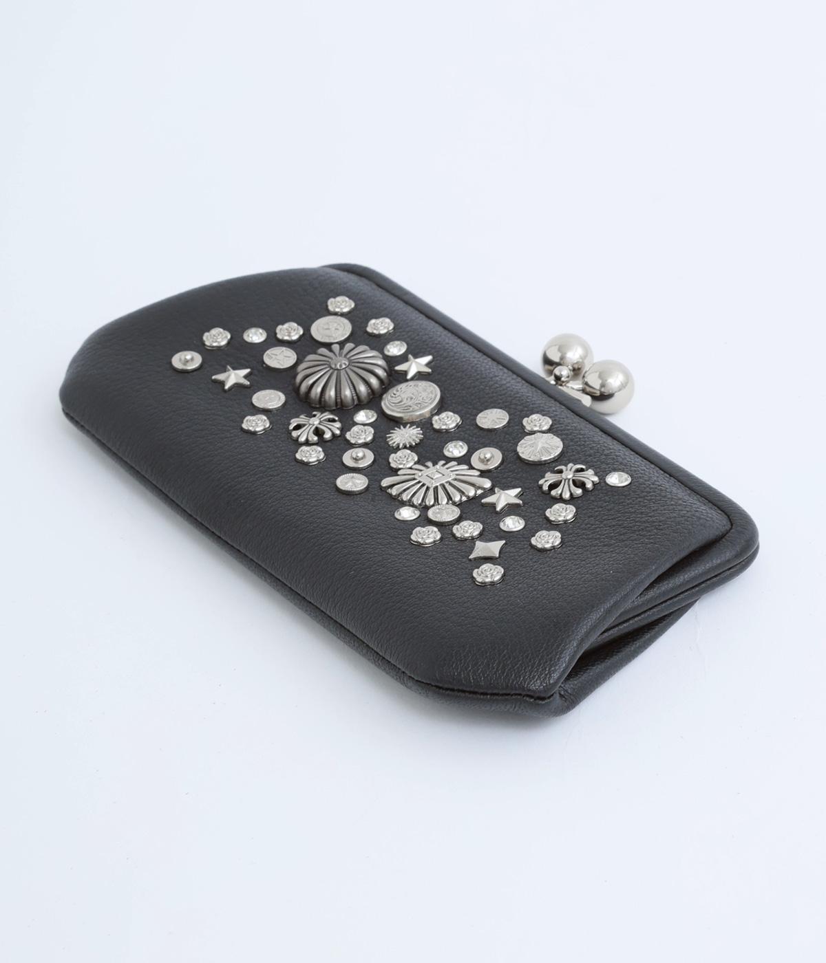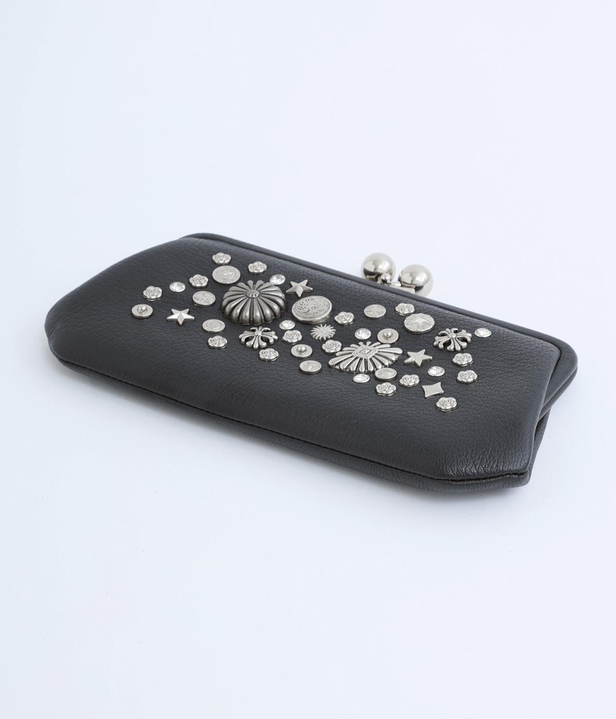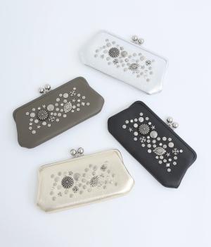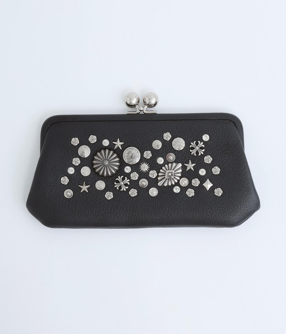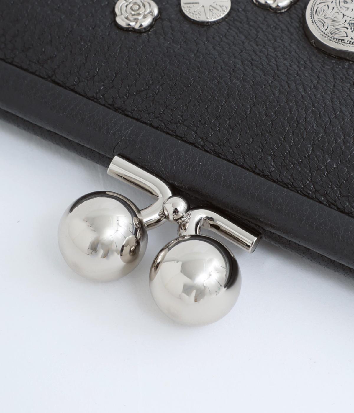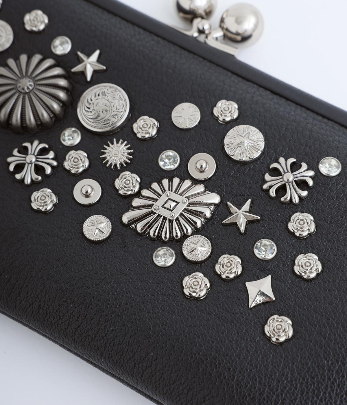 いろいろなサイズや形のスタッズがクールな印象の長財布です。パカっと開くと全体がよく見える使い勝手の良さ。コロンと大きめのがま口の玉や、フリンジ付きのファスナーで開け閉めしやすいのも嬉しいポイントです。