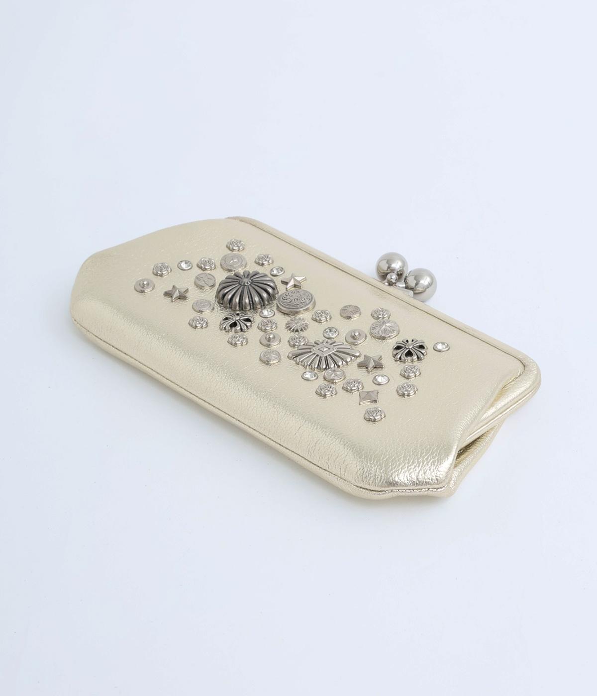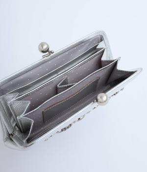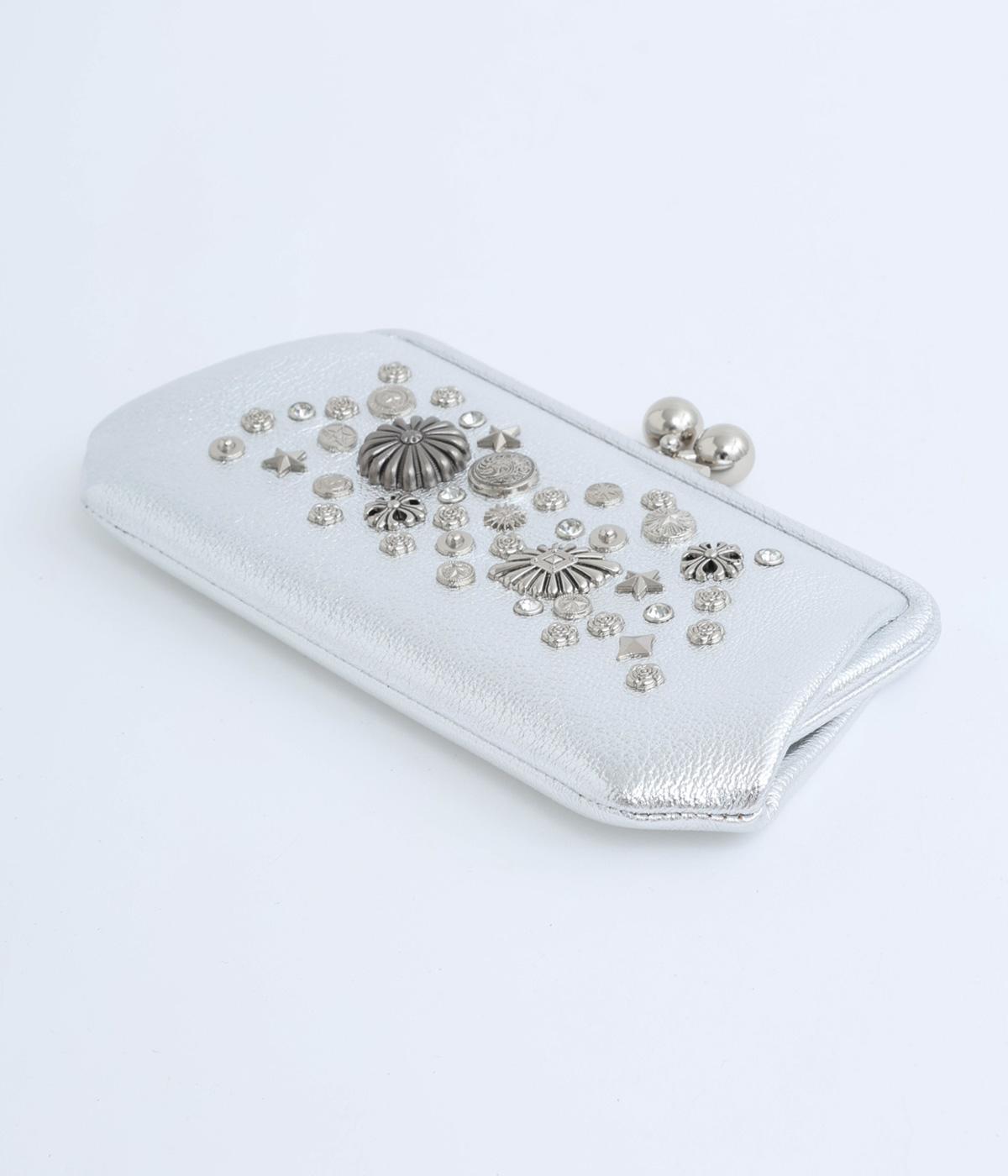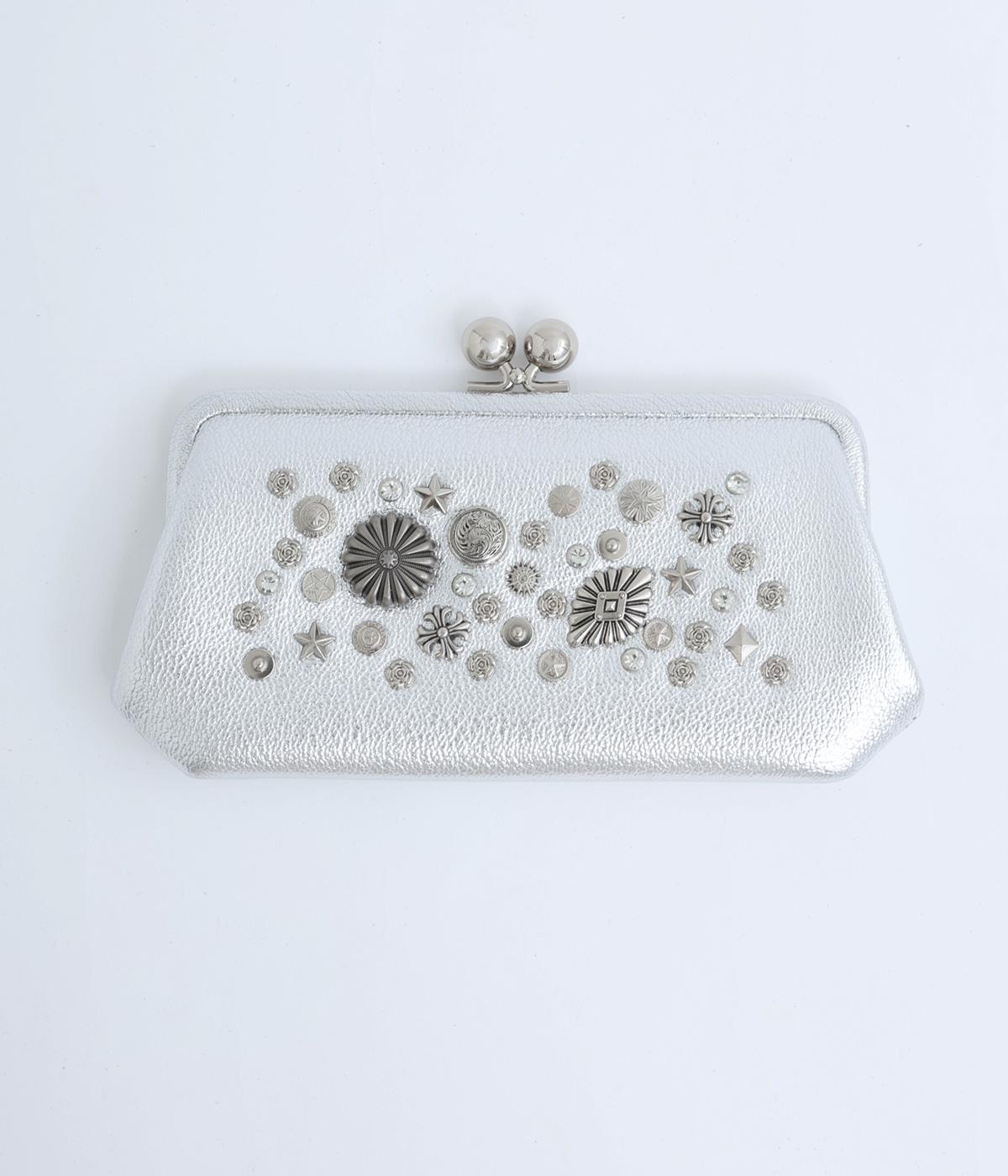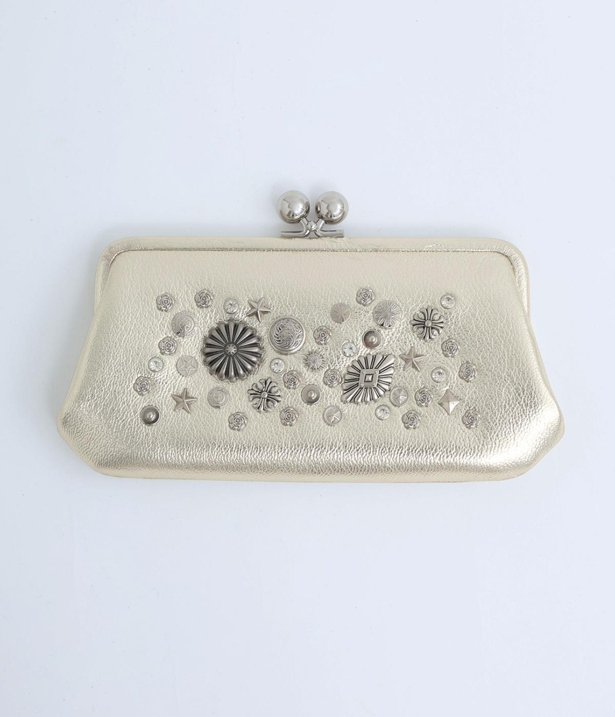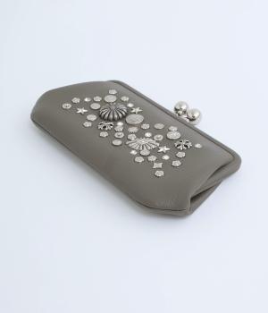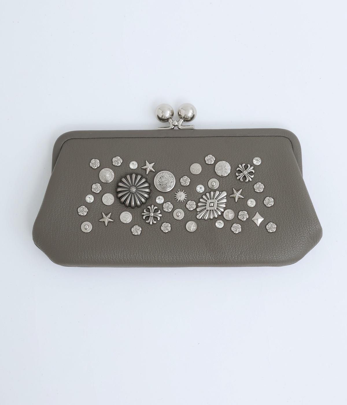 いろいろなサイズや形のスタッズがクールな印象の長財布です。パカっと開くと全体がよく見える使い勝手の良さ。コロンと大きめのがま口の玉や、フリンジ付きのファスナーで開け閉めしやすいのも嬉しいポイントです。