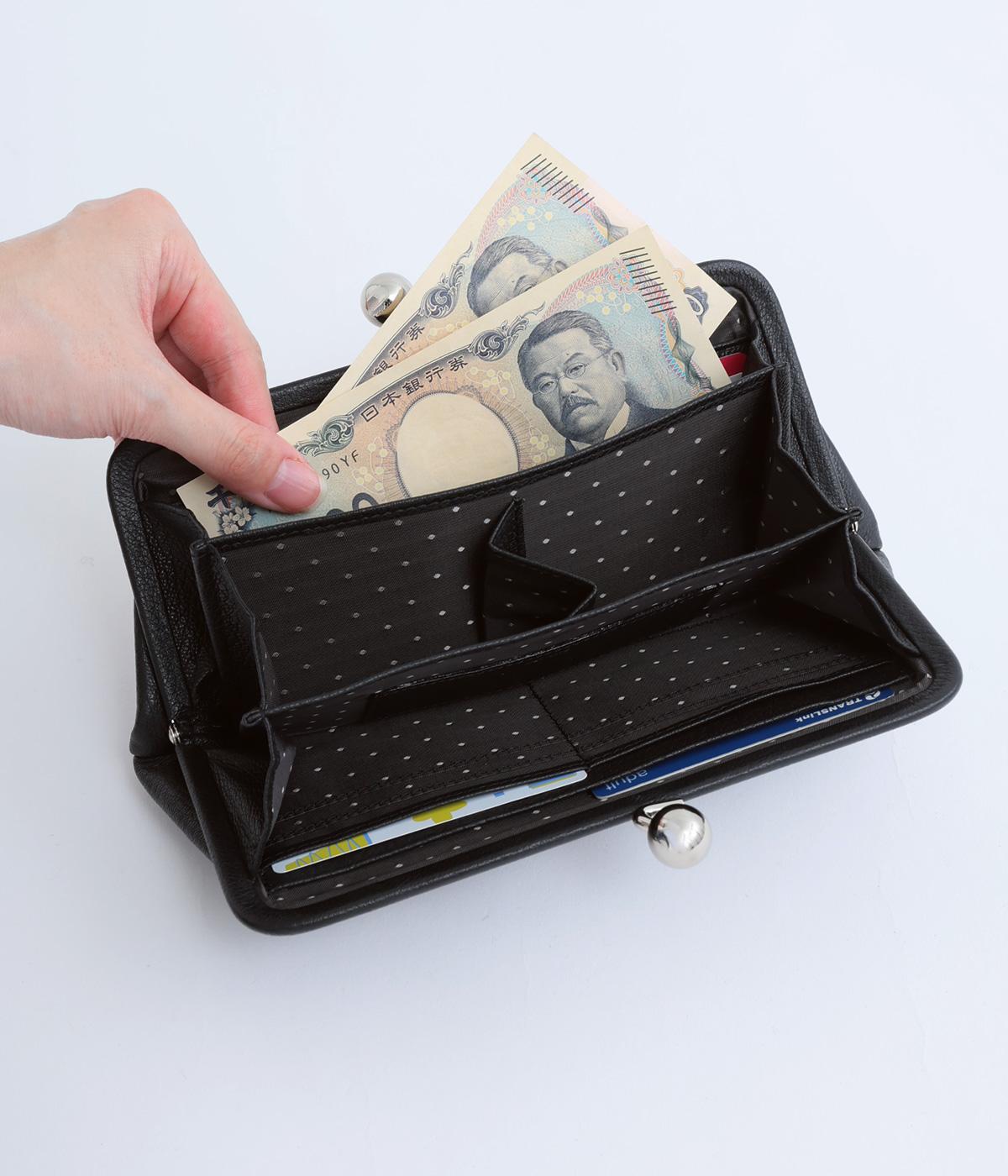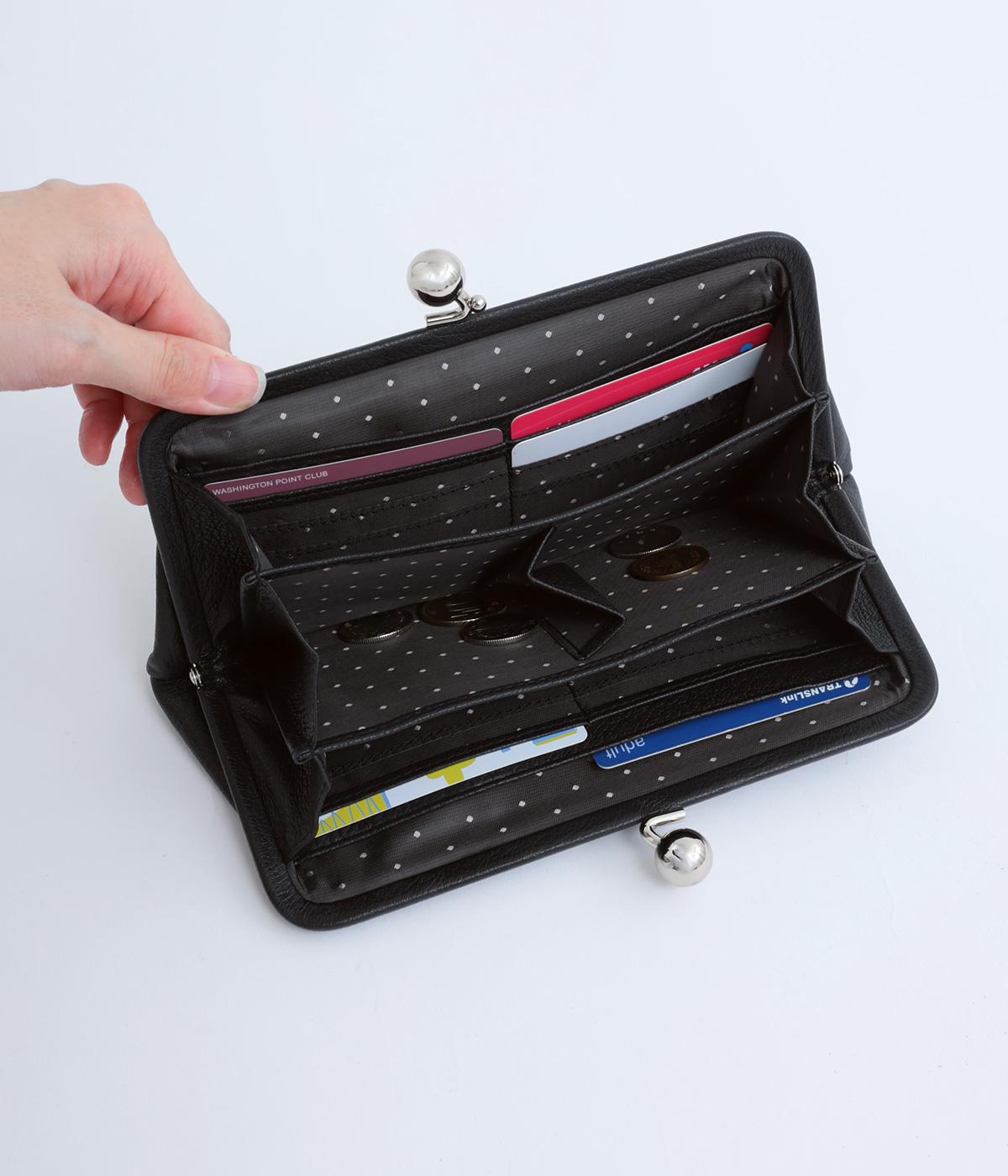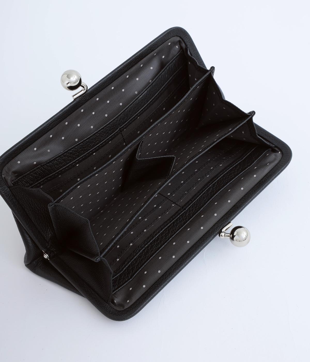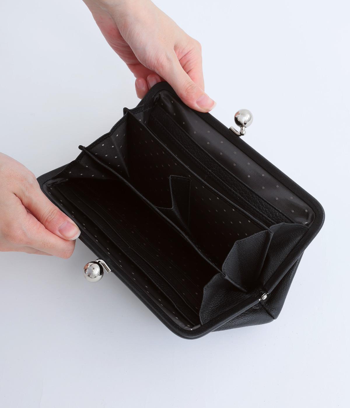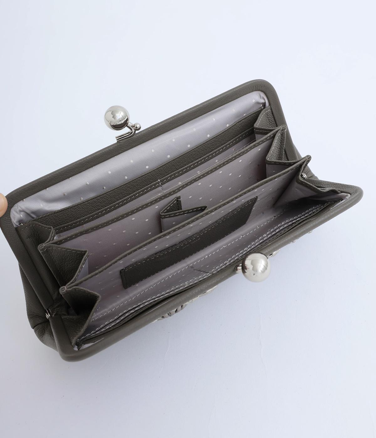 いろいろなサイズや形のスタッズがクールな印象の長財布です。パカっと開くと全体がよく見える使い勝手の良さ。コロンと大きめのがま口の玉や、フリンジ付きのファスナーで開け閉めしやすいのも嬉しいポイントです。