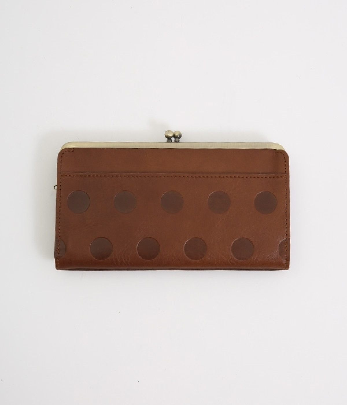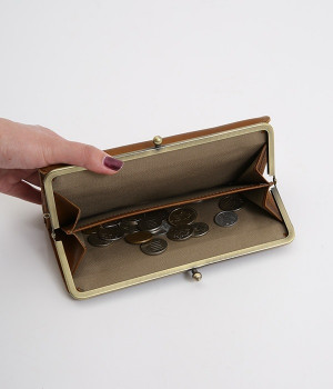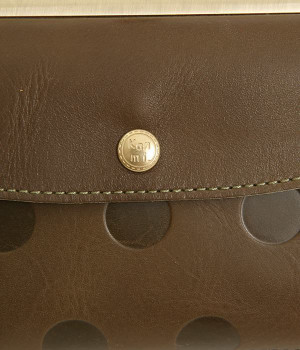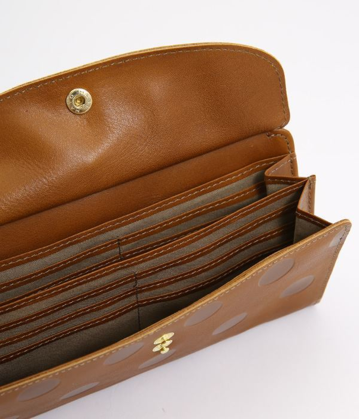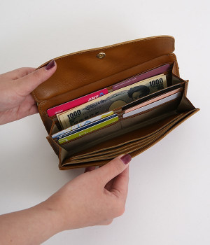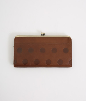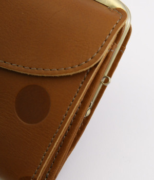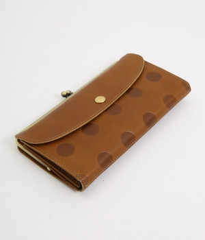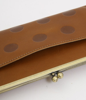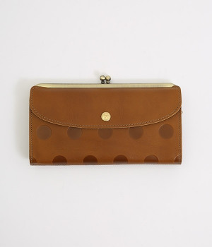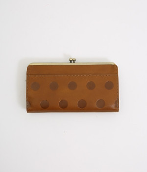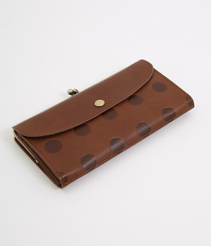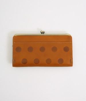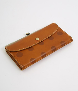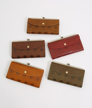 柔らかな手ざわりのカウレザーにかわいらしいドットの型押しを施したロングウォレットです。がま口部分は仕切りつき。ポケット部分は開閉部のボタンが厚さによって二段階調節がOK。たっぷりいれても大丈夫な安心設計です。中にはお札を入れやすいロングサイズのポケットが4つ、カードサイズのポケットが6つあり。