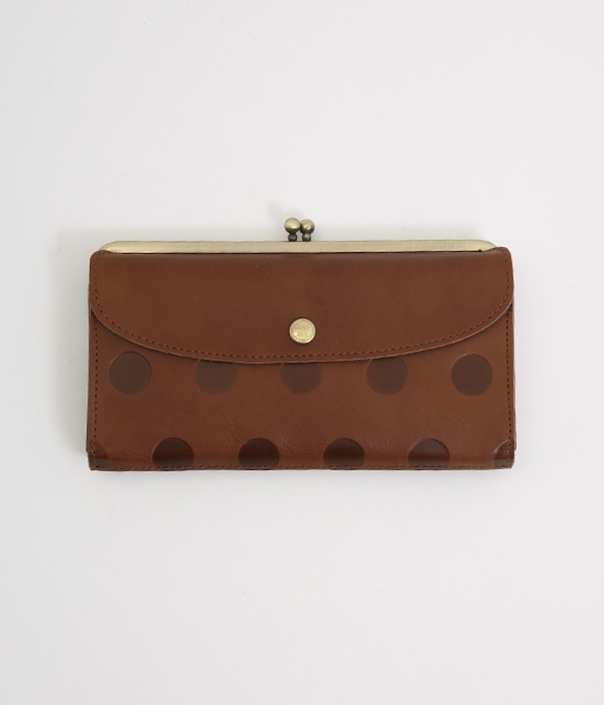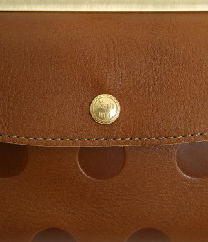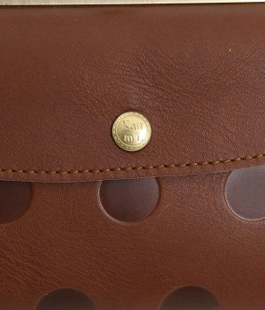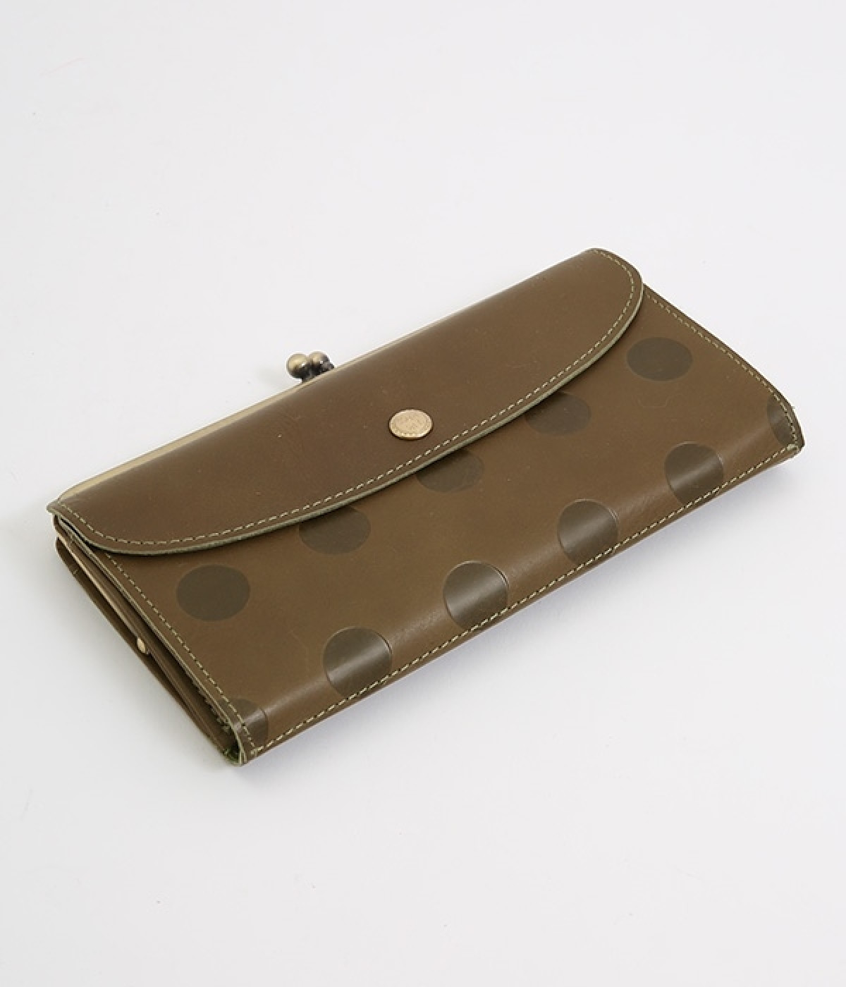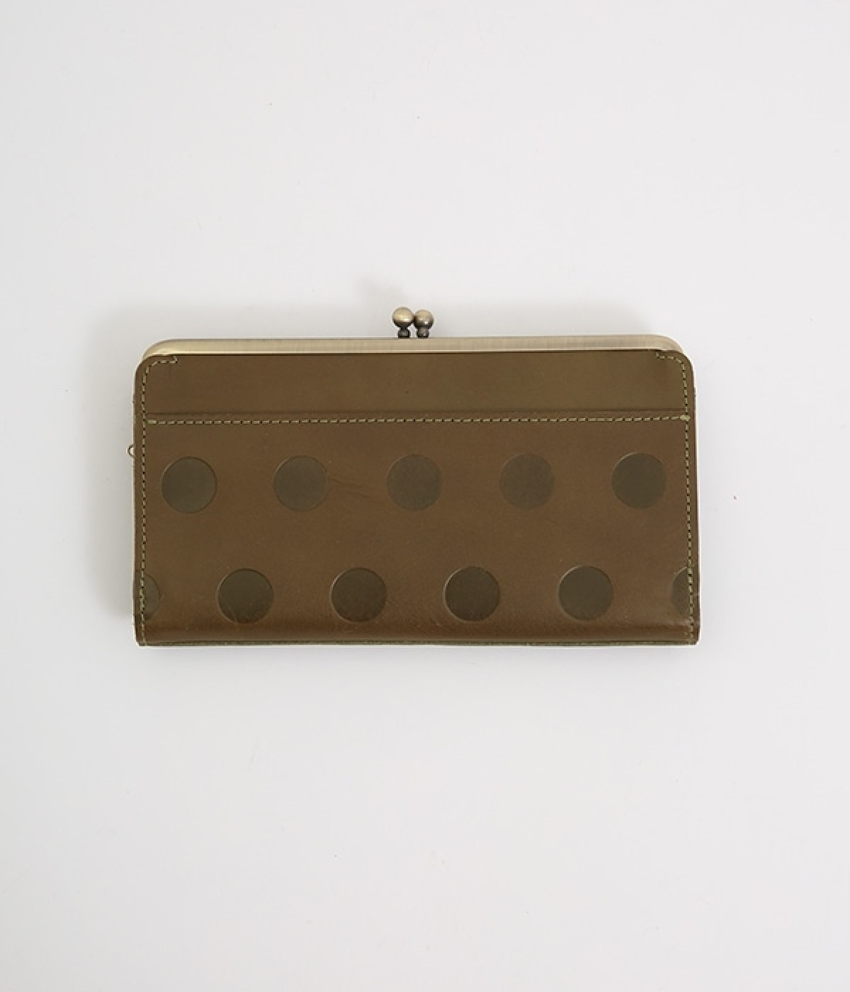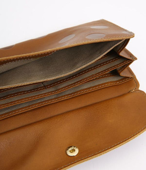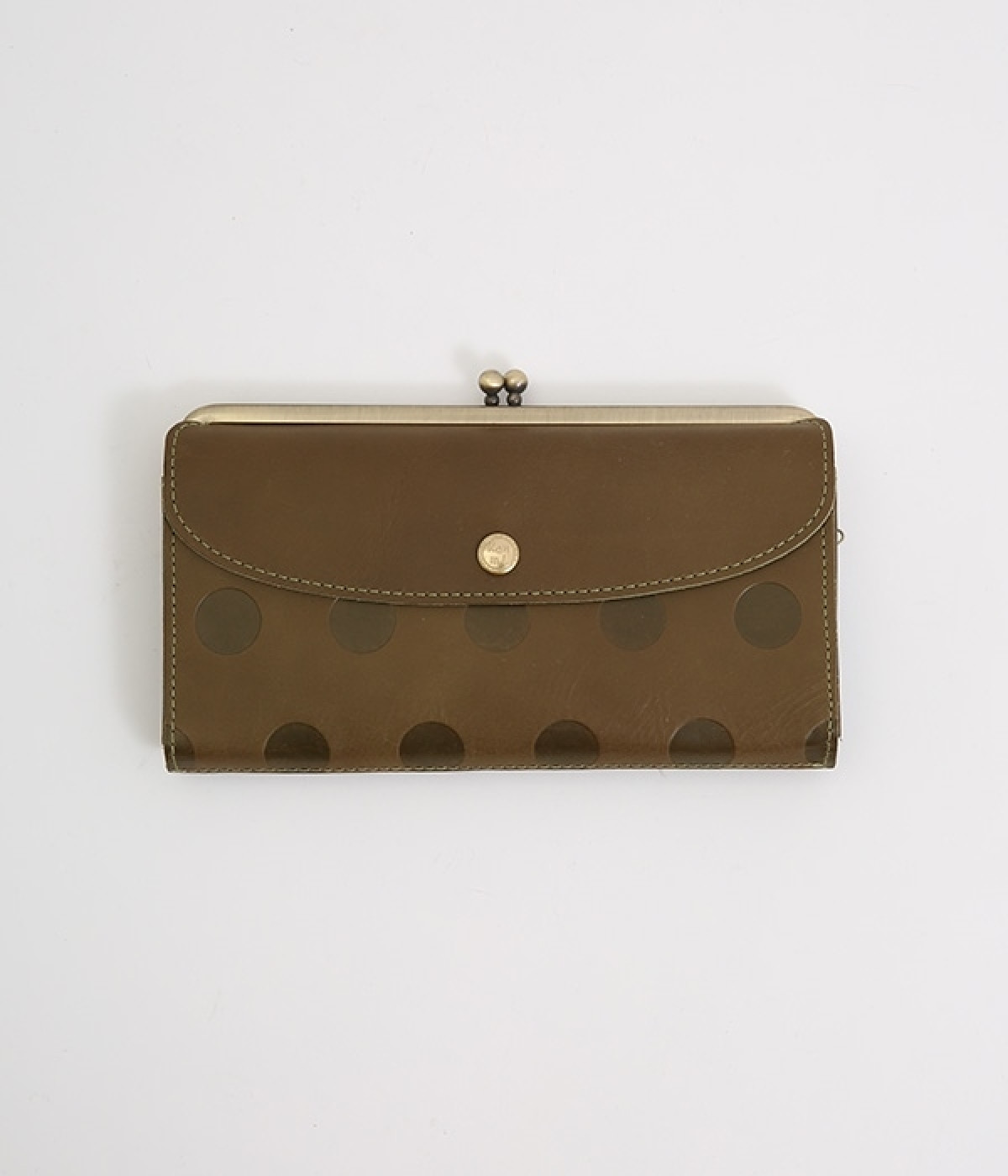 柔らかな手ざわりのカウレザーにかわいらしいドットの型押しを施したロングウォレットです。がま口部分は仕切りつき。ポケット部分は開閉部のボタンが厚さによって二段階調節がOK。たっぷりいれても大丈夫な安心設計です。中にはお札を入れやすいロングサイズのポケットが4つ、カードサイズのポケットが6つあり。