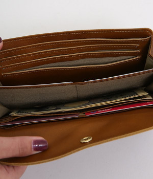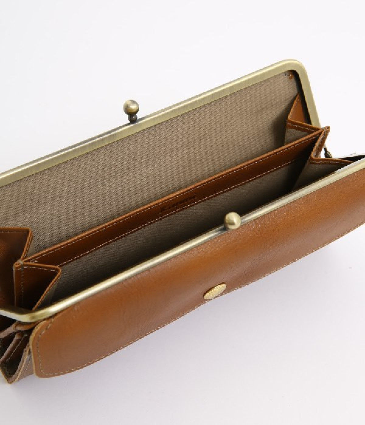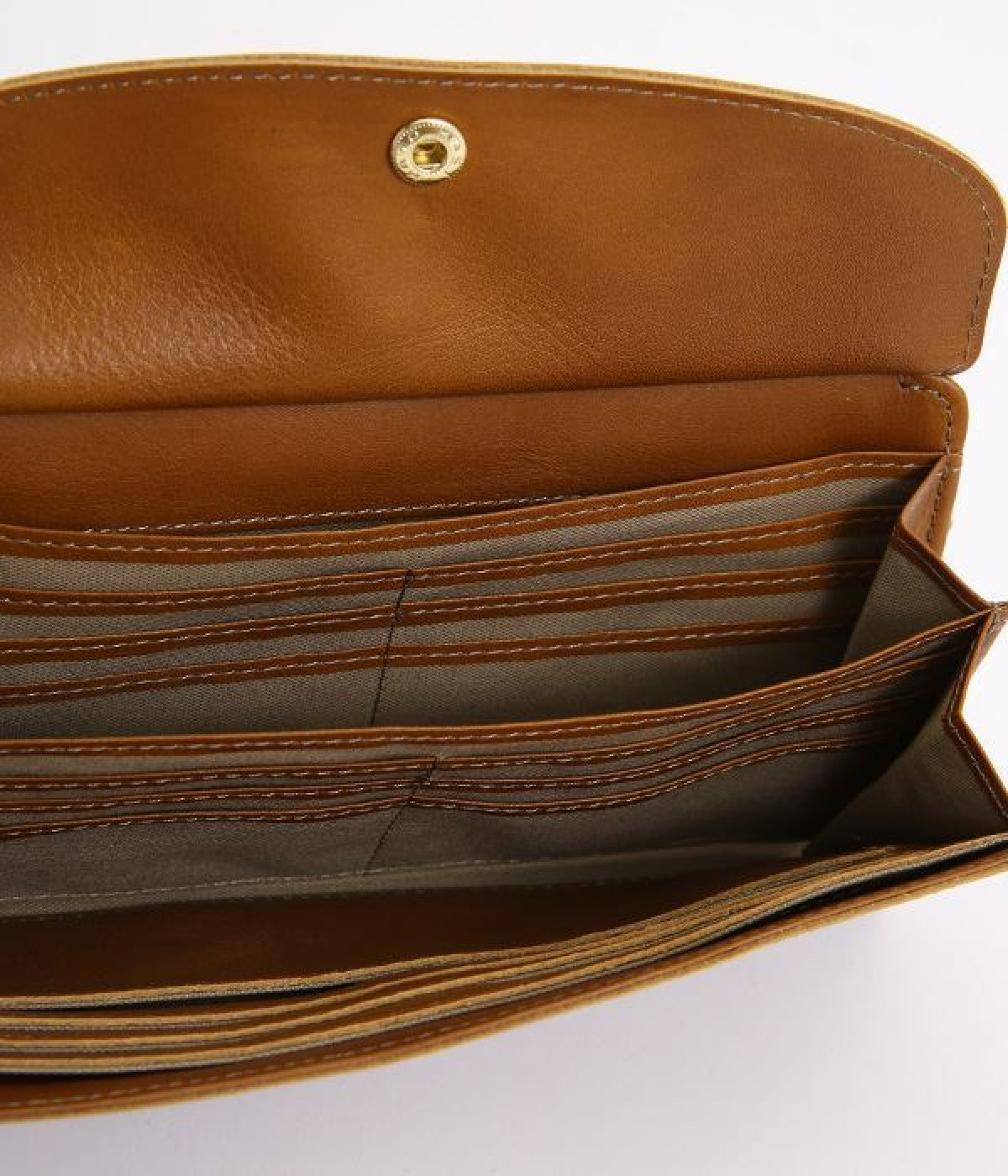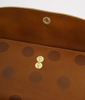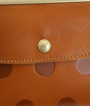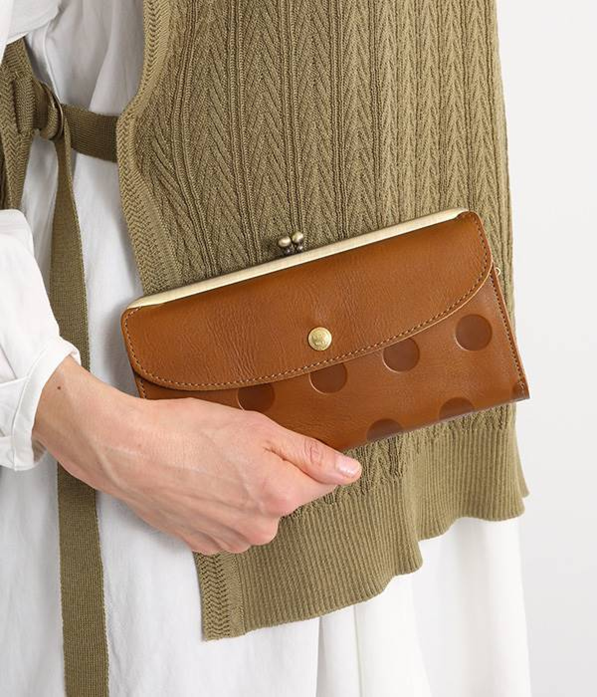 柔らかな手ざわりのカウレザーにかわいらしいドットの型押しを施したロングウォレットです。がま口部分は仕切りつき。ポケット部分は開閉部のボタンが厚さによって二段階調節がOK。たっぷりいれても大丈夫な安心設計です。中にはお札を入れやすいロングサイズのポケットが4つ、カードサイズのポケットが6つあり。