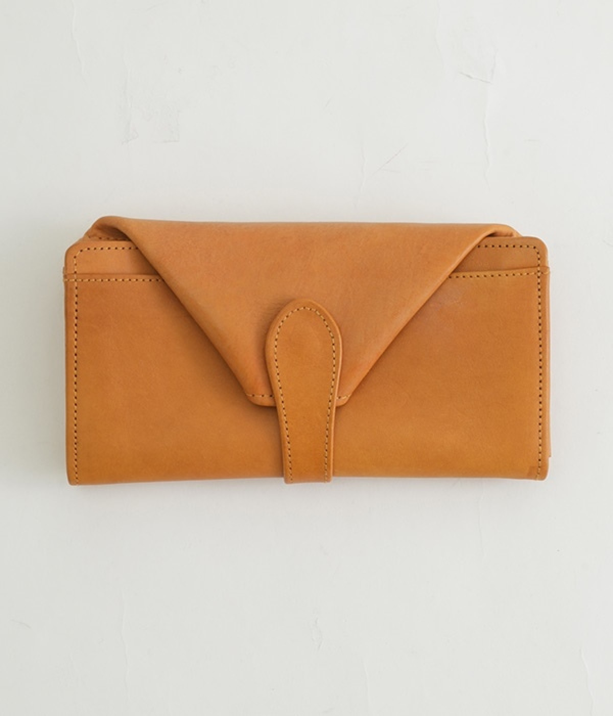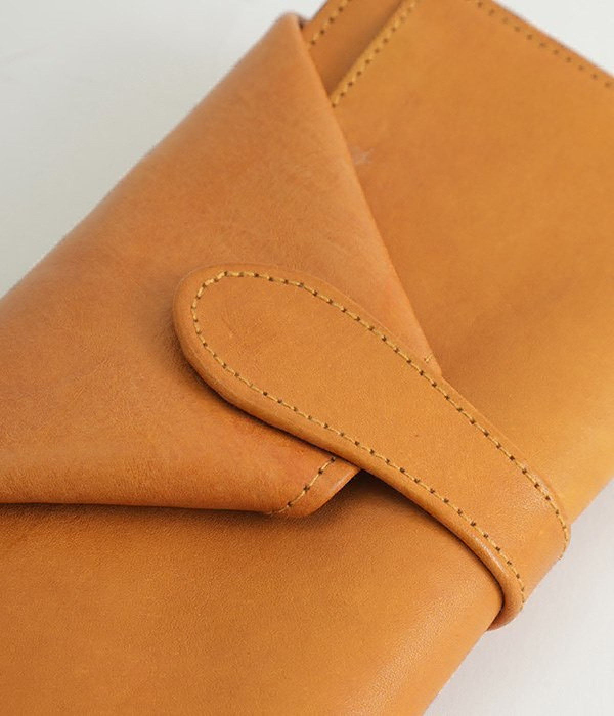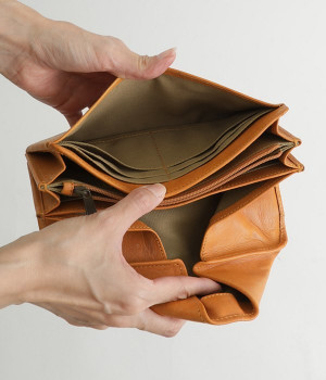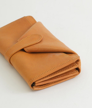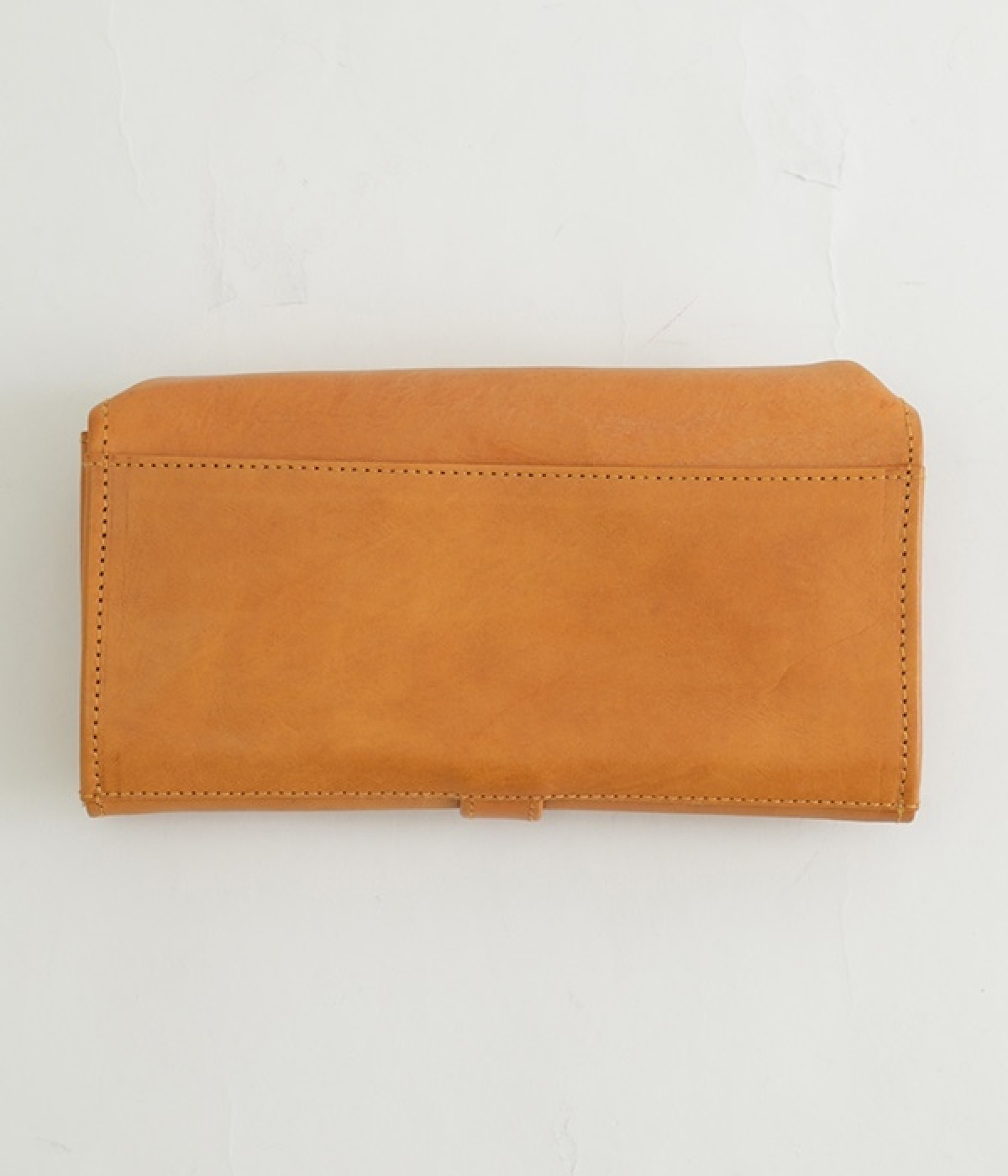 1枚ずつ手で染めては、天日で乾かすなどの工程を何度も繰り返して仕上げたヌメ革を使用した長財布です。そもそもヌメ革は、タンニン(植物の渋)でなめし、人工的に染料や塗料で仕上げないナチュラルレザーのこと。傷やなめしムラなどの失敗を染料で隠せないので、なめす前の原皮から、良い素材が使われているこだわりようです。ナチュラルでいて上質感があり、暖かな手触りをもつ革らしい革です。