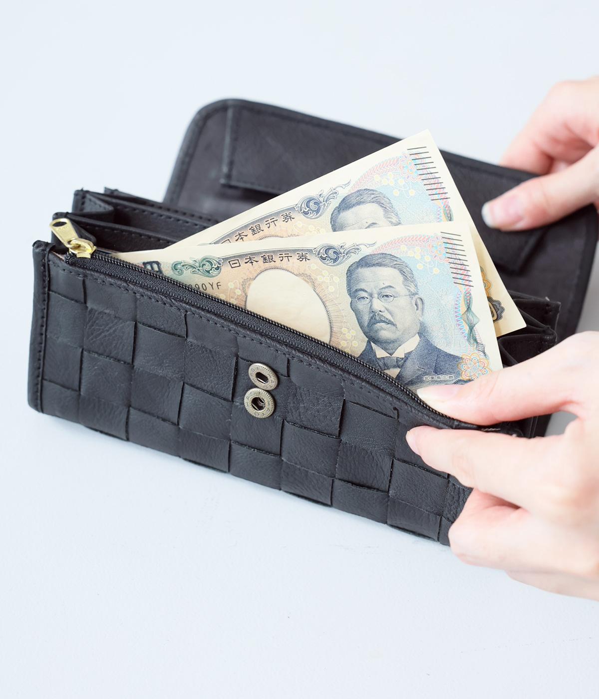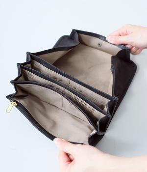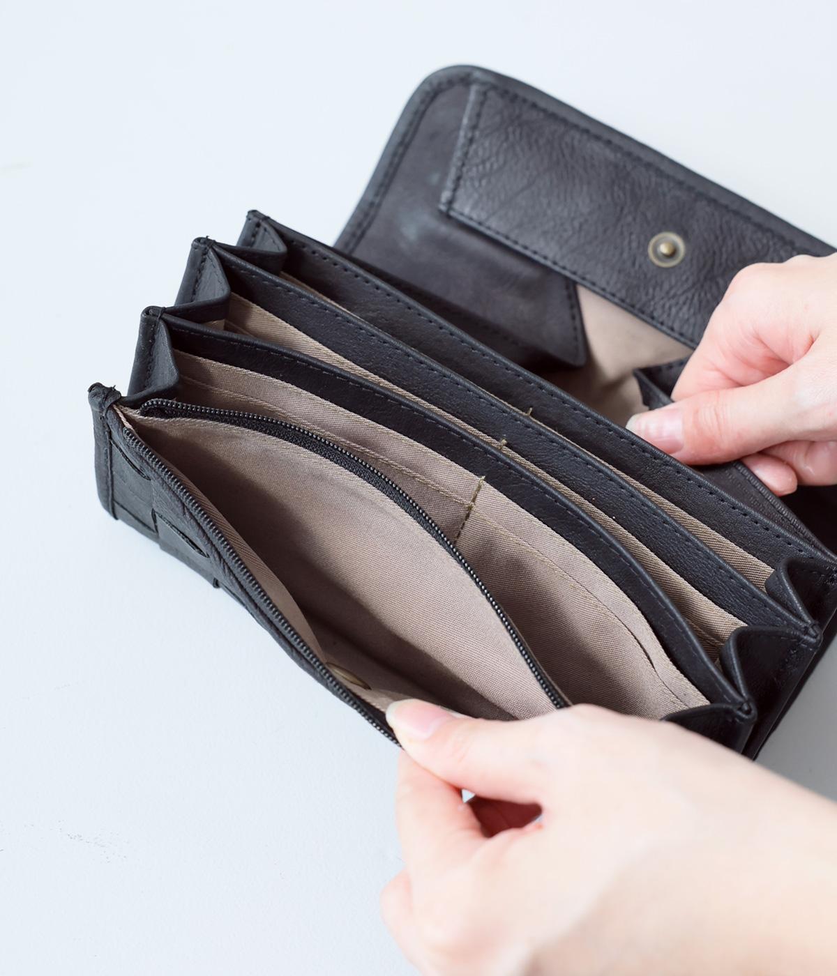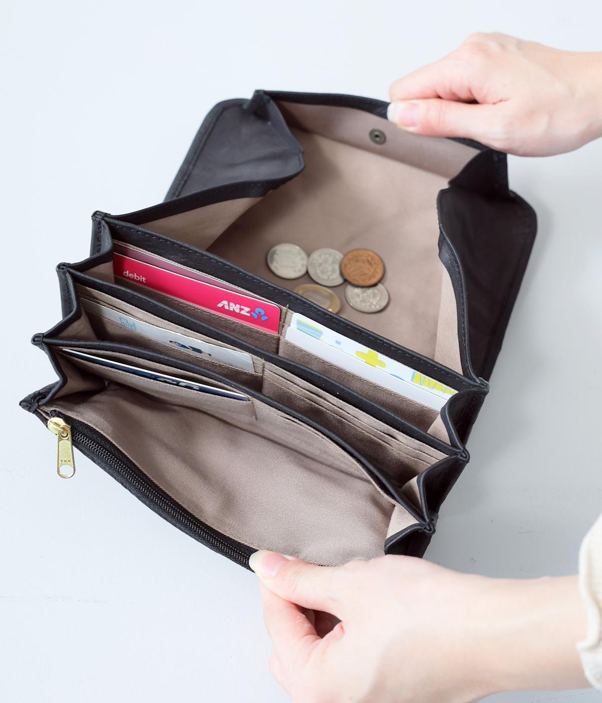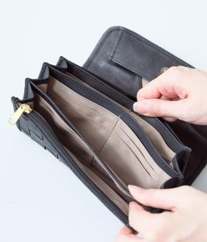 小銭部分が大きく開くギャルソンタイプの長財布。カードスロットは充実の16ヵ所、ほかにお札やレシート入れとしても自由に使える収納スペースを4つ完備。ファスナーポケットもついて抜群の収納力と取り出しやすさが魅力です。