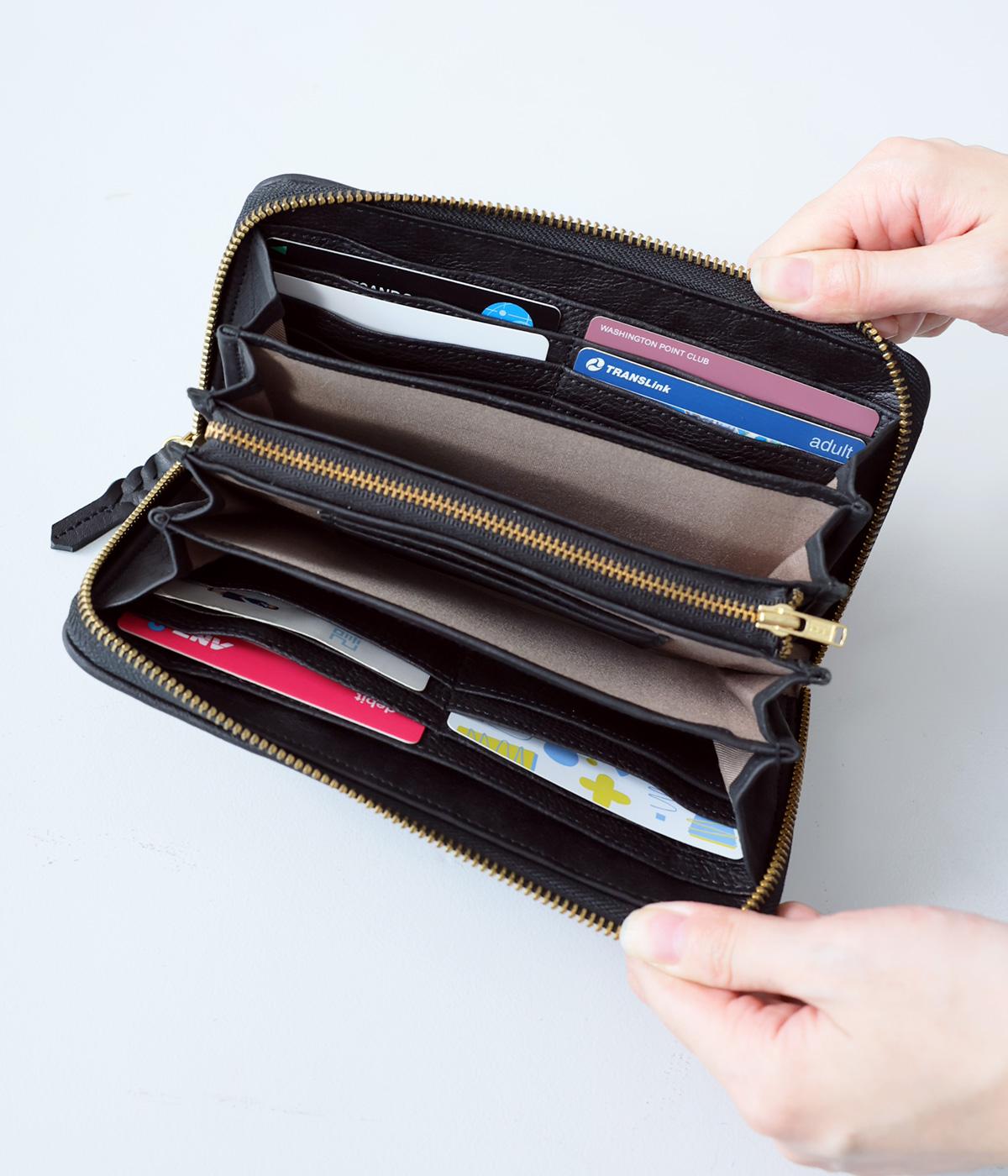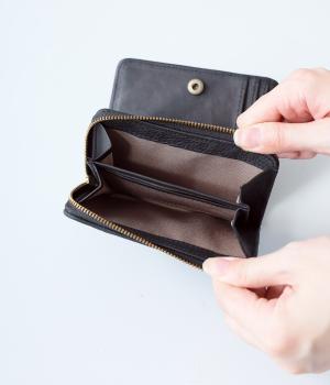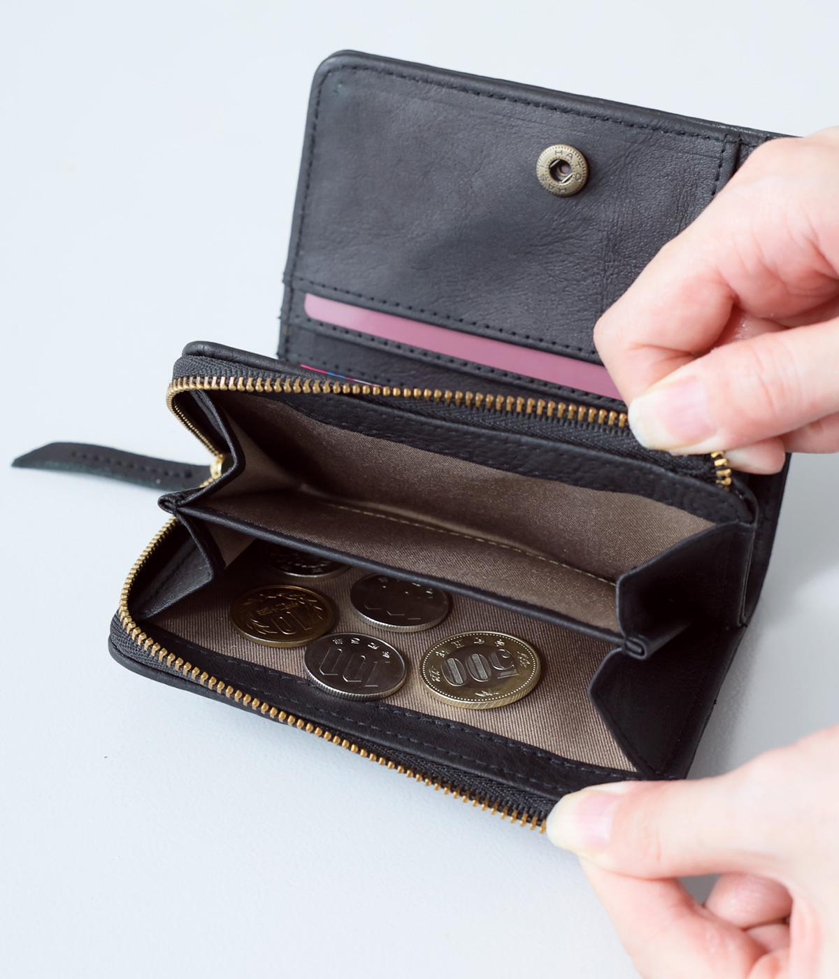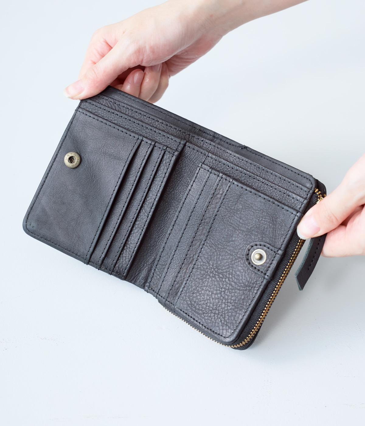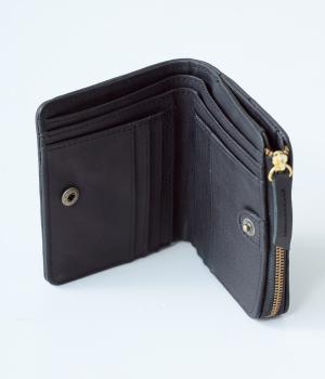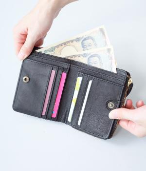 落ち着いた雰囲気の二つ折財布。コンパクトで薄いので、小さめのバッグにも入れやすいサイズです。カードスロットは全部で10ヵ所。お札を入れるスペースのほか、小銭を収納できるファスナーポケットもついています。