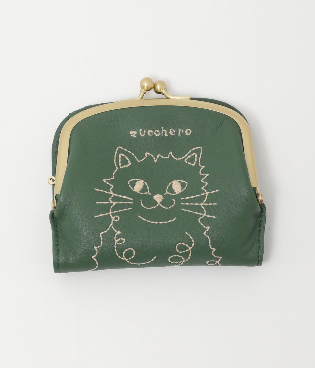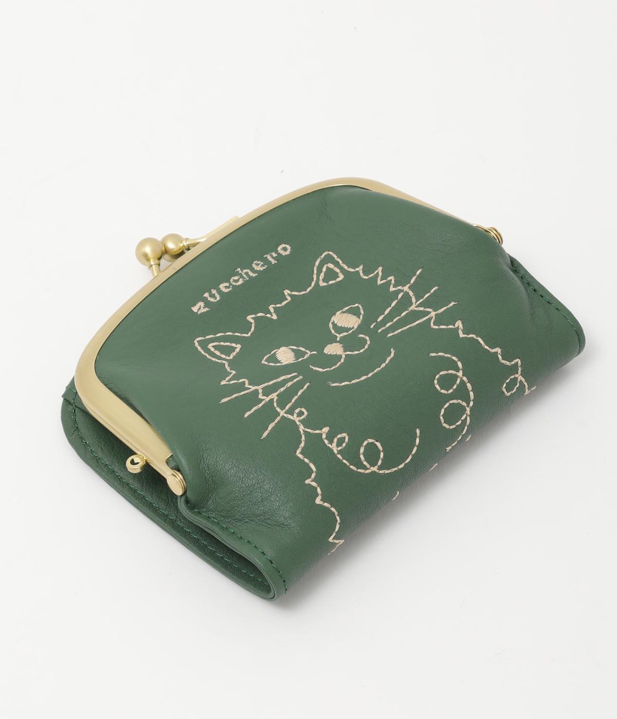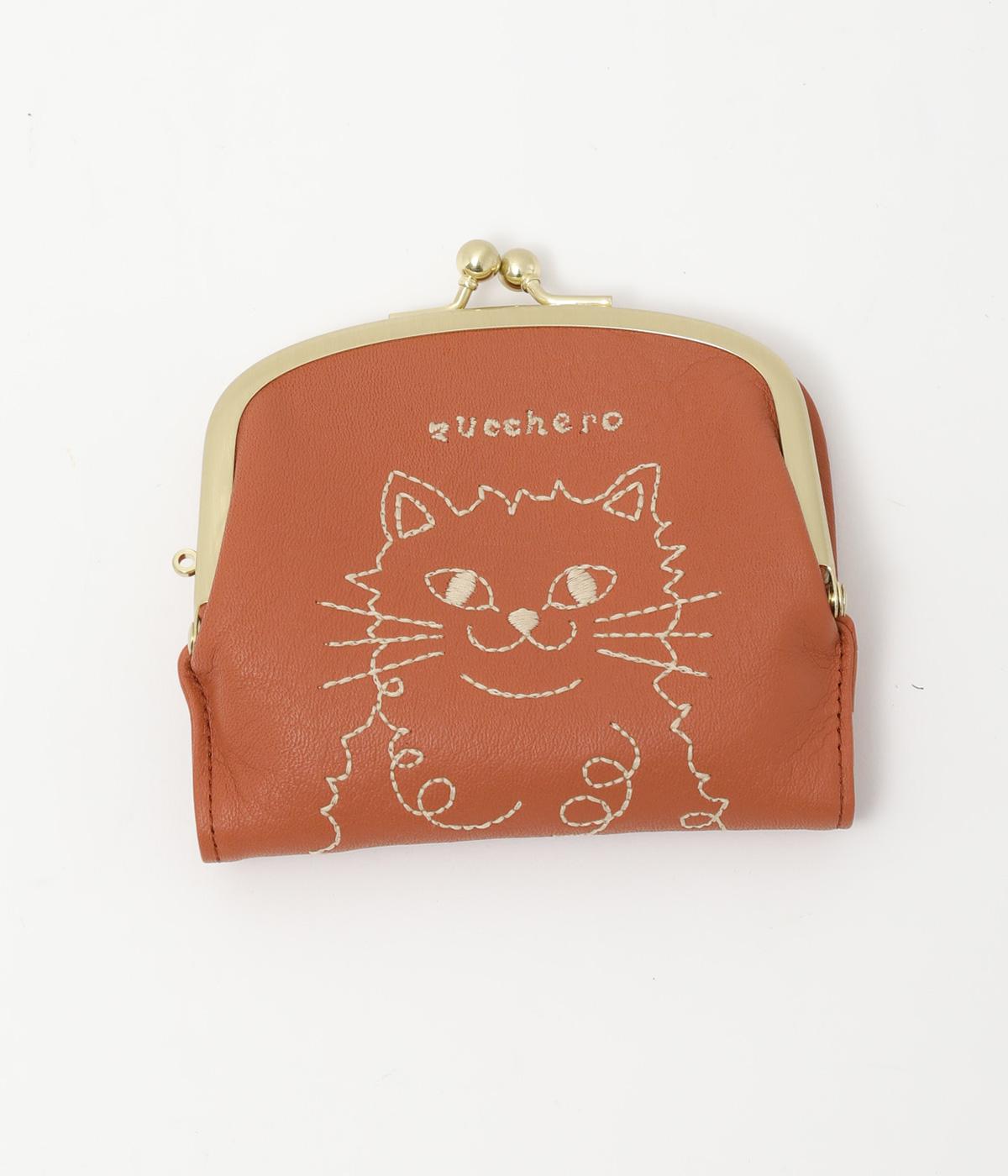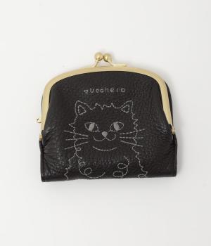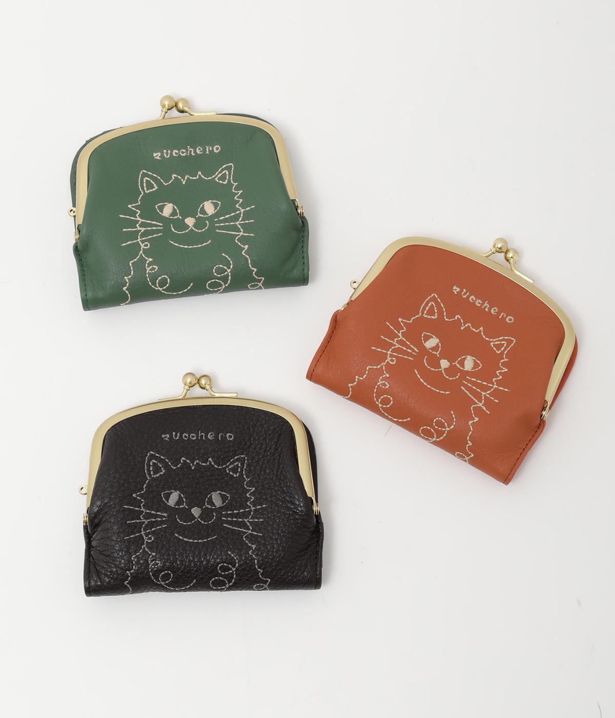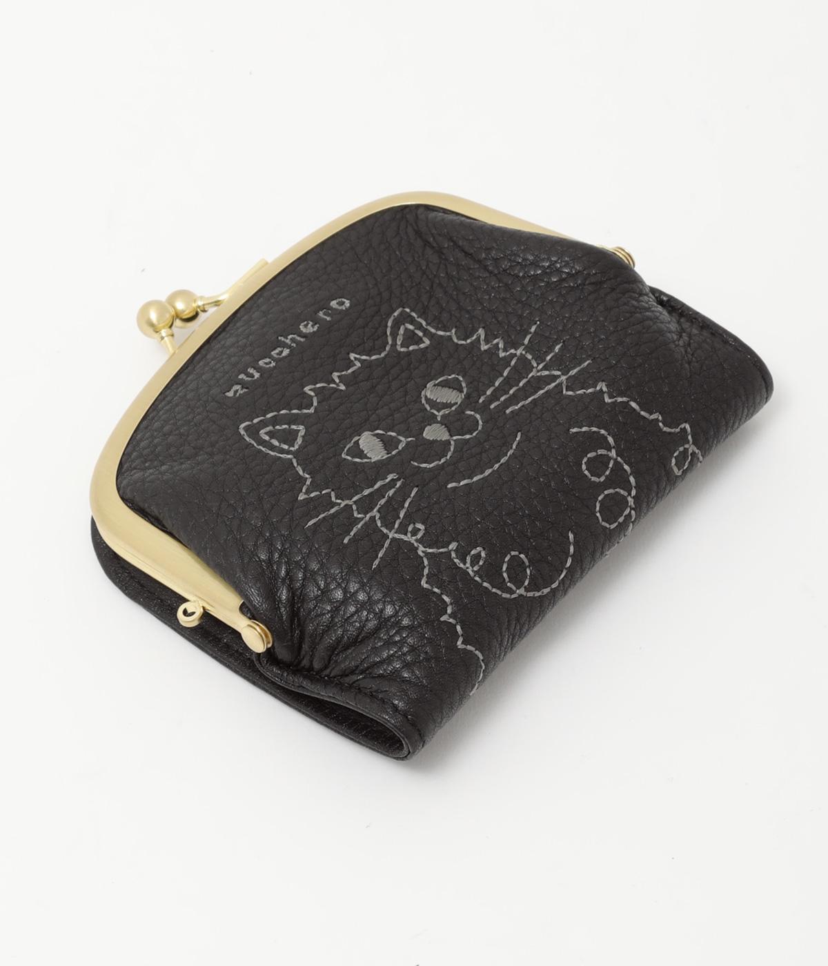 カーリーヘアの愛らしい猫の刺しゅうをほどこしました。背面までマルっと全身を刺しゅうで描かれたネコがとても可愛らしくデザインされています。ホックには日本の老舗金具メーカーのクラウンホックを使用し使い心地抜群です。
