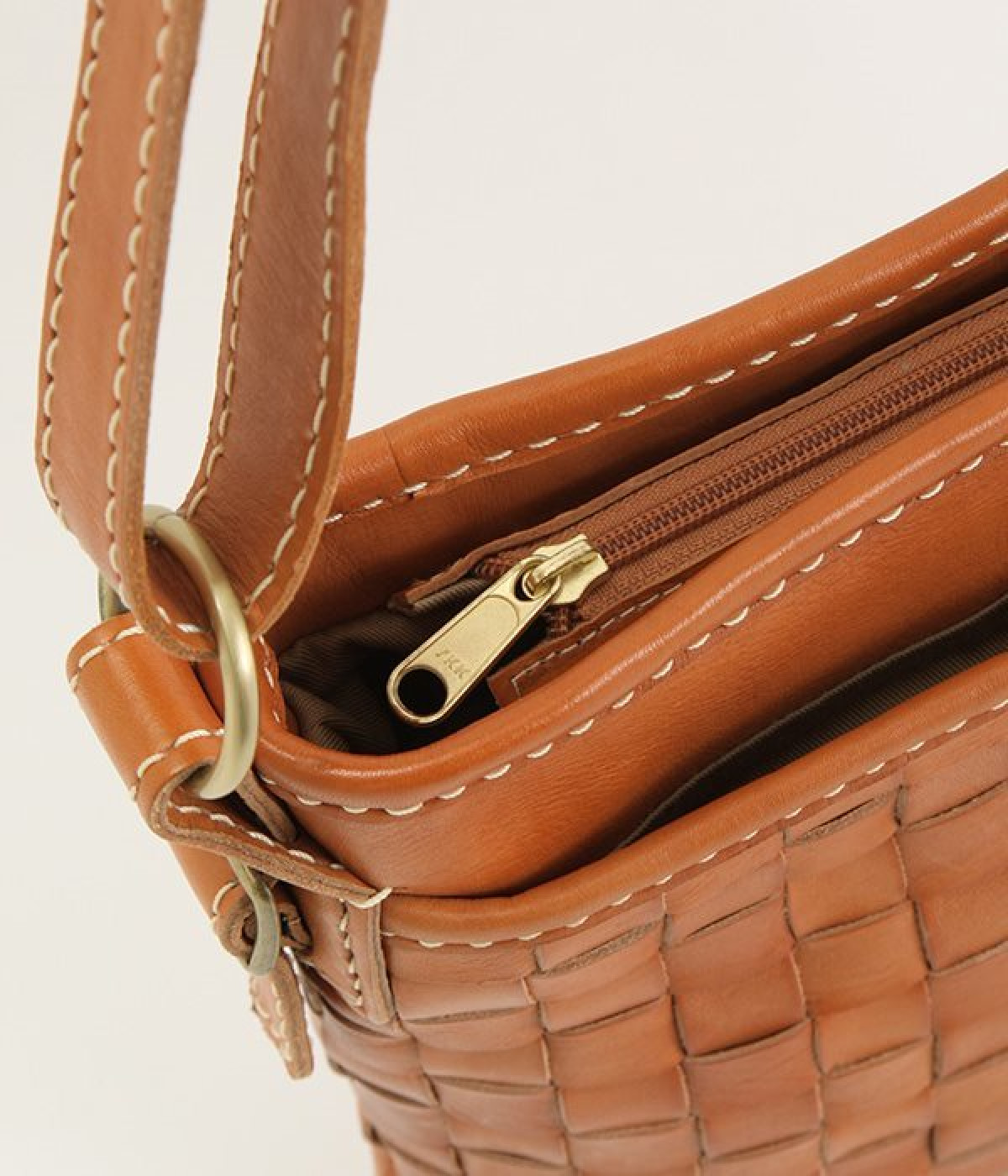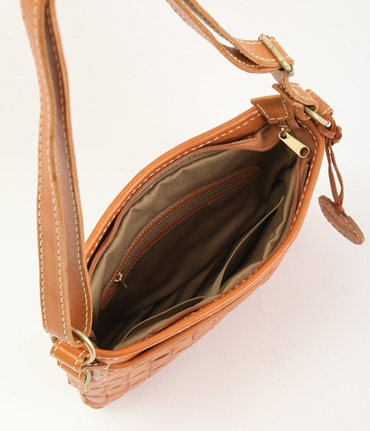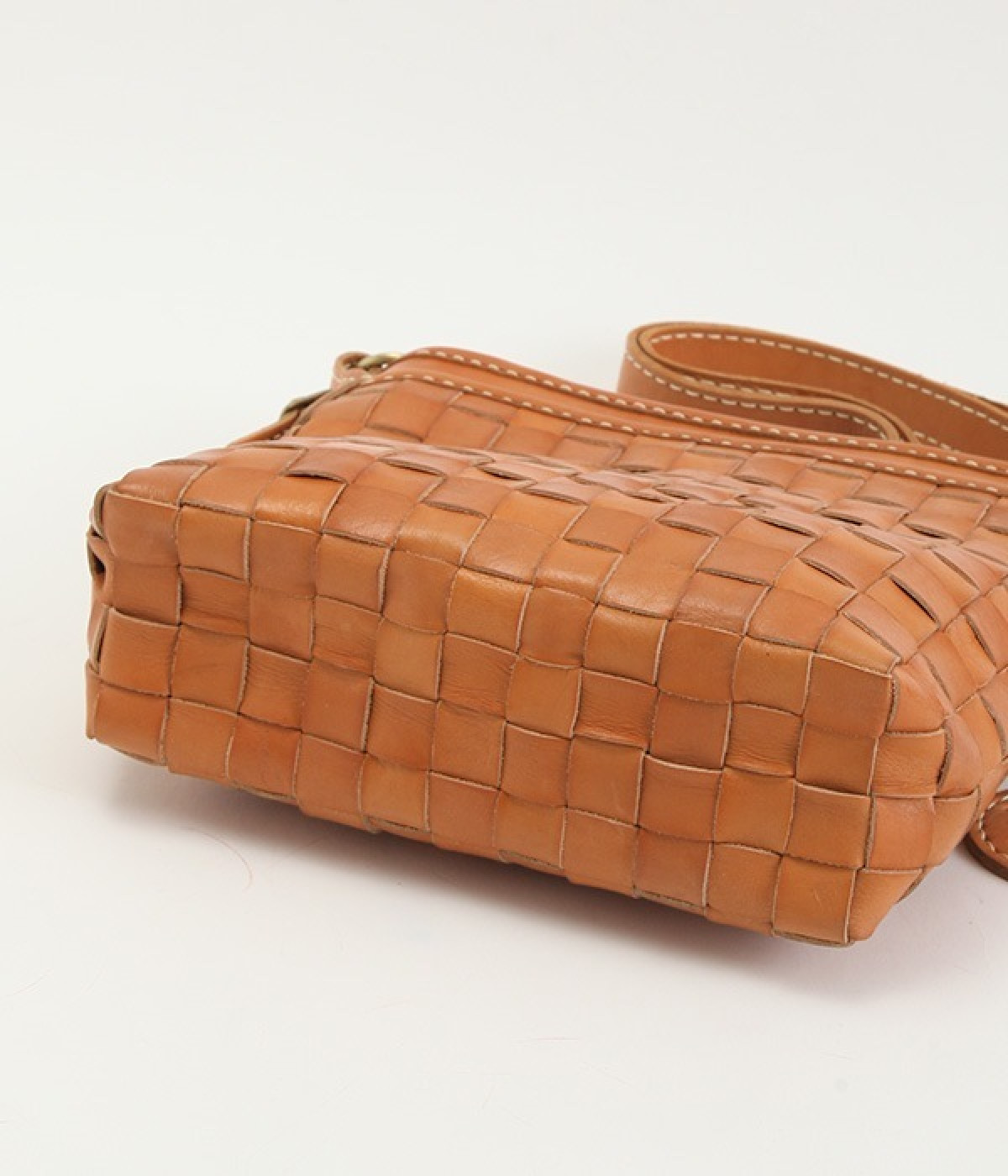 しっかりとしたハリのあるカウレザーを使用したメッシュのショルダーバッグ。職人の手によってメッシュを格子状に1本1本手編みして縫製しています。レザー本来持っている、色の濃淡が使い込むほどに風合いとしてソフトになり、持つ人に馴染んでくるので愛着が湧いてきます。また、外側にも内側にもポケットが付いているので生理整頓して使うことができます。