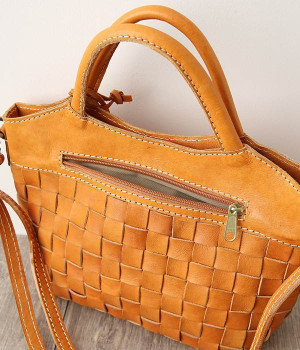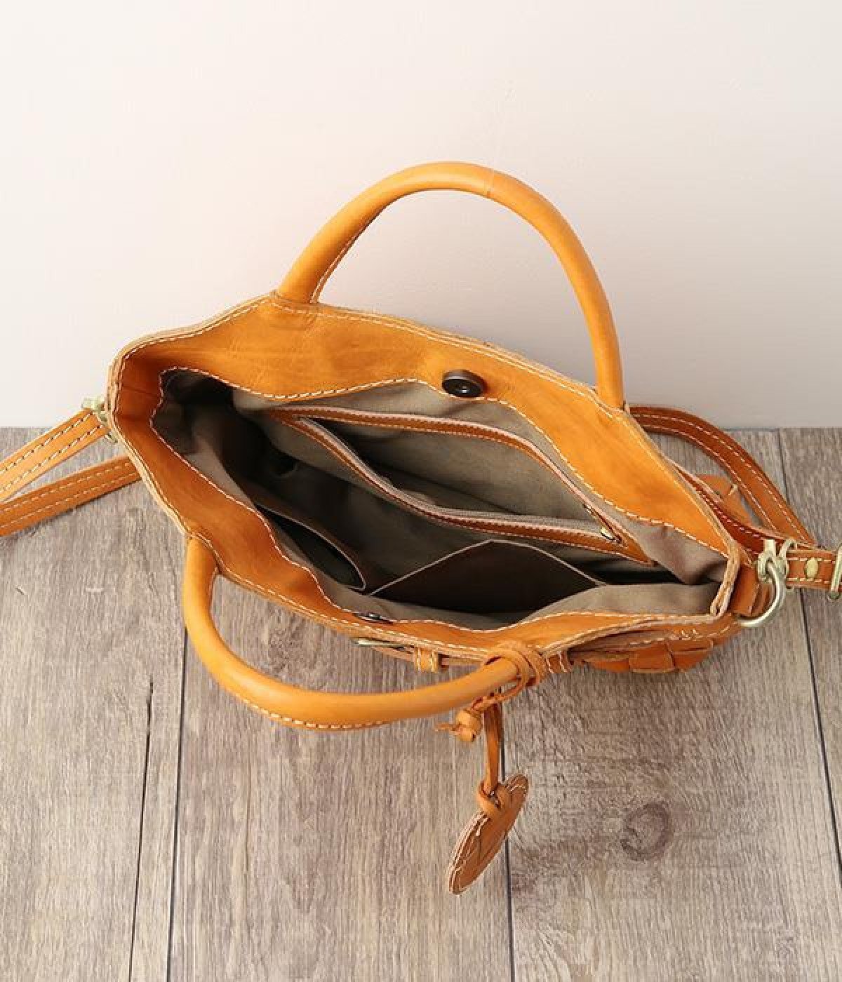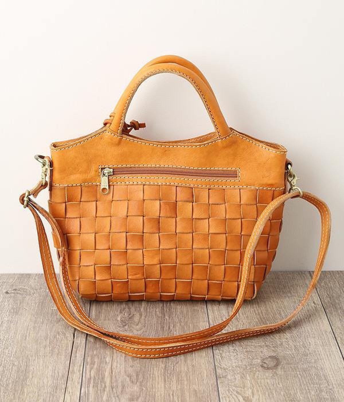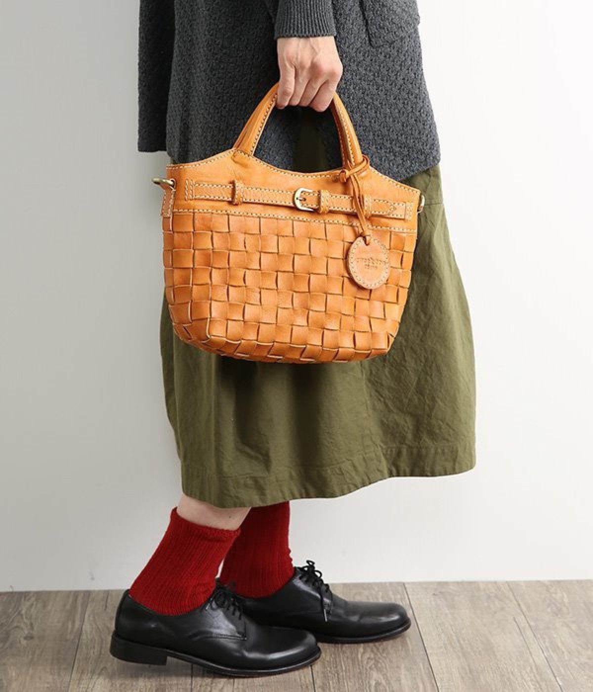しっかりとした質感と柔らかさとを併せ持った、革の魅力が詰まったハンドバッグです。一枚ずつ手で染めては天日で乾かすなどの工程を何度も繰り返して仕上げられたカウレザーを、メッシュ状にして一本一本手編みで作られた、手の込んだバッグです。使うほどに味わいが深まるので永く愛用できます。使い勝手の良い小振りサイズで、カジュアルコーデから大人なナチュラルスタイルまで幅広くマッチ。マグネット開閉で使い勝手も良く、中身が見やすい仕様です。取り外し可能なショルダーベルトが付いているので、肩掛け、斜め掛け、ハンドバッグとアレンジが可能です。