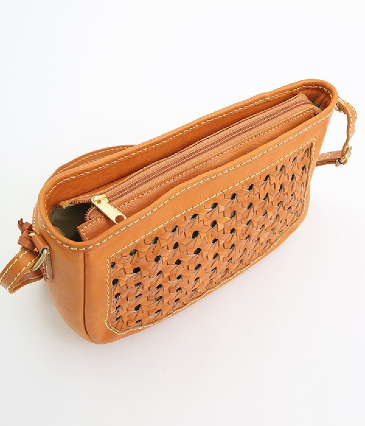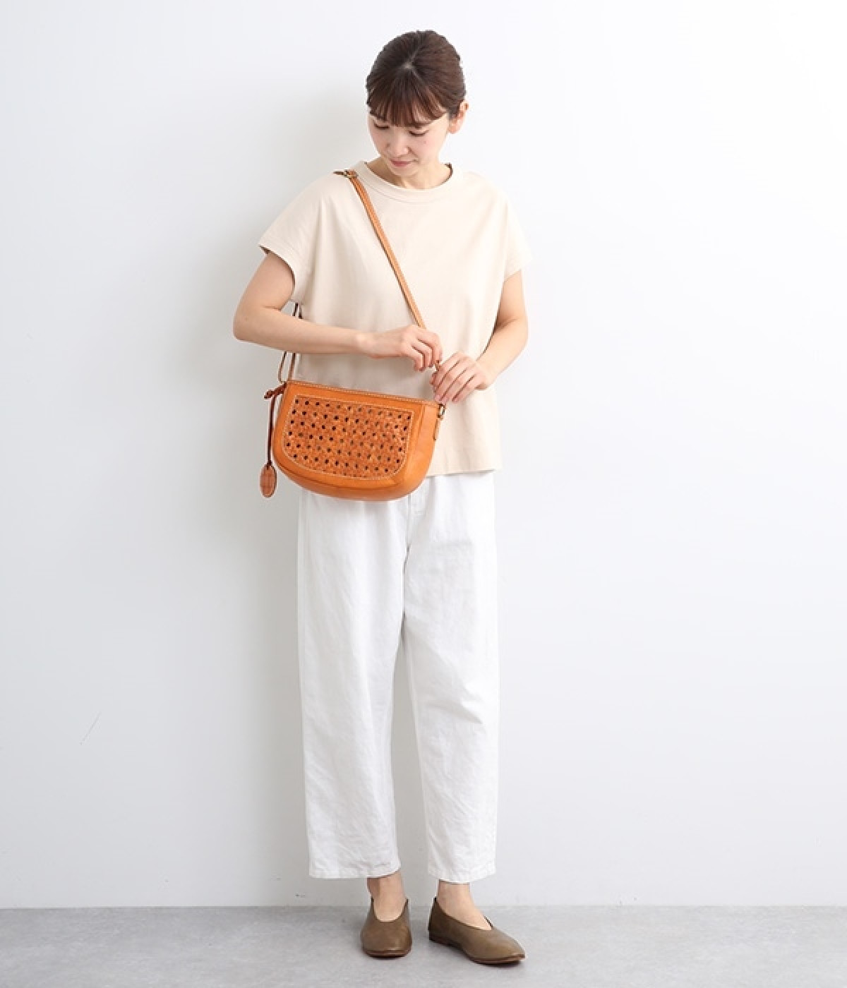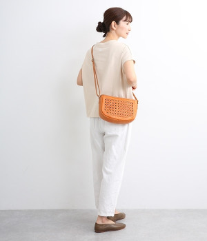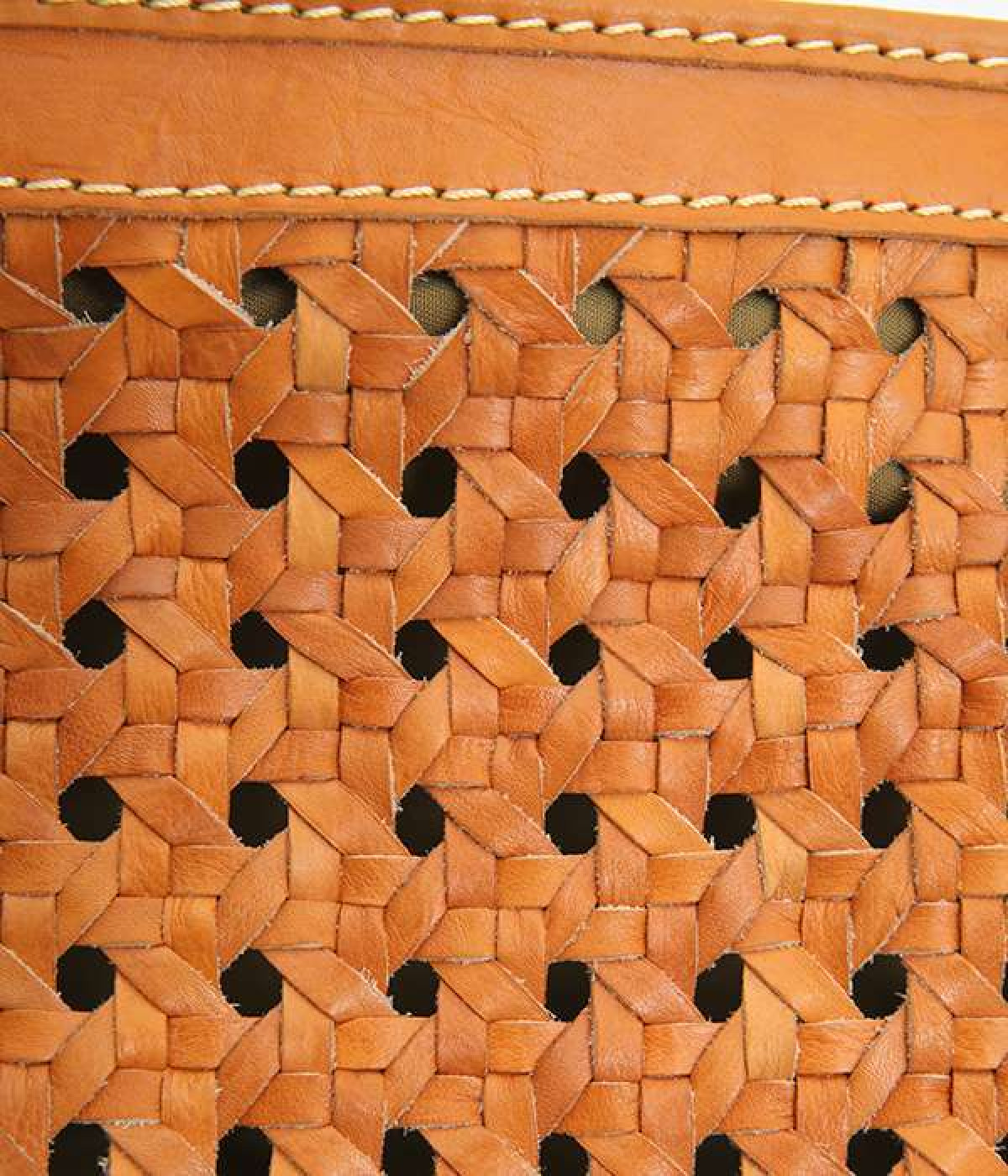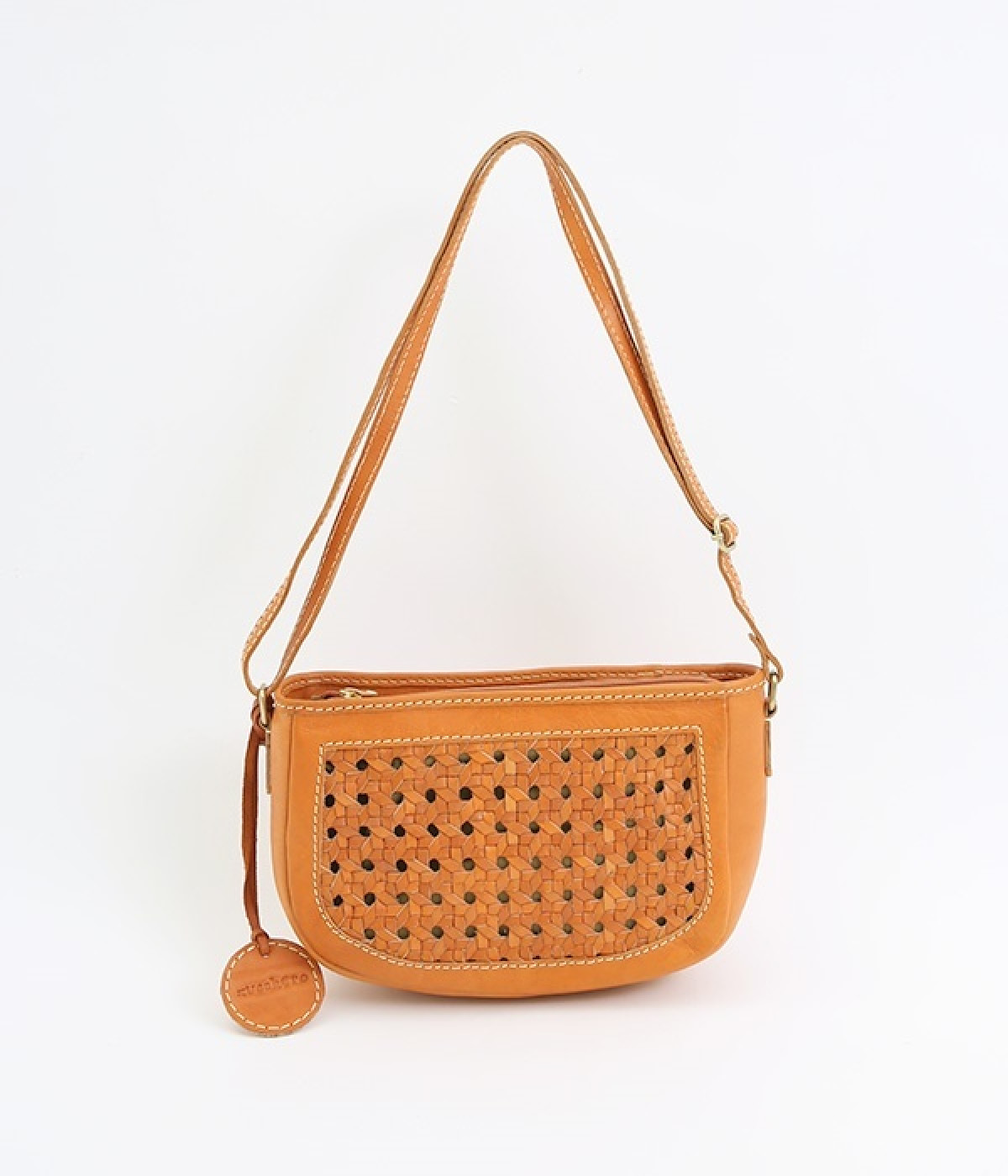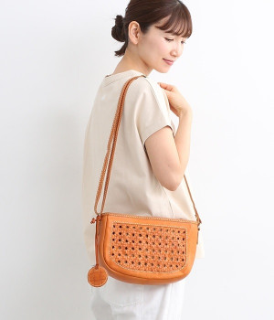 一枚ずつ手で染めては天日で乾かすなど、時間をかけて丁寧に仕上げたカウレザーを使用したバッグ。手作業で複数の革ひもをねじり合わせて六角編みをする、昔ながらの技法で編み上げました。半月型のスタイリッシュなフォルムは、スリムなデザインながら、マチのおかげでお出かけ必需品がしっかり収納可能です。内外にポケットを備えて小物の整理にも◎。使い込むほどに味わい深い表情へと変化するエイジングが楽しめます。
