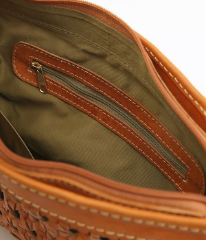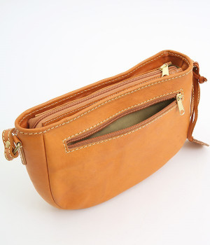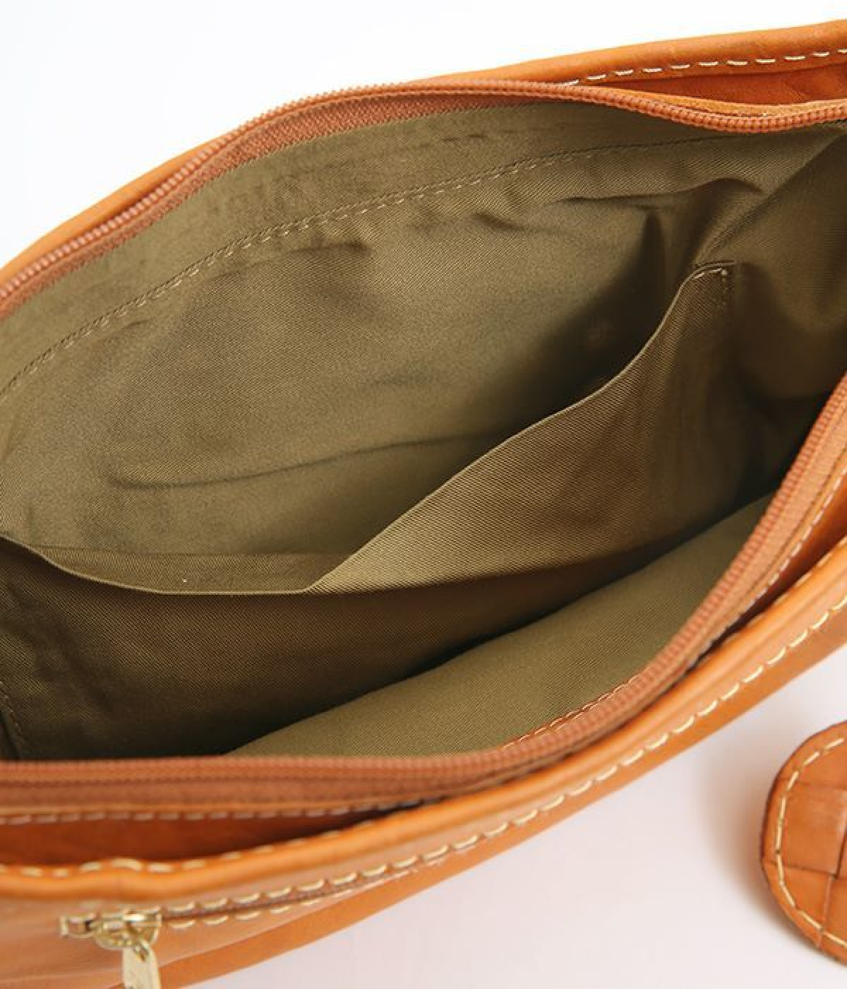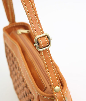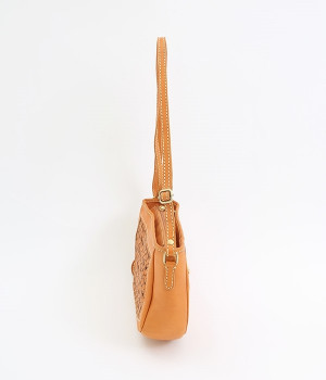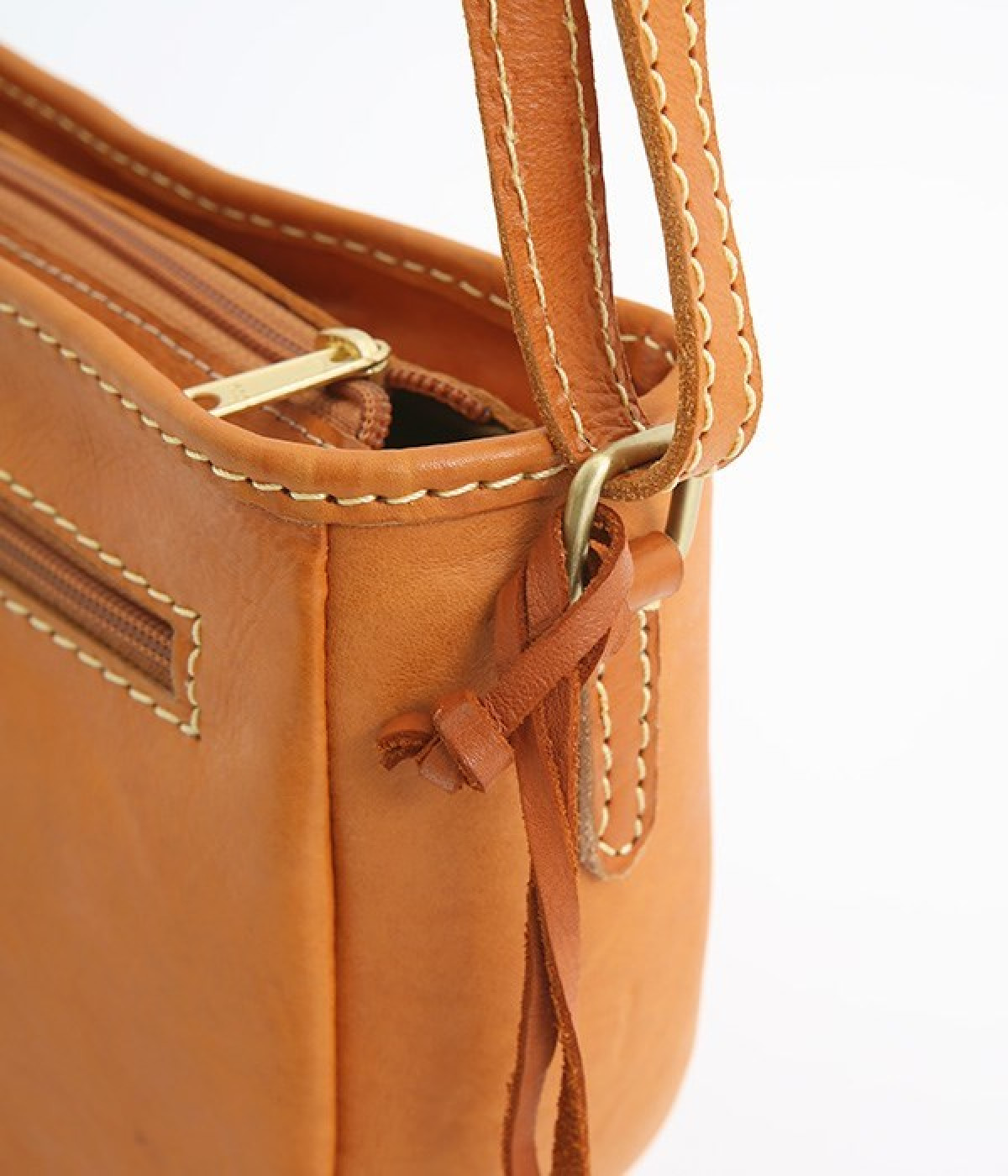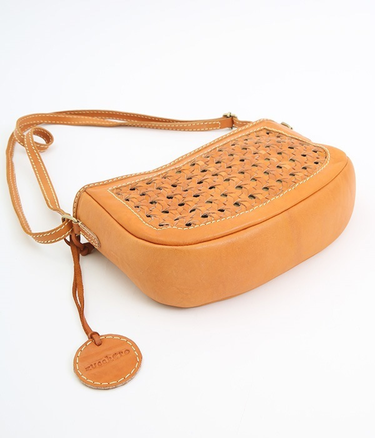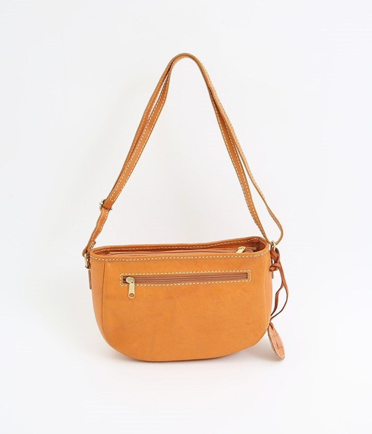 一枚ずつ手で染めては天日で乾かすなど、時間をかけて丁寧に仕上げたカウレザーを使用したバッグ。手作業で複数の革ひもをねじり合わせて六角編みをする、昔ながらの技法で編み上げました。半月型のスタイリッシュなフォルムは、スリムなデザインながら、マチのおかげでお出かけ必需品がしっかり収納可能です。内外にポケットを備えて小物の整理にも◎。使い込むほどに味わい深い表情へと変化するエイジングが楽しめます。