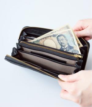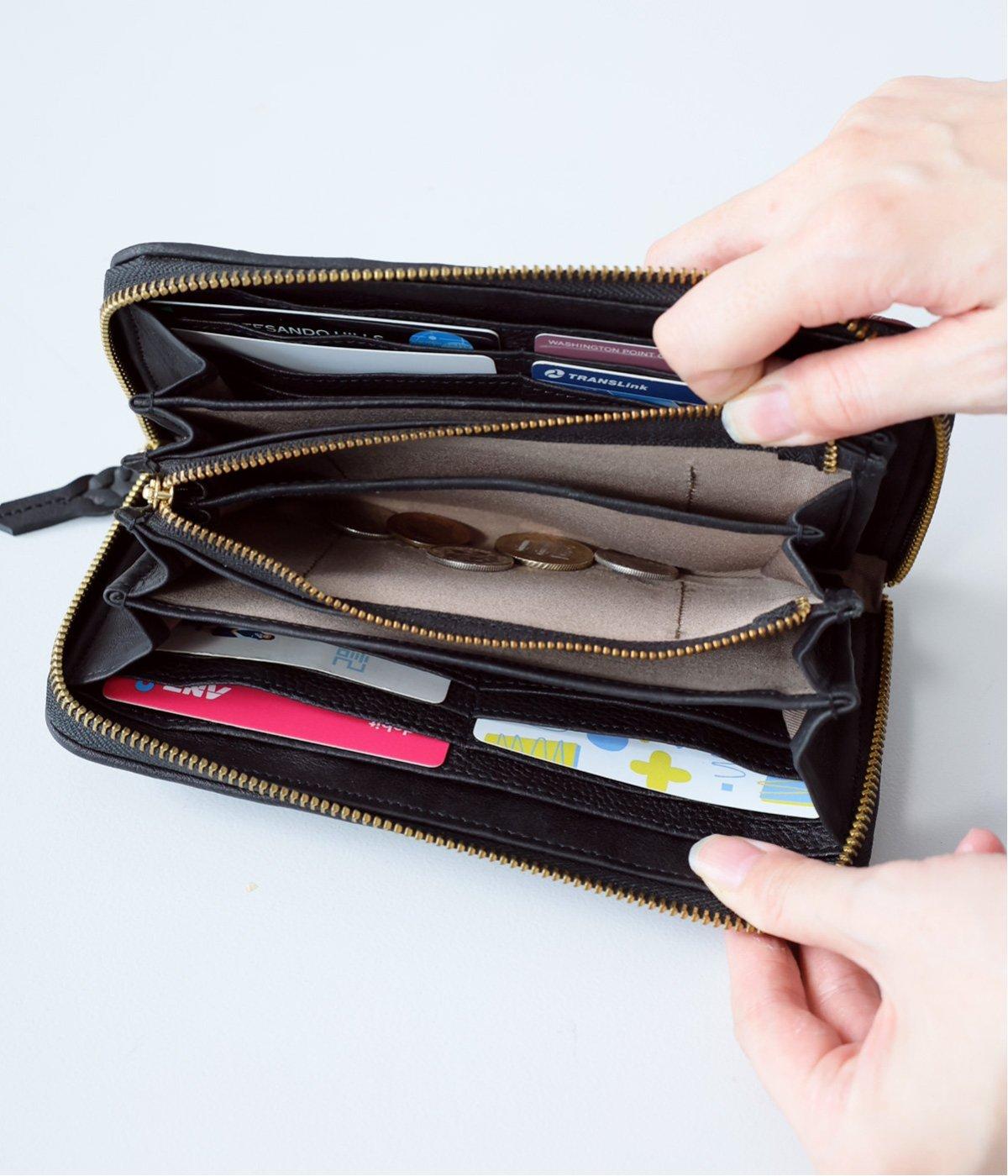 スリムな形のラウンド長財布。カードスロットは充実の14ヵ所、ほかにお札やレシート入れとしても自由に使える収納スペースを6つ完備。小銭などを収納できるファスナーポケットもついて抜群の収納力が魅力です。