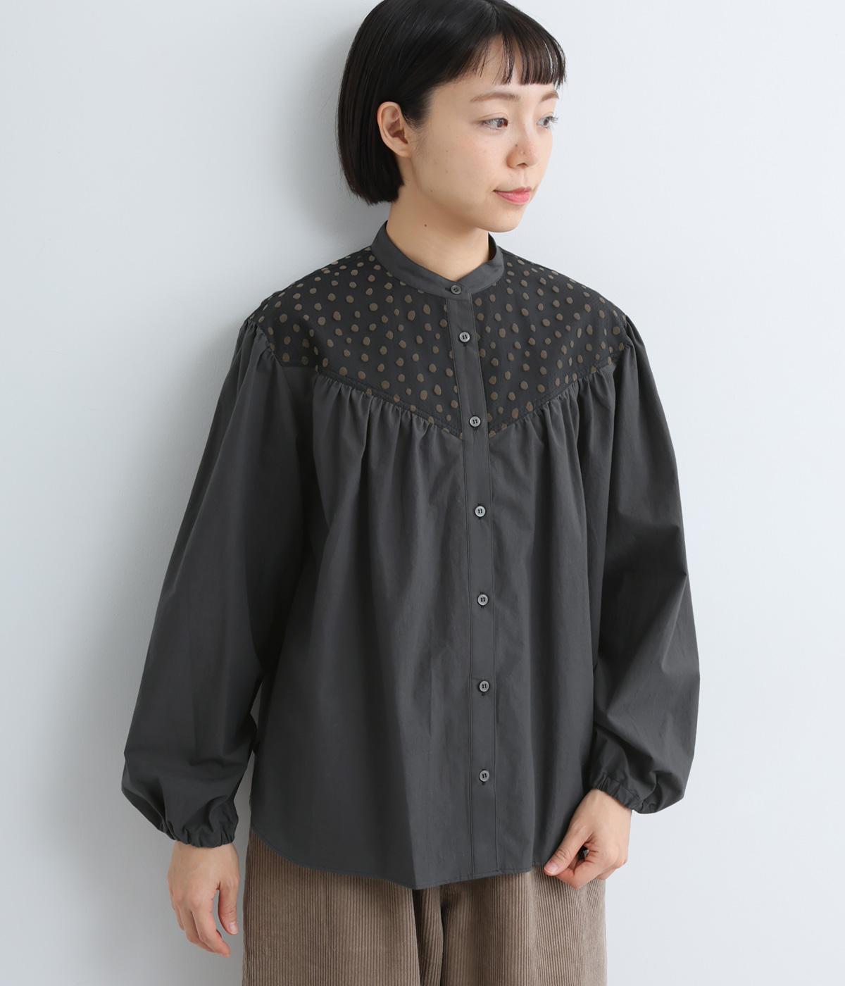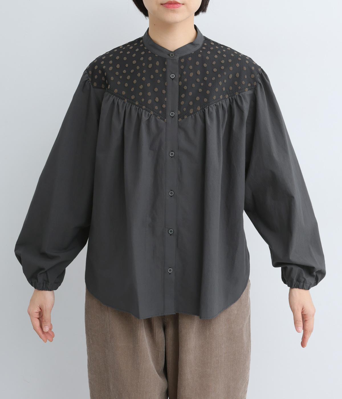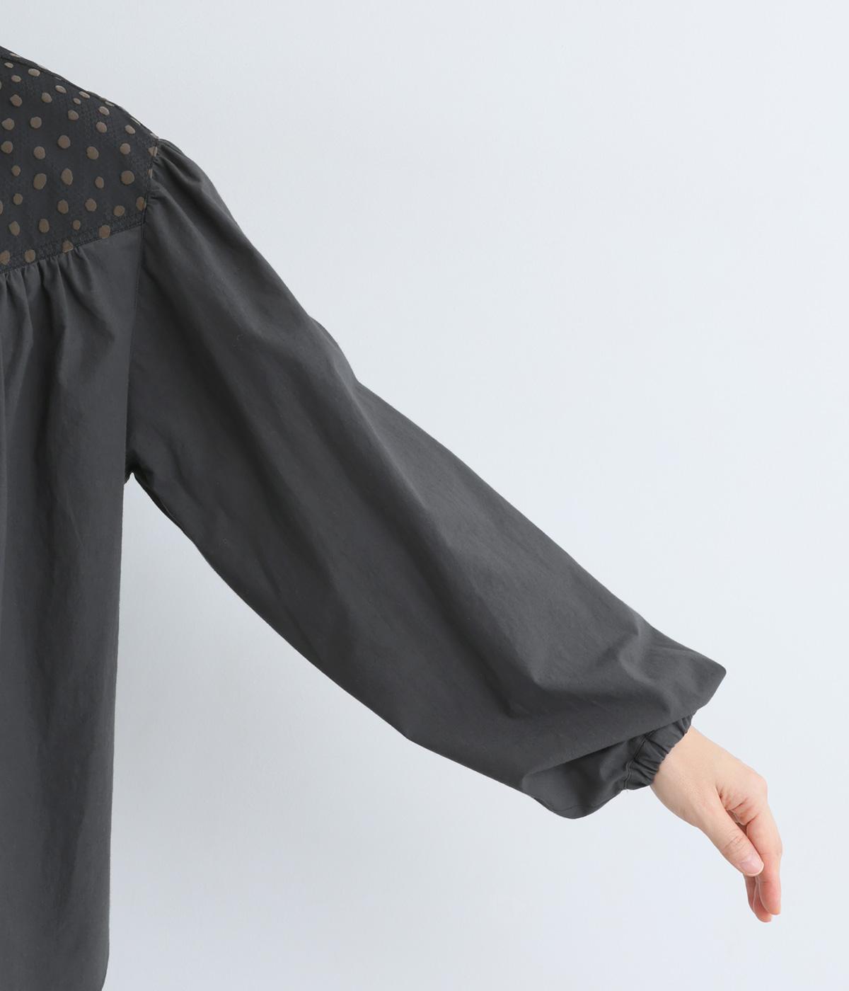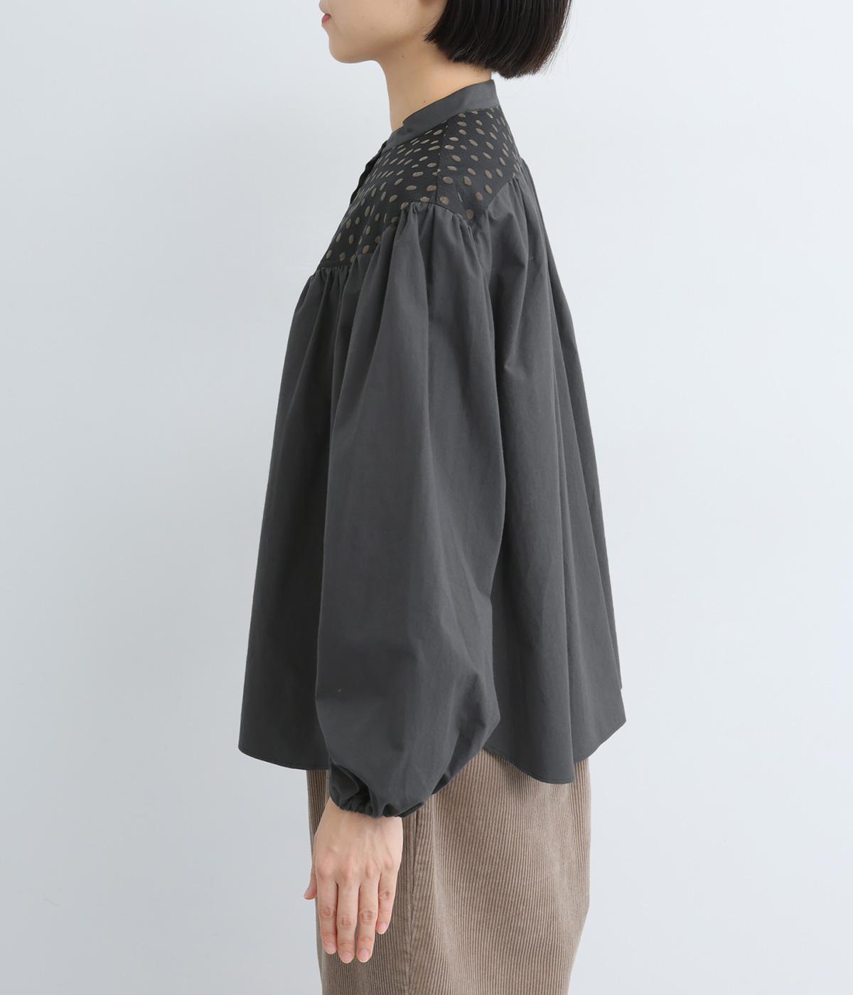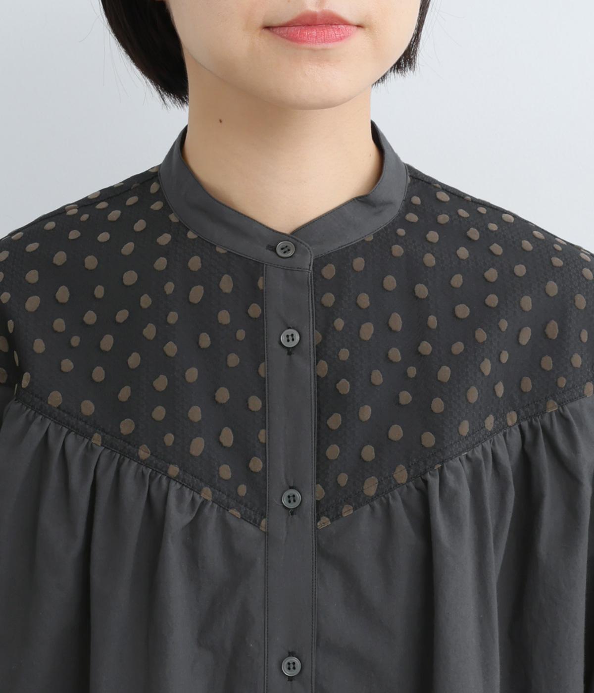 Vラインのヨーク切り替えに繊細なドット生地を配してクラシカルに仕上げました。ふんわりと立体感のある袖はゴム入りなのでたくし上げのアレンジも◎。裾はきれいにラウンドさせているのでラフなトップスアウトもさまになります。