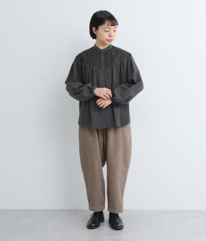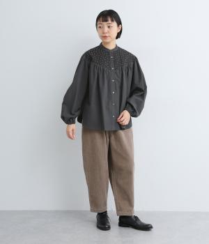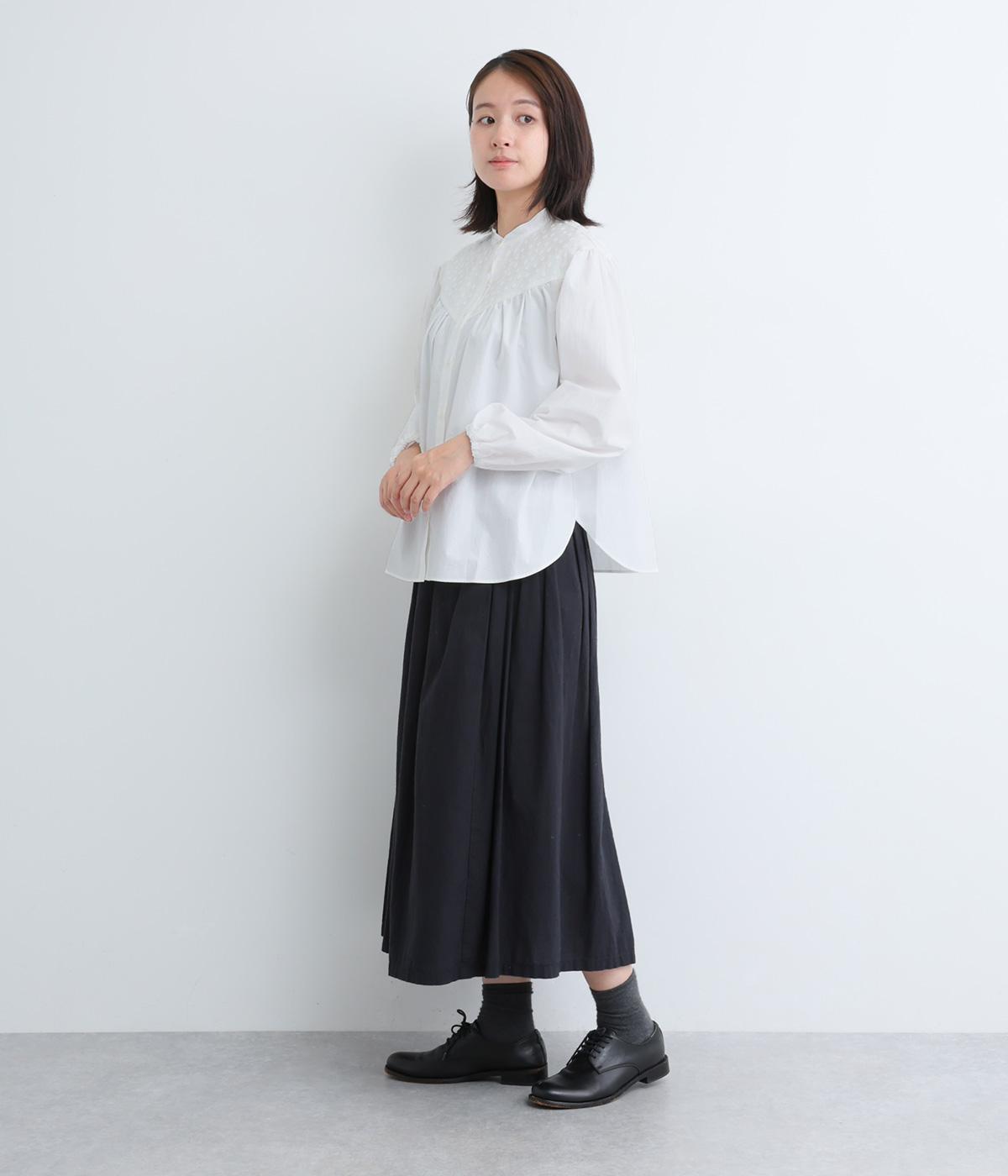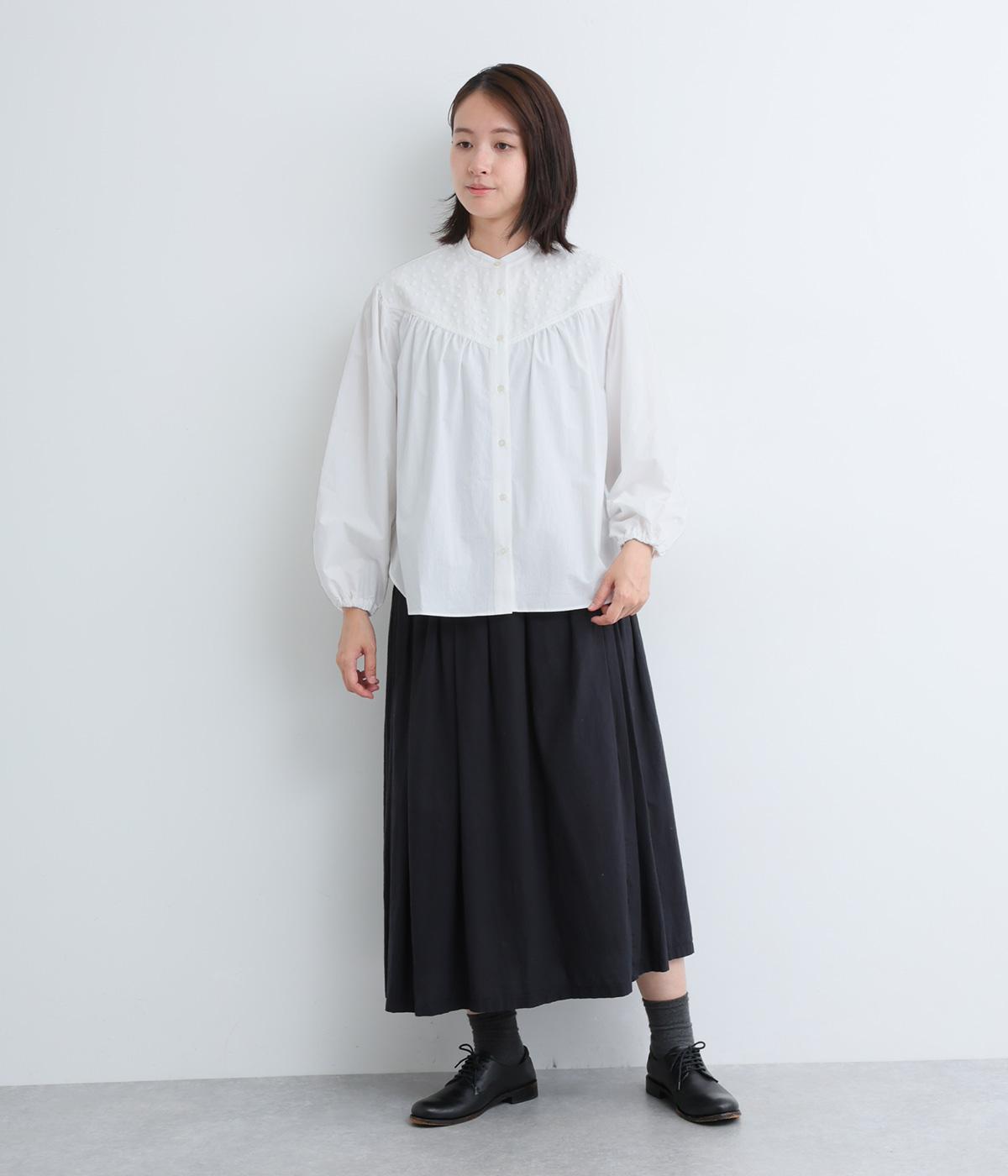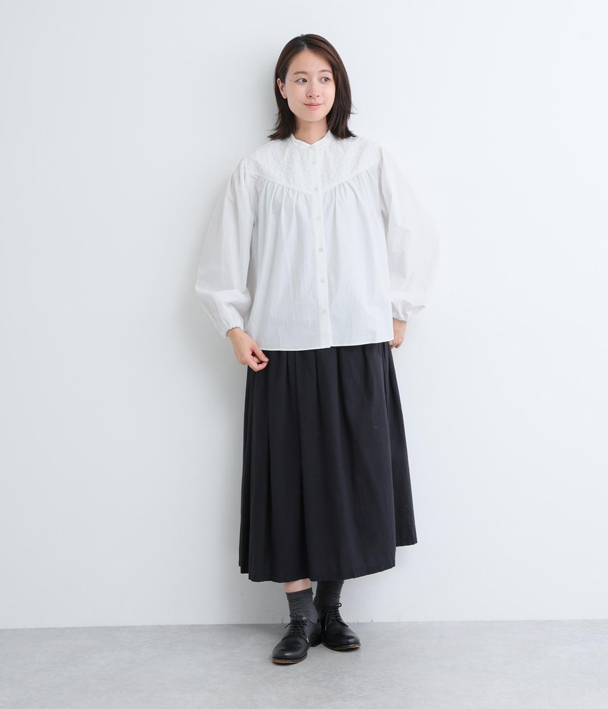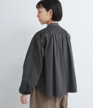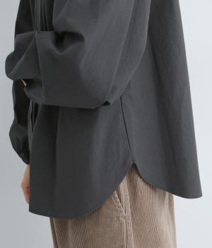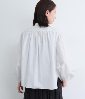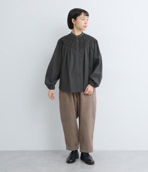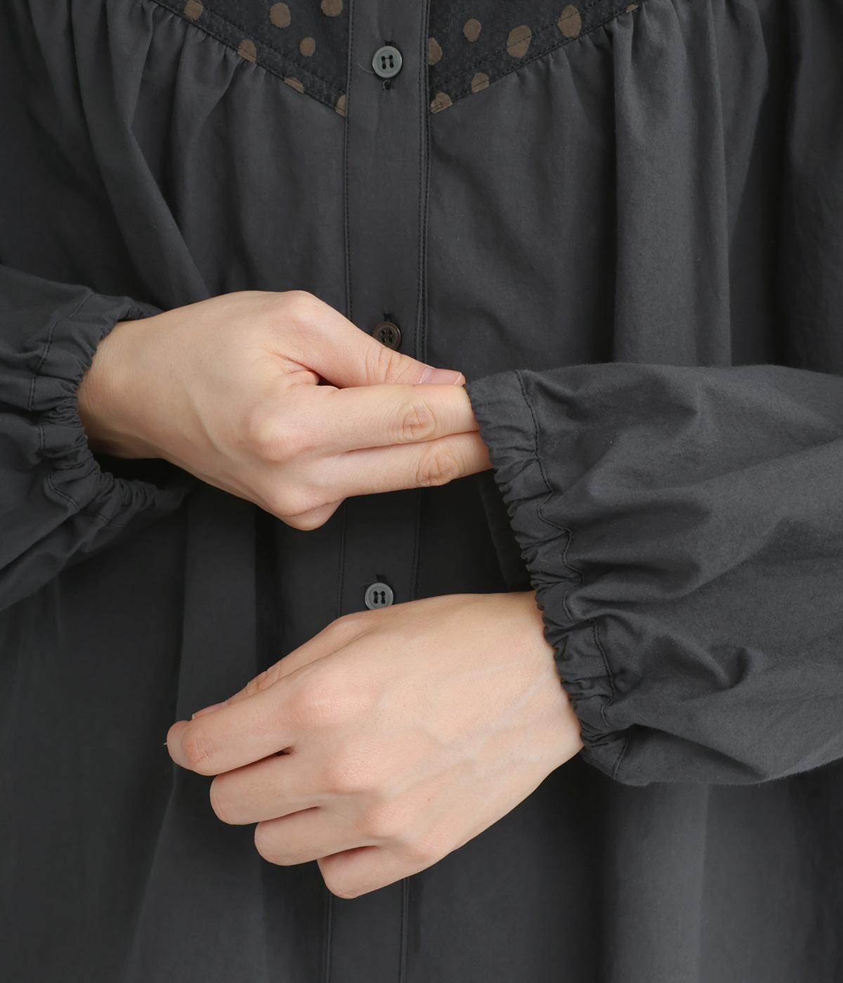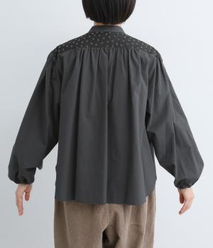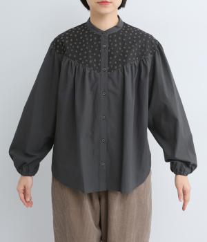 Vラインのヨーク切り替えに繊細なドット生地を配してクラシカルに仕上げました。ふんわりと立体感のある袖はゴム入りなのでたくし上げのアレンジも◎。裾はきれいにラウンドさせているのでラフなトップスアウトもさまになります。