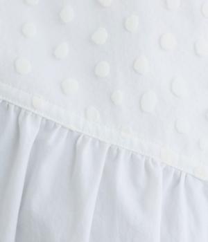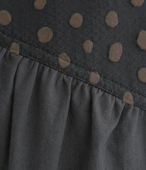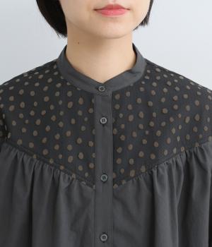 適度なハリ感がきちんとした印象を与えるコットン生地を使用。フロッキードットの繊細で透け感のある異素材を組み合わせています。