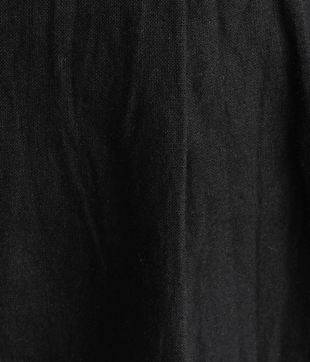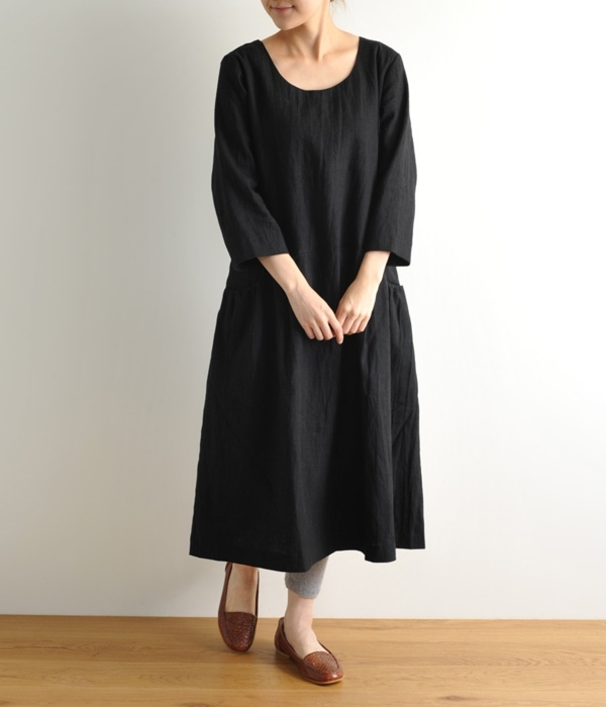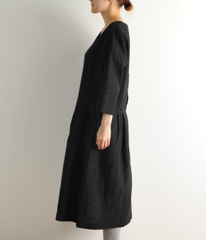 シルクプロテイン加工という特殊な加工を施したリネンを使ったワンピースです。生地に光沢と厚みがあるので一枚でも着用できます。ウエスト切り替えのところにギャザーポケットがあるのもポイントです。お出かけ着としても、フォーマルとしても使えて着こなしの幅が広がる一枚です。