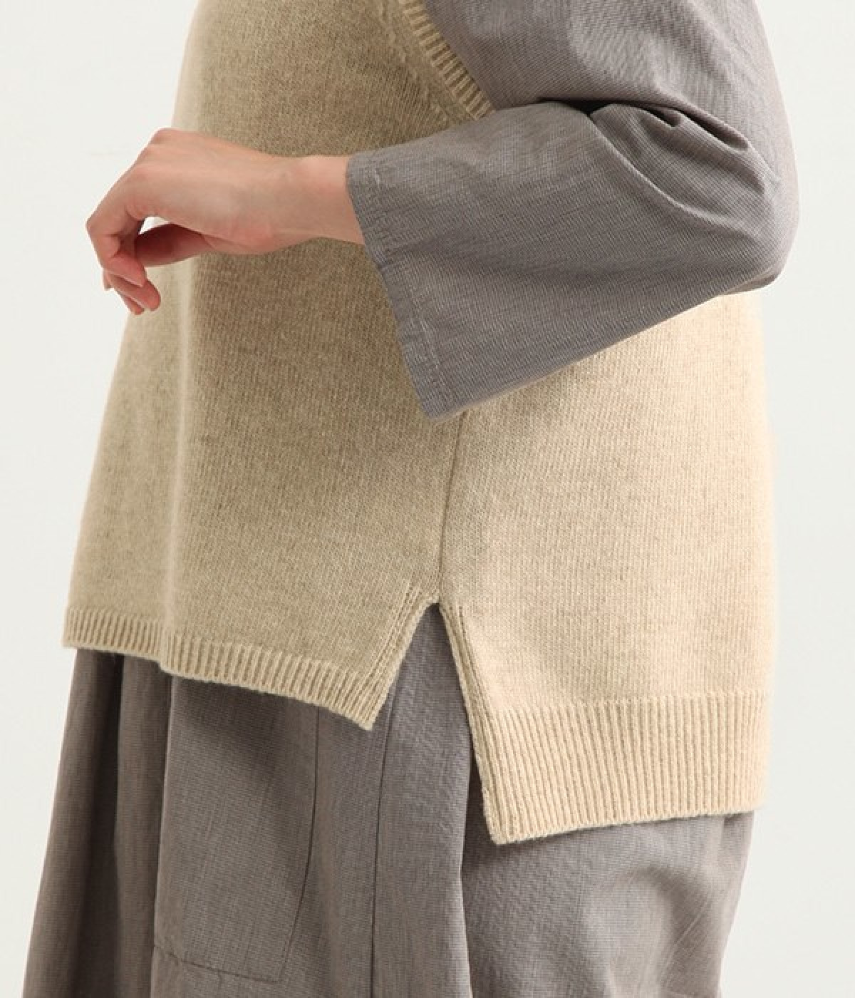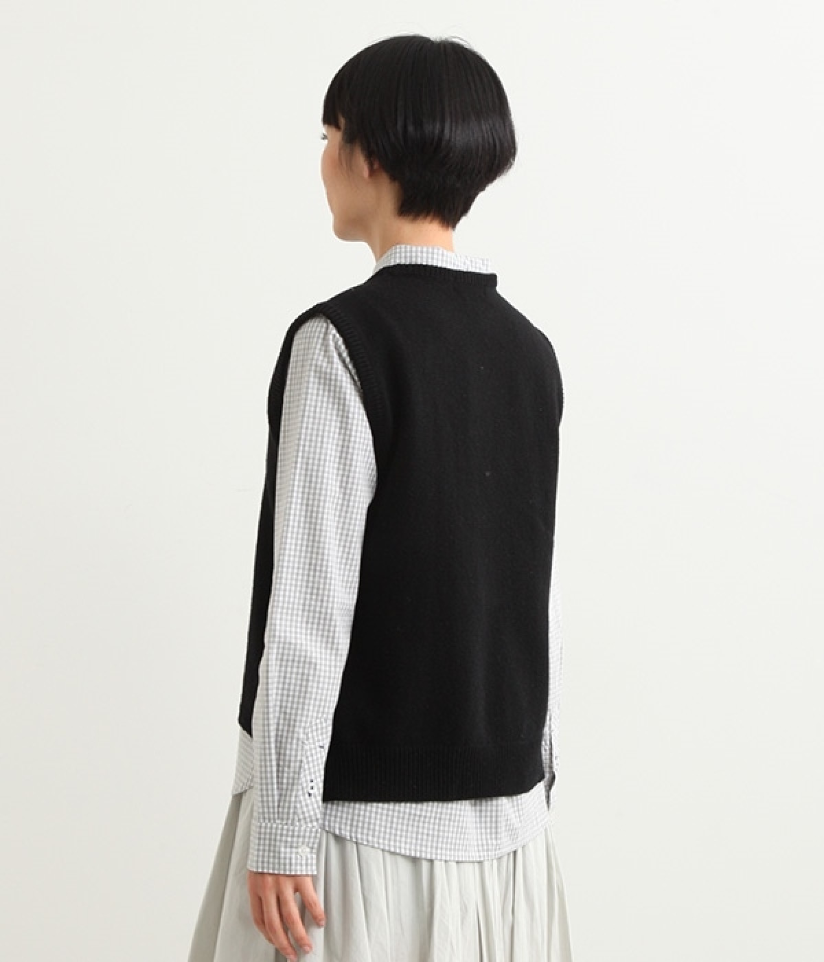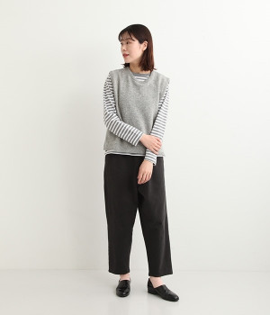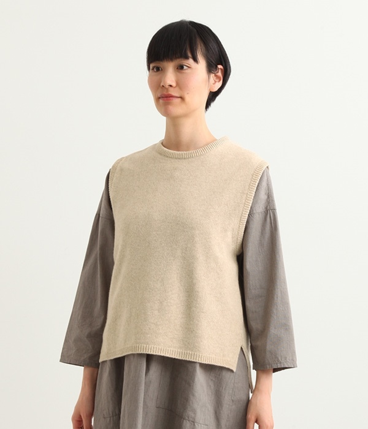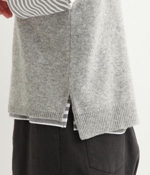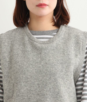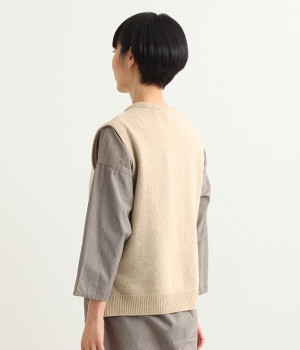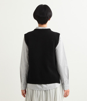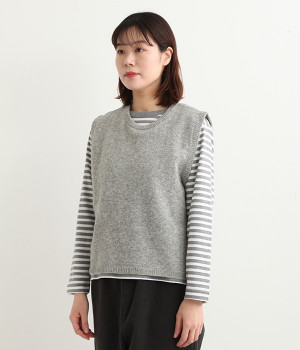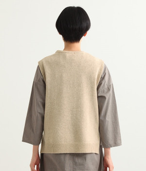 上質なラムウールを使用したシンプルなベストです。きめが細かくしなやかな風合いで、軽くてあたたかく快適な着心地に。春や秋はシャツに重ねて、冬はアウターの中に入れて、これ1枚でコーディネートの幅が広がる便利なアイテムです。広めに開いた袖ぐりで、ボリュームスリーブのインナーにも重ねられます。裾脇のスリットと、前後差のある丈感もさりげないポイント。