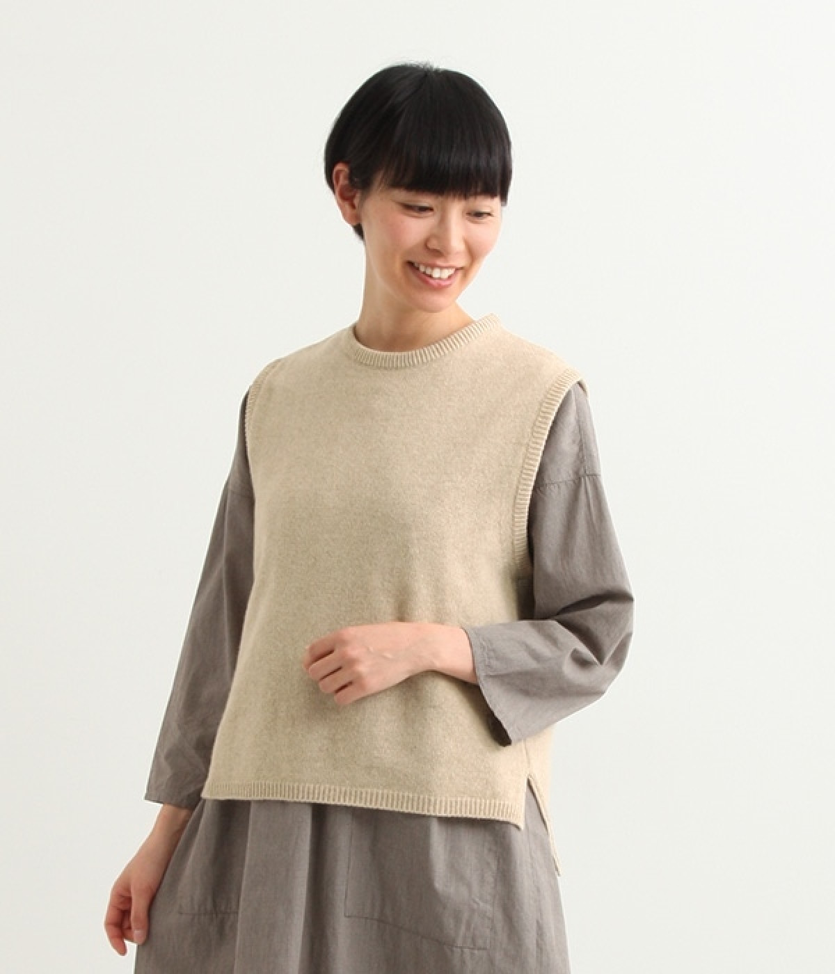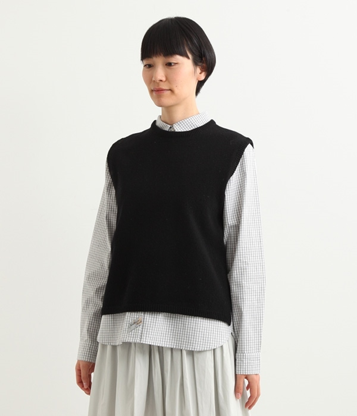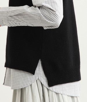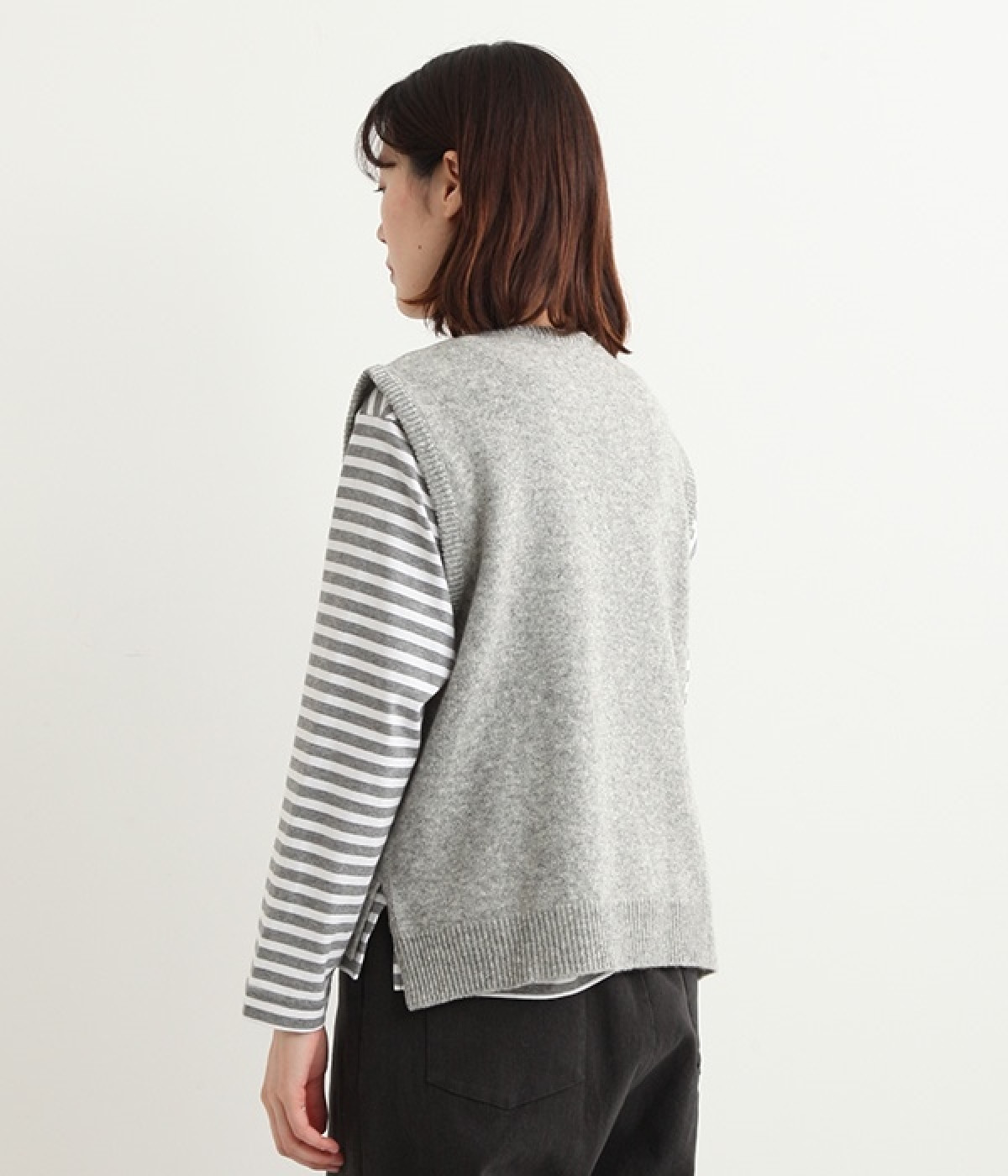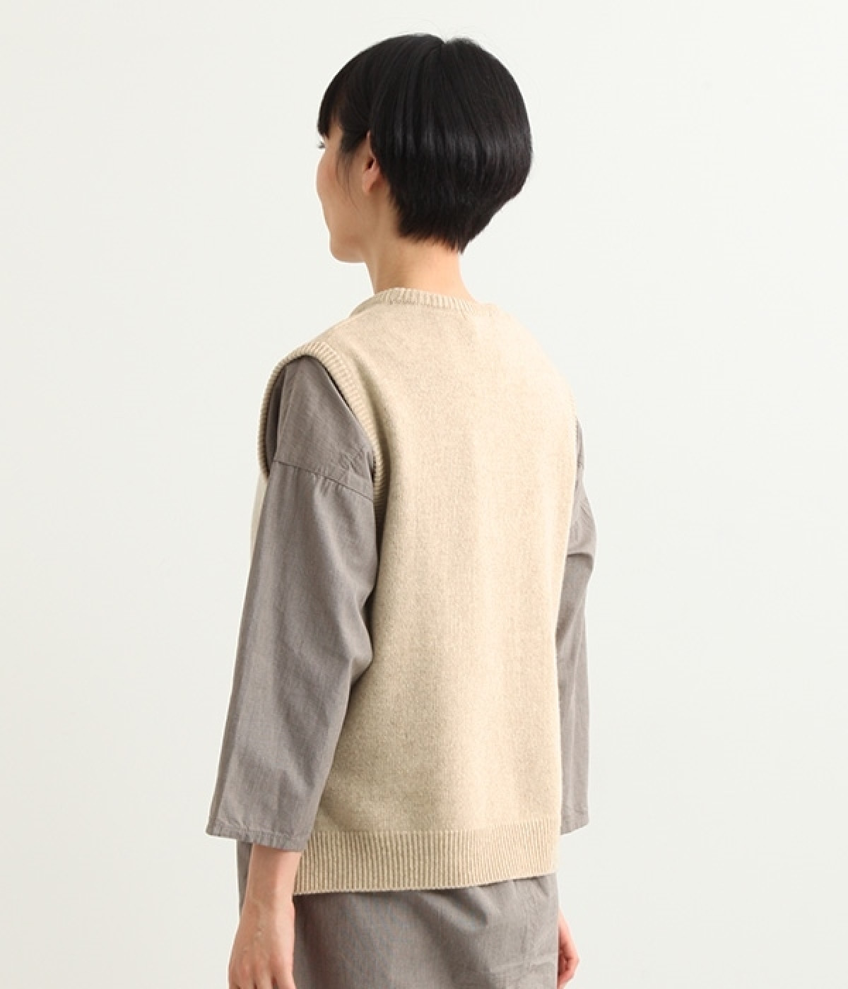 上質なラムウールを使用したシンプルなベストです。きめが細かくしなやかな風合いで、軽くてあたたかく快適な着心地に。春や秋はシャツに重ねて、冬はアウターの中に入れて、これ1枚でコーディネートの幅が広がる便利なアイテムです。広めに開いた袖ぐりで、ボリュームスリーブのインナーにも重ねられます。裾脇のスリットと、前後差のある丈感もさりげないポイント。