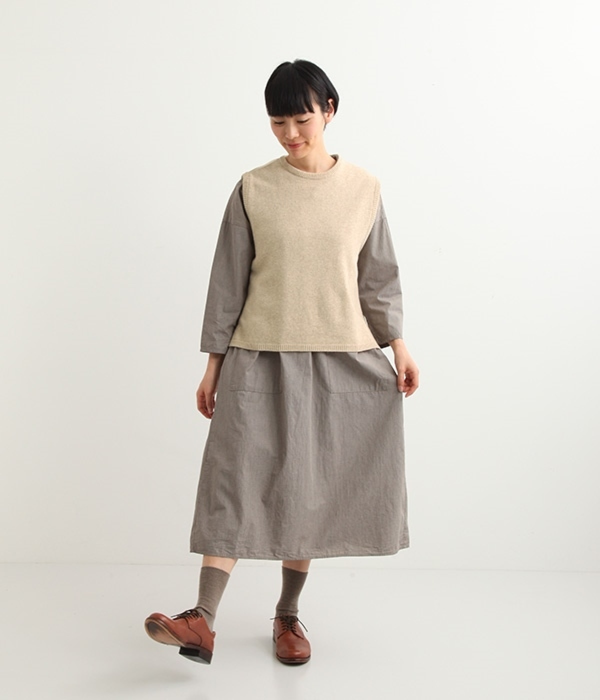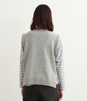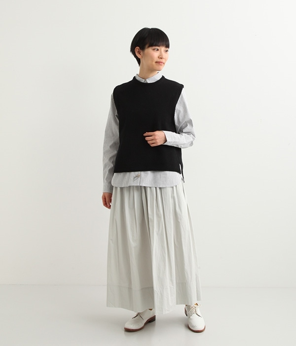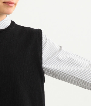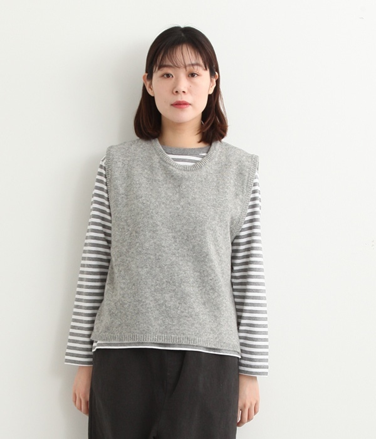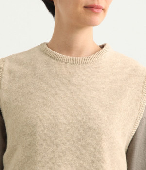 上質なラムウールを使用したシンプルなベストです。きめが細かくしなやかな風合いで、軽くてあたたかく快適な着心地に。春や秋はシャツに重ねて、冬はアウターの中に入れて、これ1枚でコーディネートの幅が広がる便利なアイテムです。広めに開いた袖ぐりで、ボリュームスリーブのインナーにも重ねられます。裾脇のスリットと、前後差のある丈感もさりげないポイント。