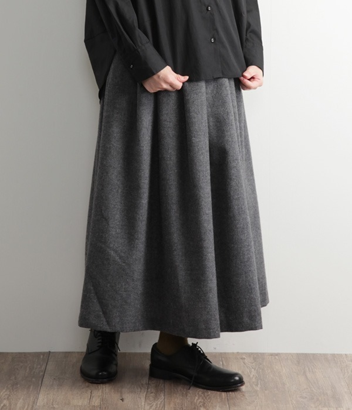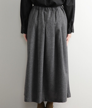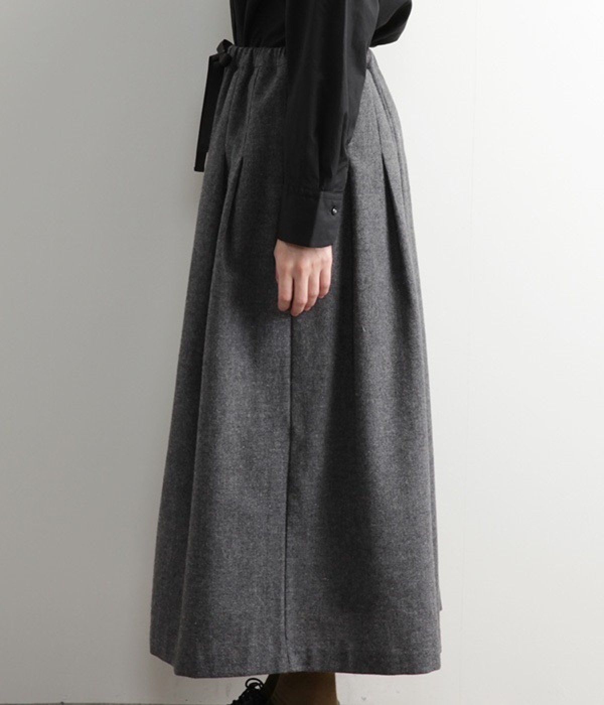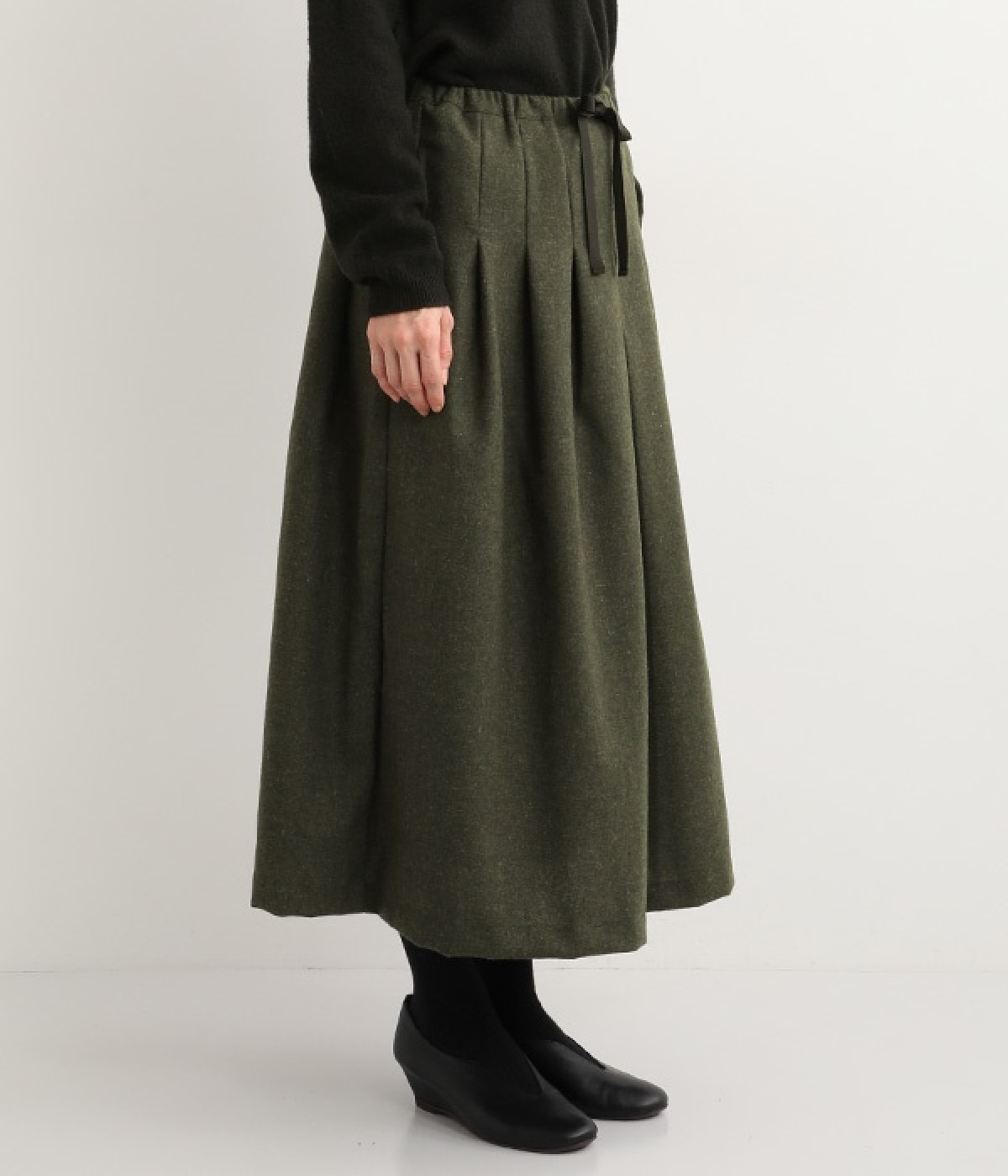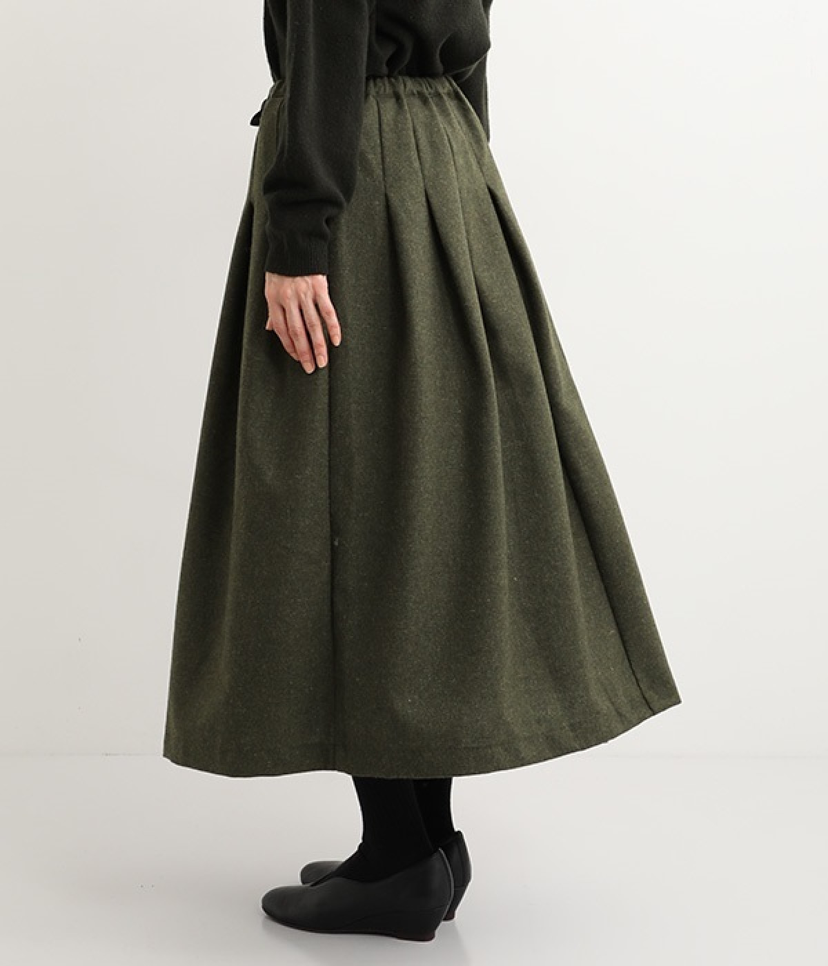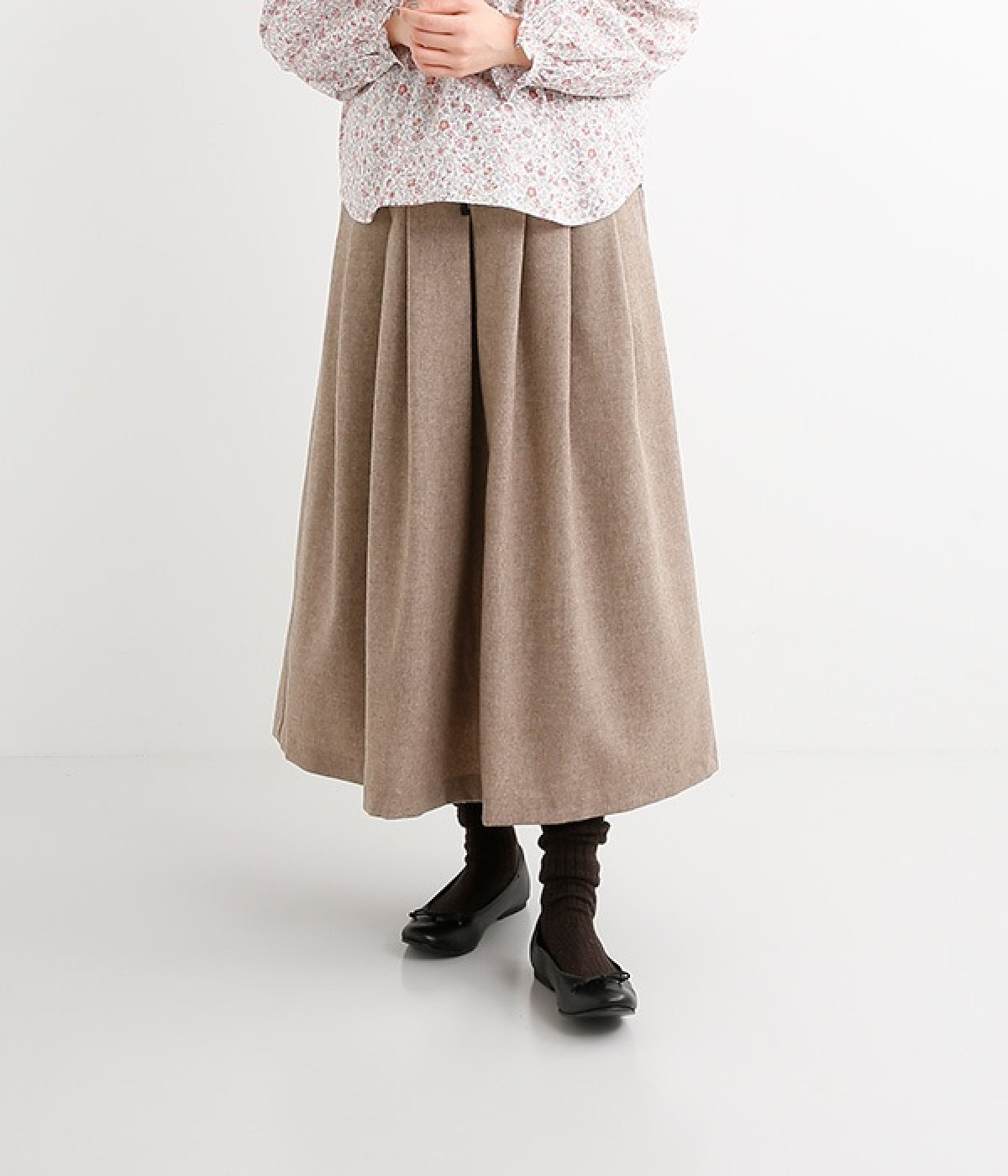 あたたかなウール混素材のスカートです。フェミニンな雰囲気漂う、ロング丈のAラインシルエットが魅力的。中縫いをしたタックがウエスト周りをすっきりと見せてくれます。ウエストは総ゴムに紐仕様のストレスフリーなはき心地。どんなトップスとも合わせやすいカラーもポイントです。