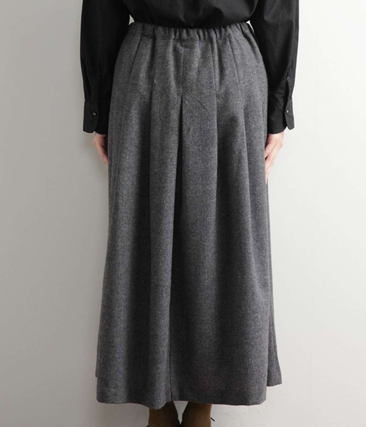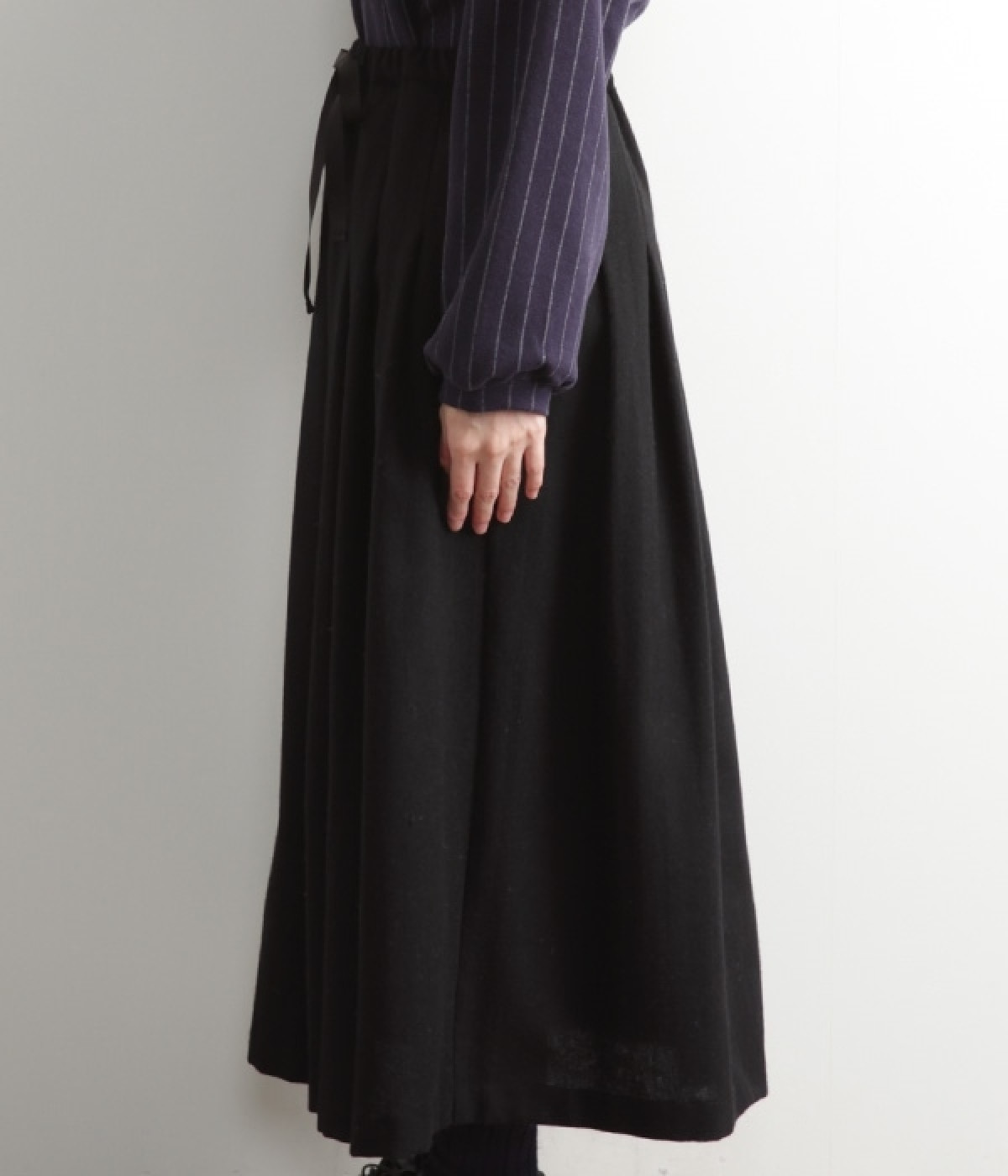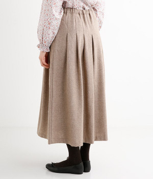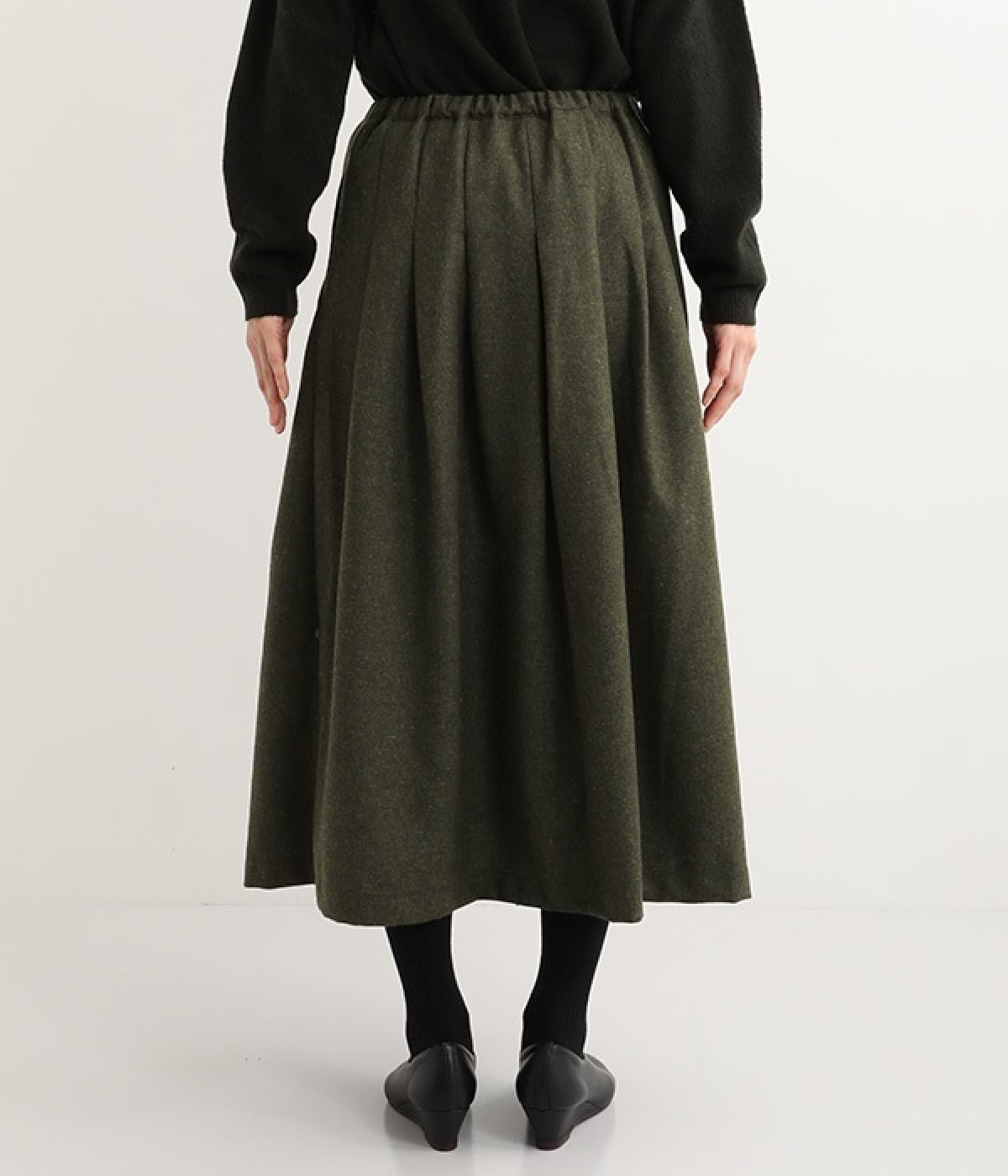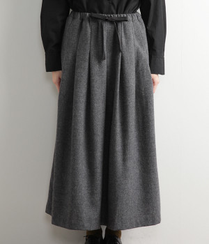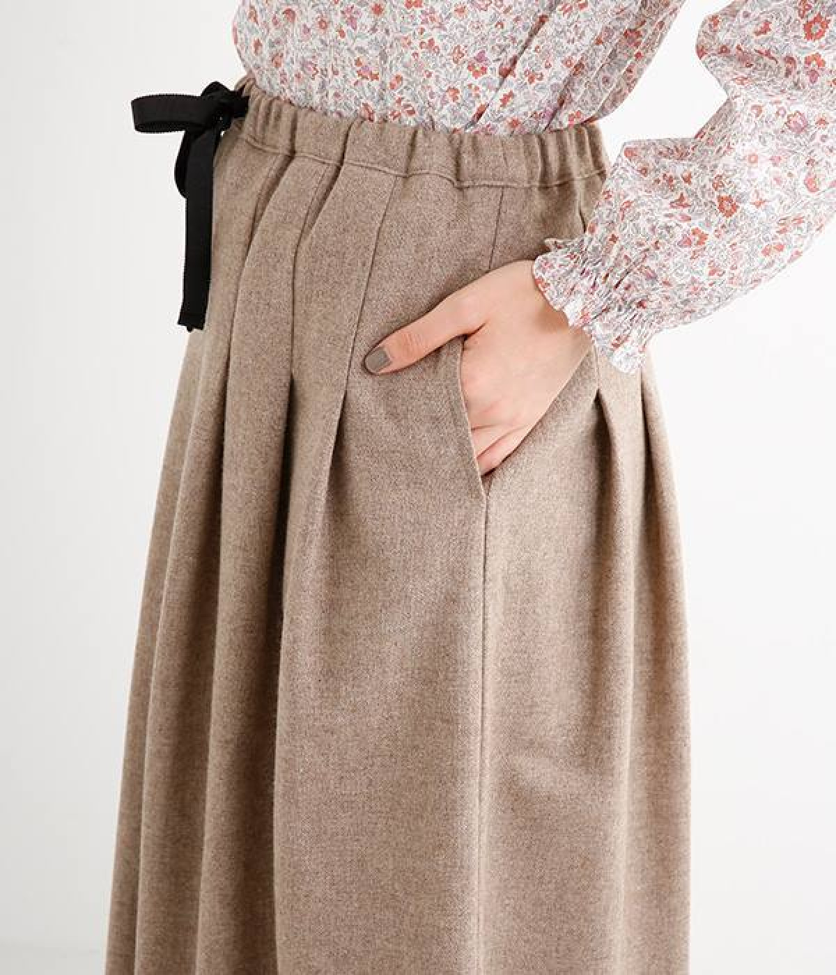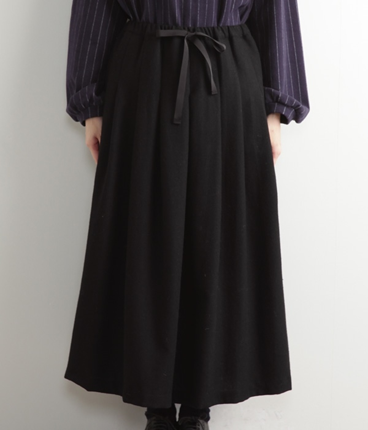 あたたかなウール混素材のスカートです。フェミニンな雰囲気漂う、ロング丈のAラインシルエットが魅力的。中縫いをしたタックがウエスト周りをすっきりと見せてくれます。ウエストは総ゴムに紐仕様のストレスフリーなはき心地。どんなトップスとも合わせやすいカラーもポイントです。