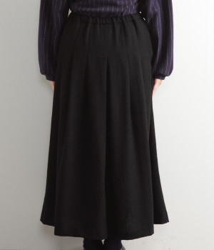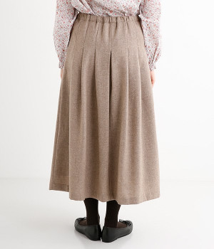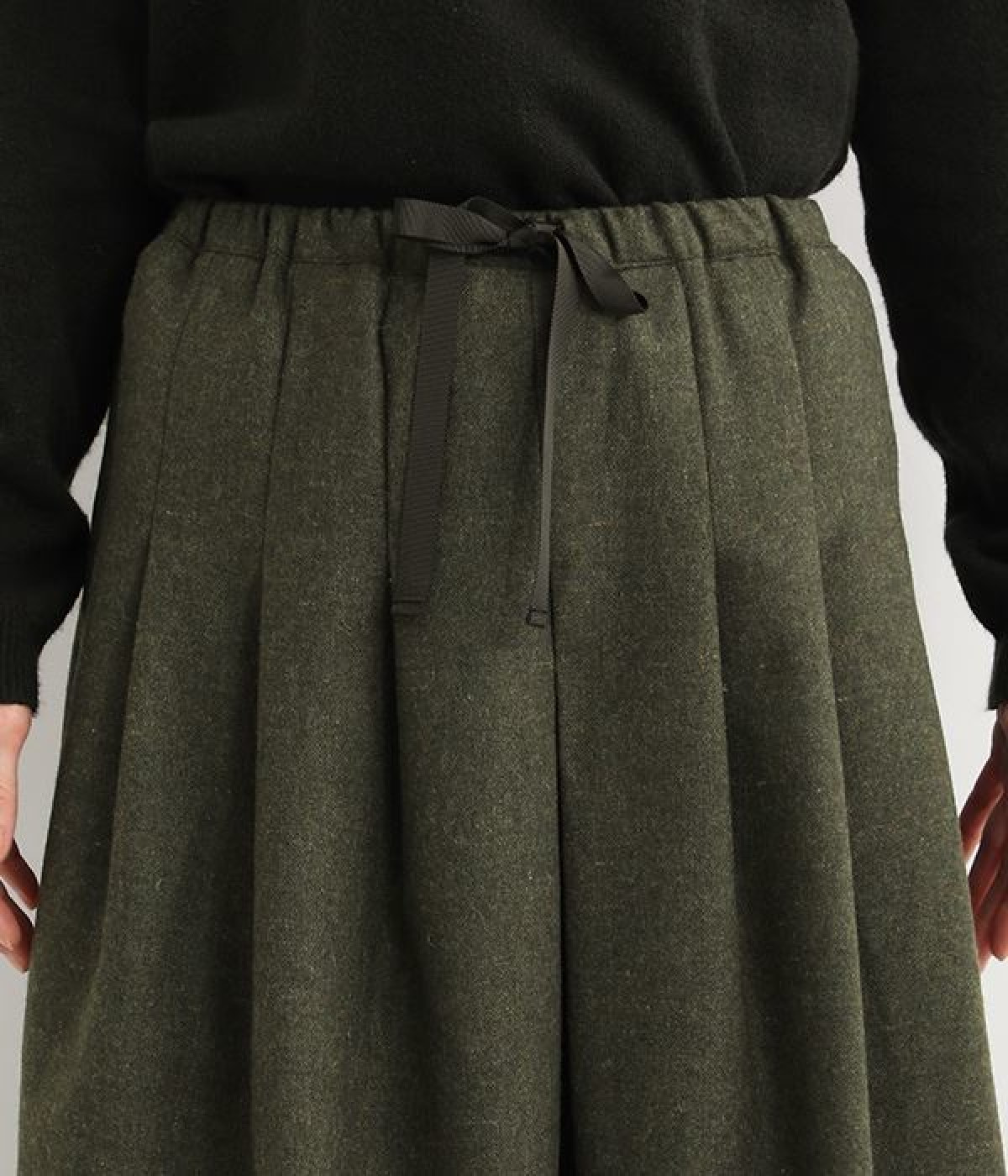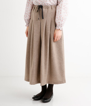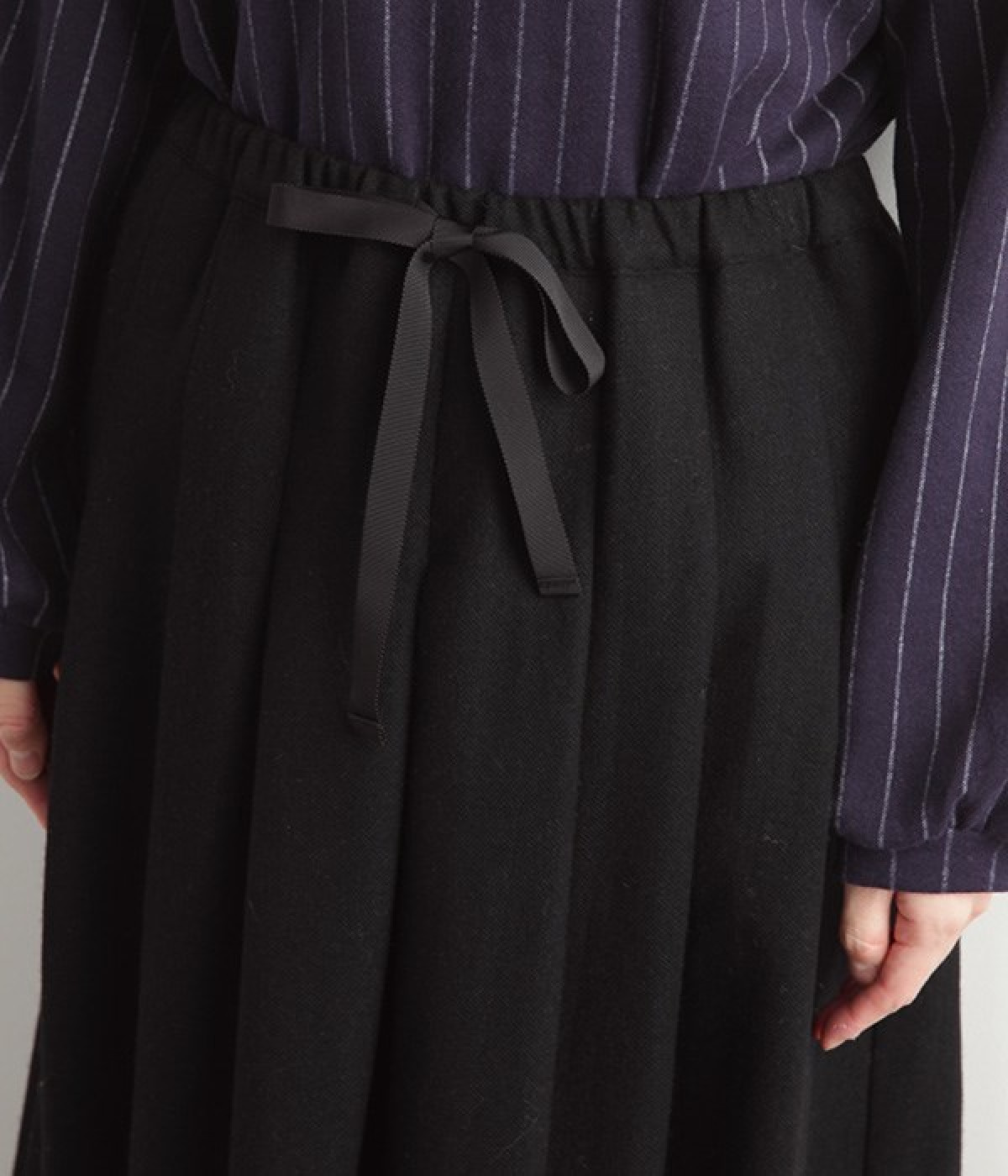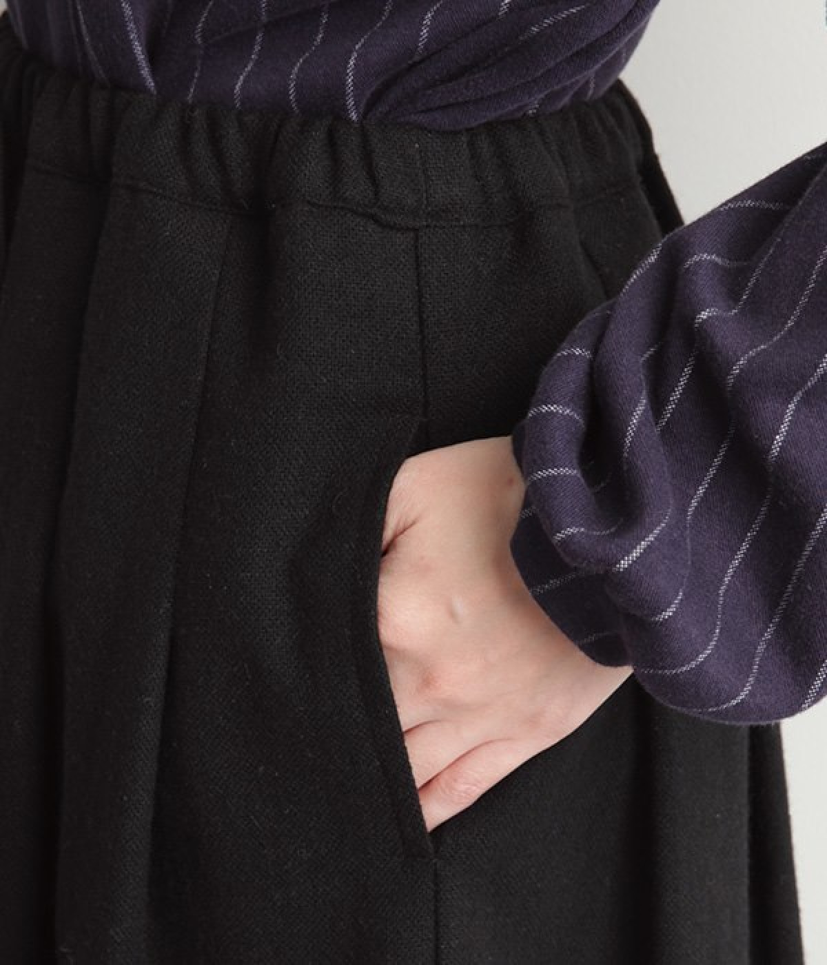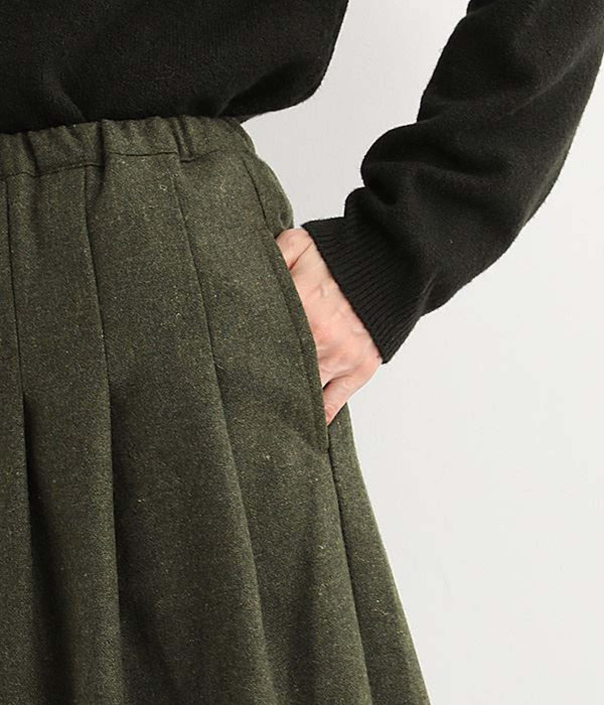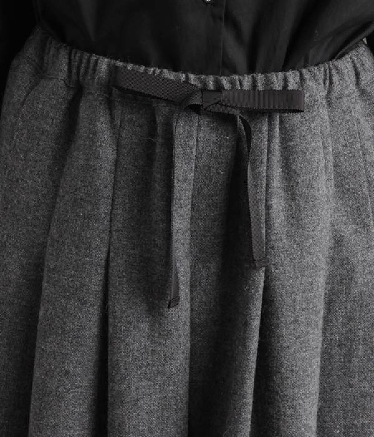 あたたかなウール混素材のスカートです。フェミニンな雰囲気漂う、ロング丈のAラインシルエットが魅力的。中縫いをしたタックがウエスト周りをすっきりと見せてくれます。ウエストは総ゴムに紐仕様のストレスフリーなはき心地。どんなトップスとも合わせやすいカラーもポイントです。