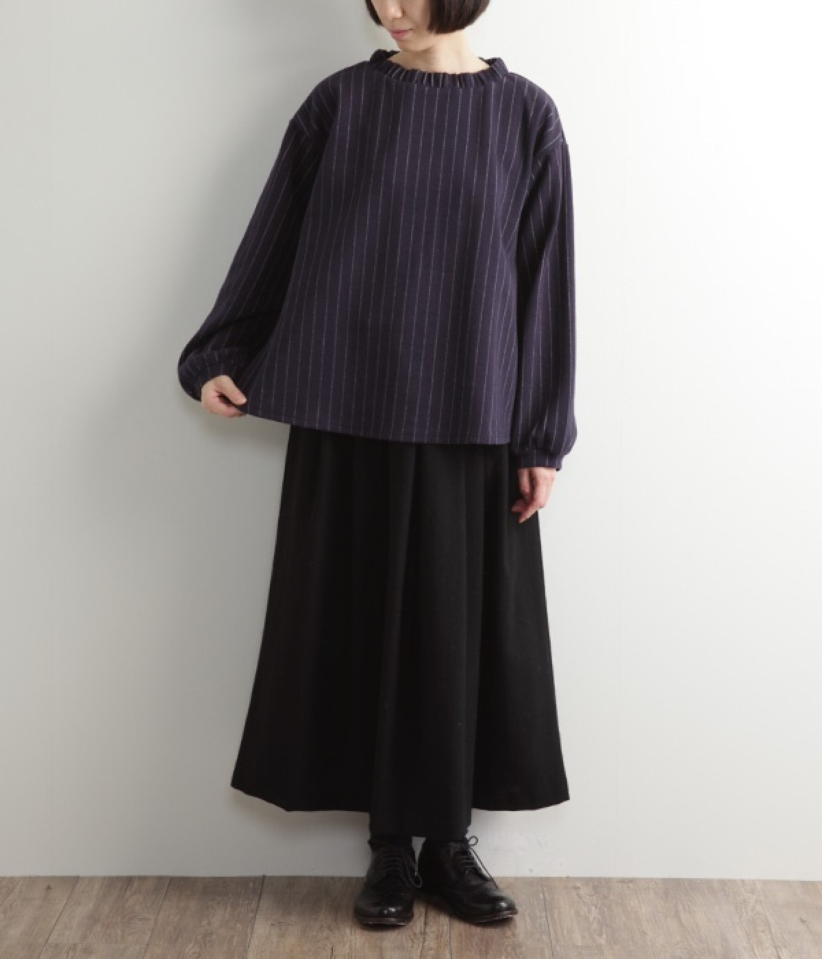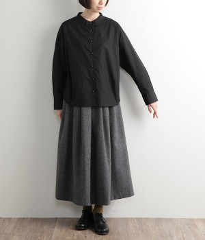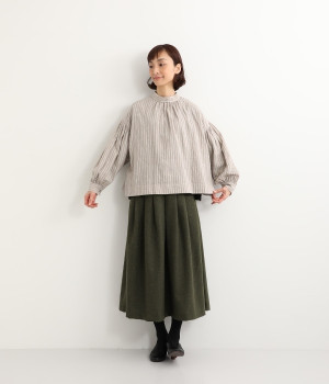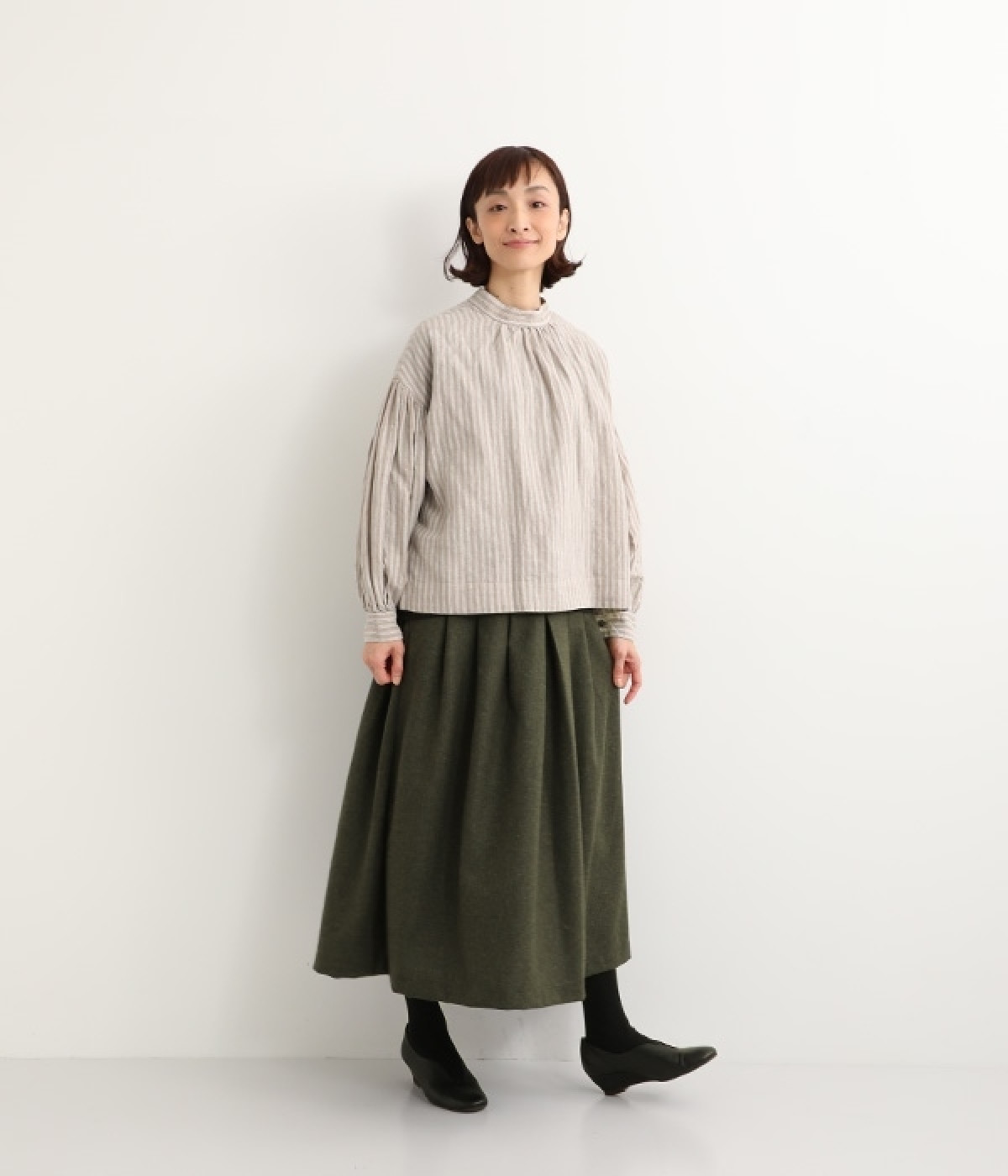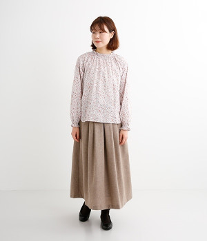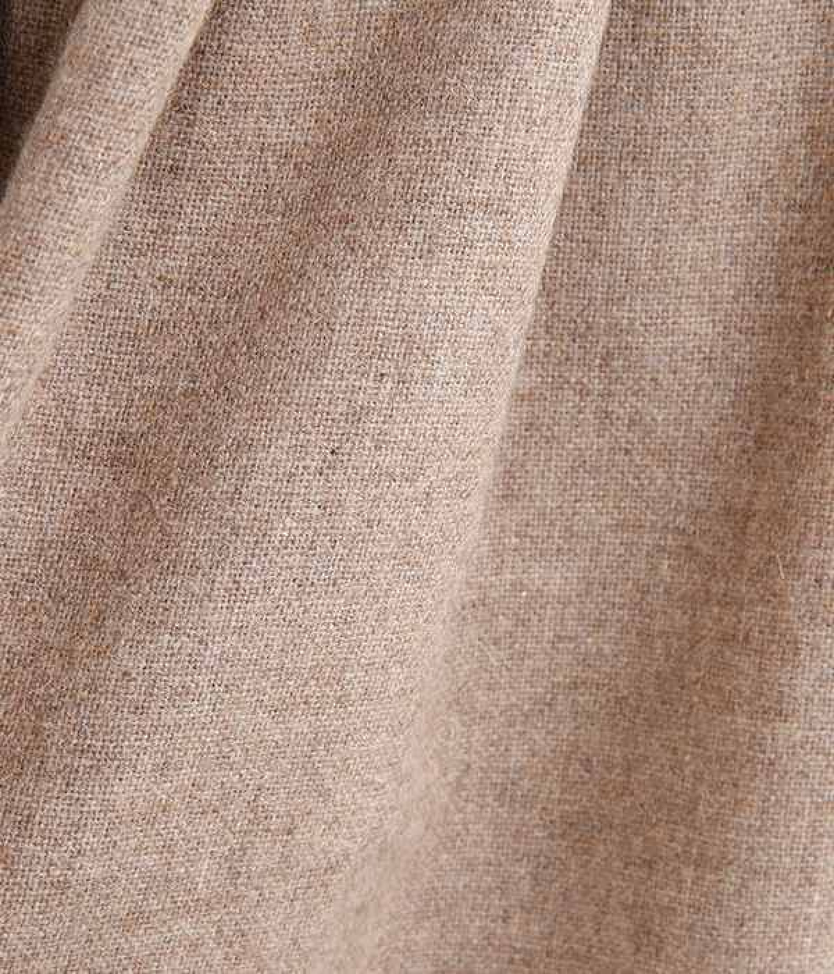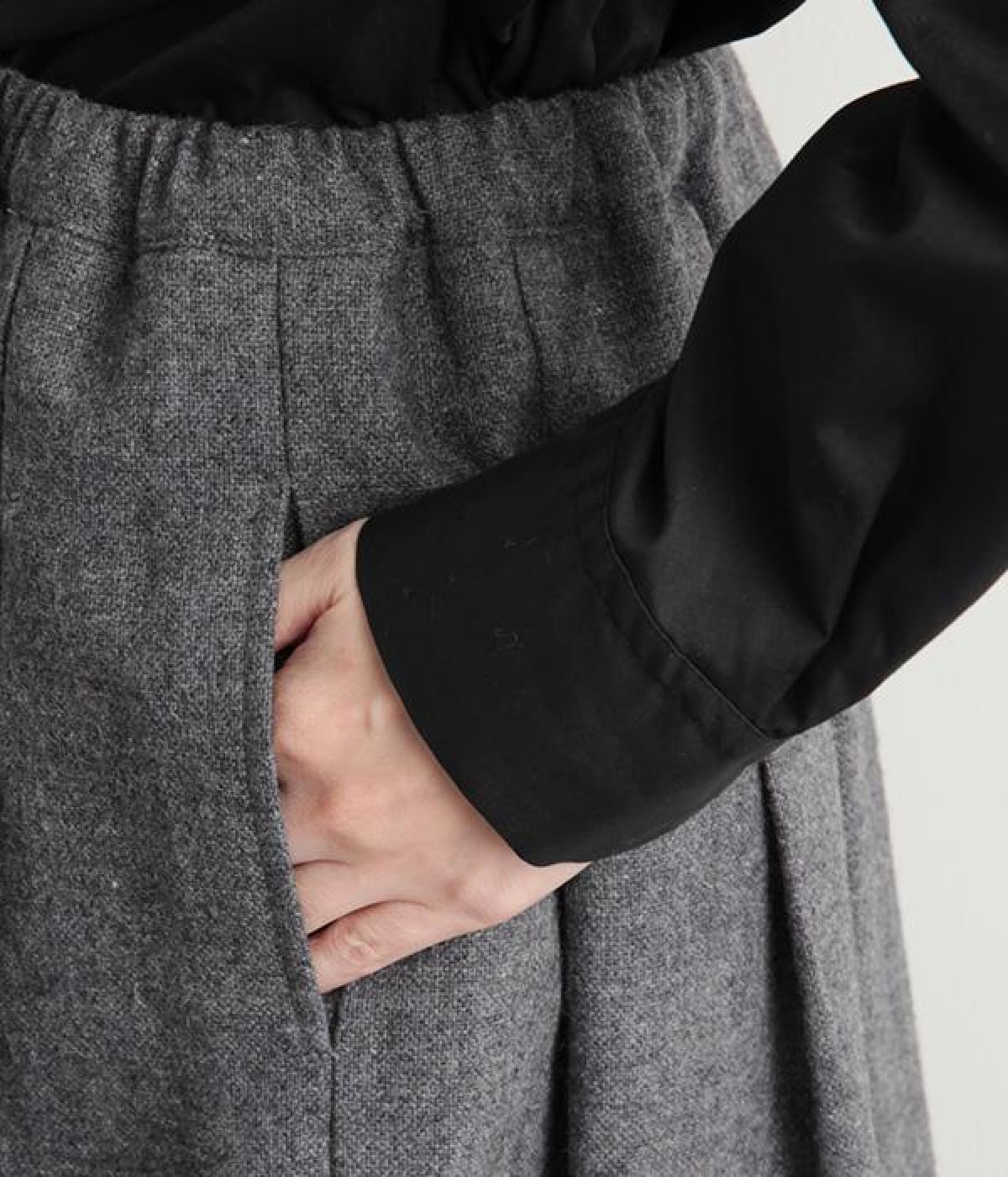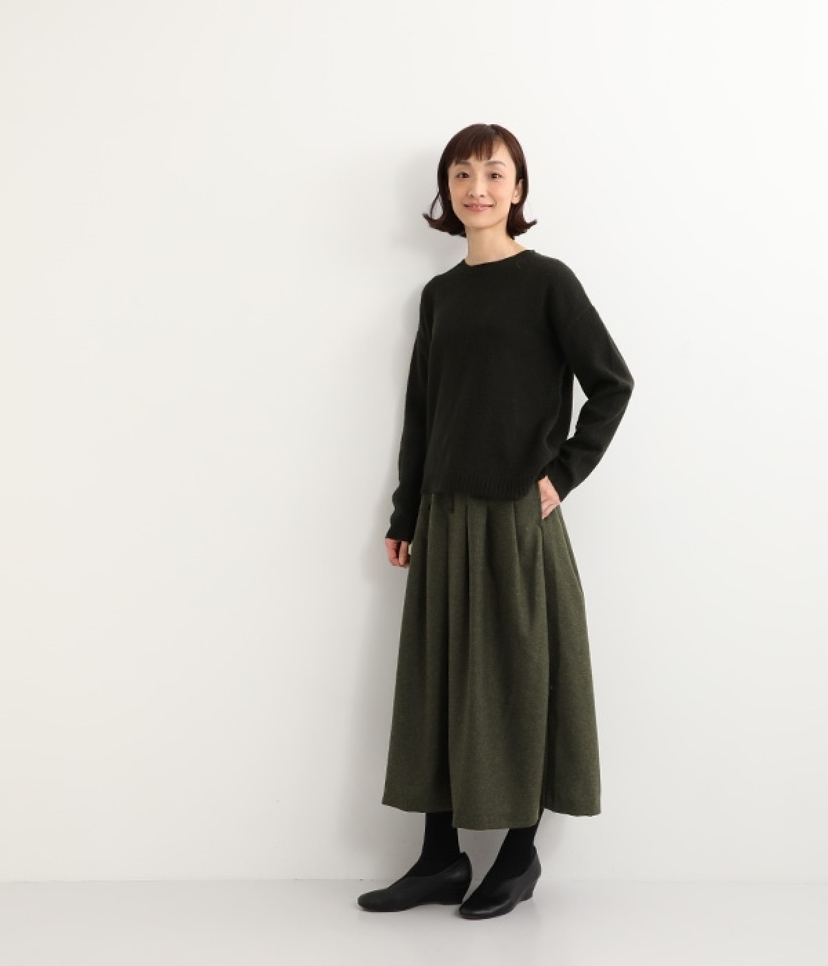 あたたかなウール混素材のスカートです。フェミニンな雰囲気漂う、ロング丈のAラインシルエットが魅力的。中縫いをしたタックがウエスト周りをすっきりと見せてくれます。ウエストは総ゴムに紐仕様のストレスフリーなはき心地。どんなトップスとも合わせやすいカラーもポイントです。