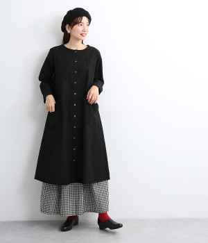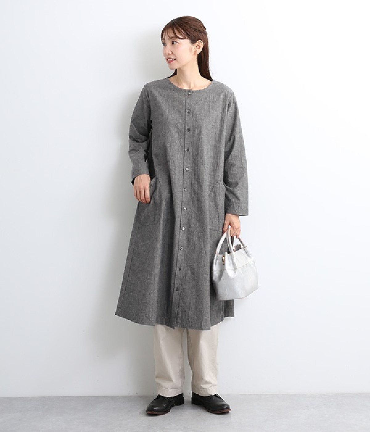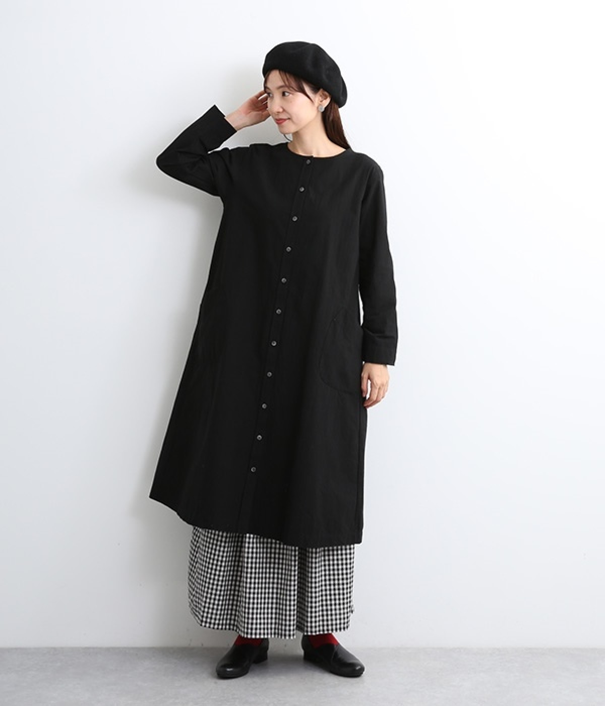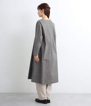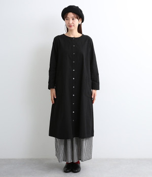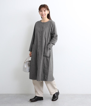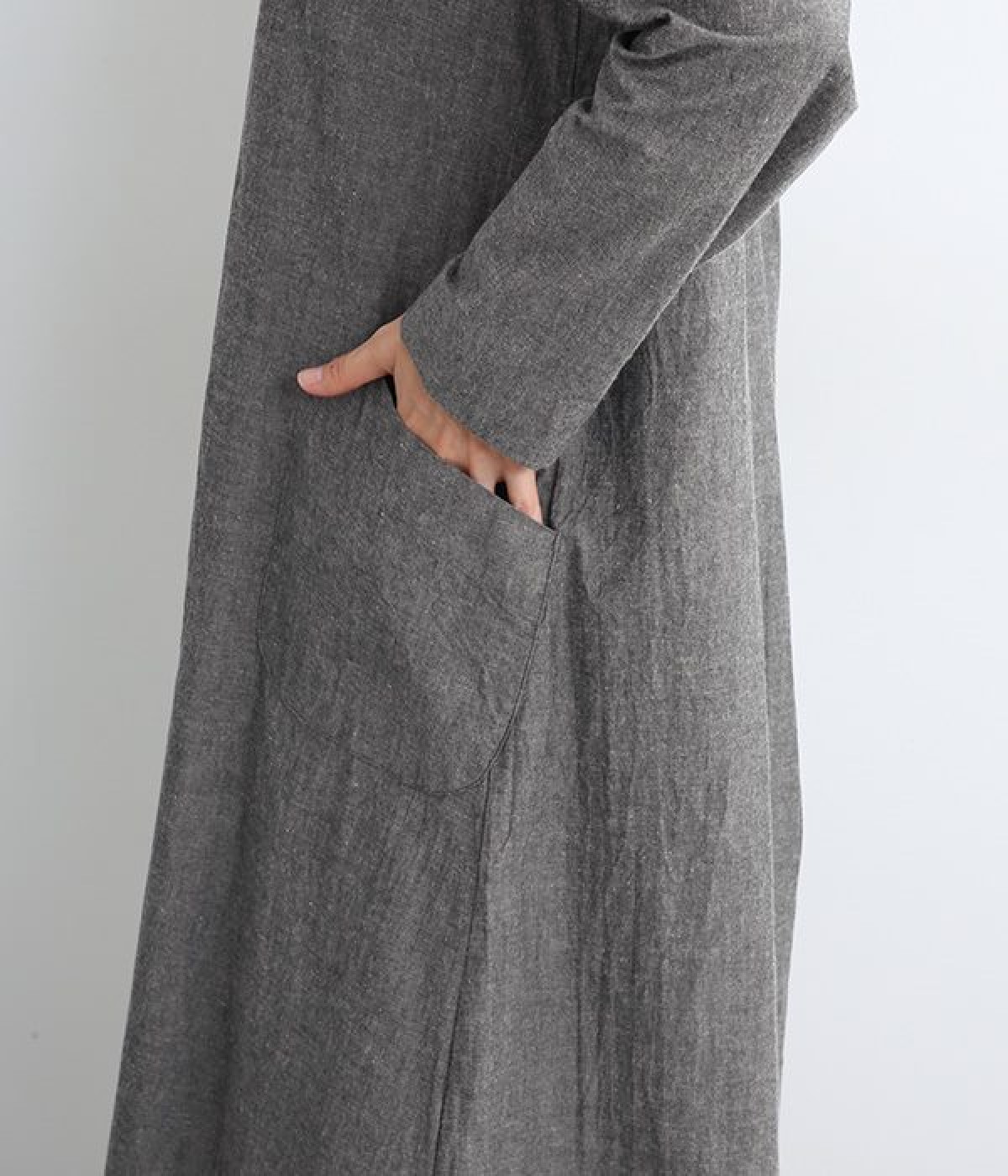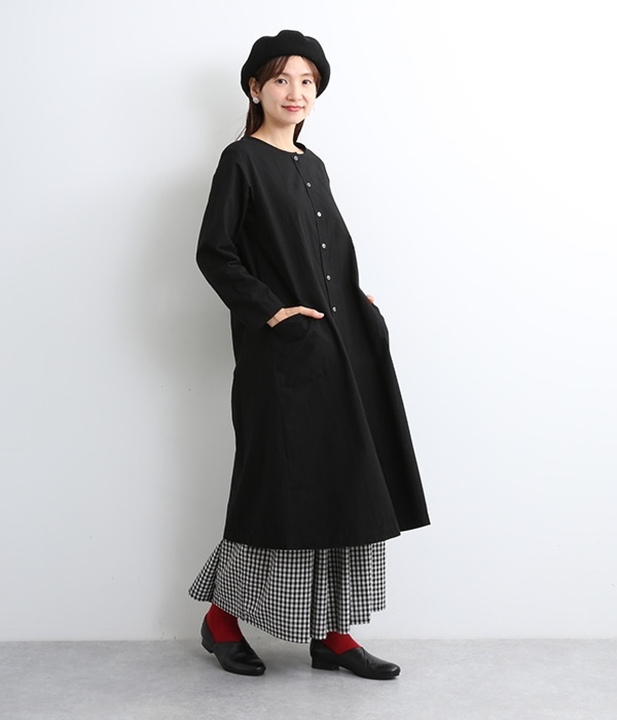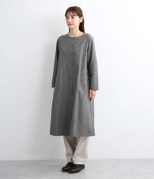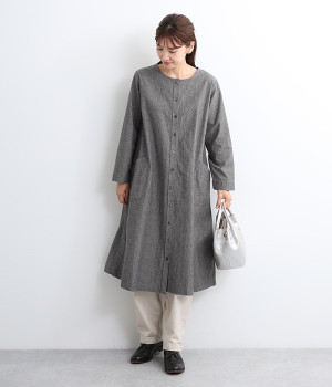 ワイドでゆったりと着られるボリューミーなシルエットが特徴のワンピースです。前あきなのでコートワンピースのようにレイヤードが楽しめるデザイン。ゆとりのあるラウンドカラーは顔まわりをすっきりと見せ、タートルネックなどカットソーをインナーに合わせることもできます。コットンベースにリネンを混ぜたやわらかく軽い着心地で、レイヤードスタイルを重たく見せません。