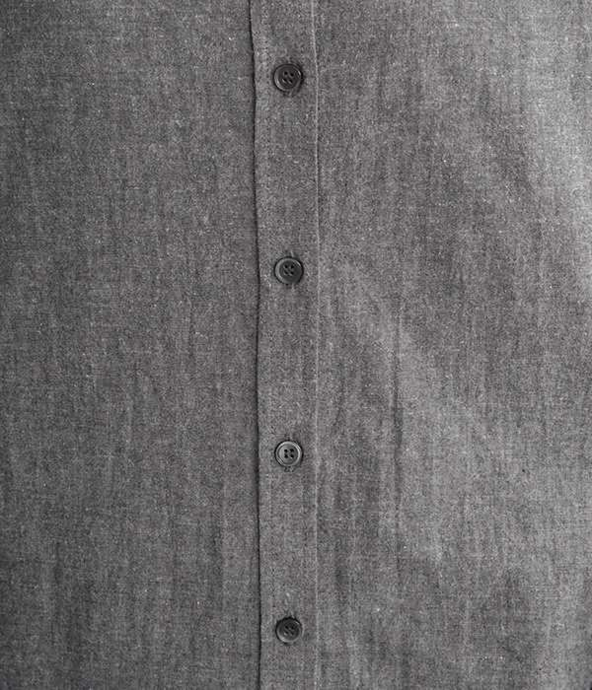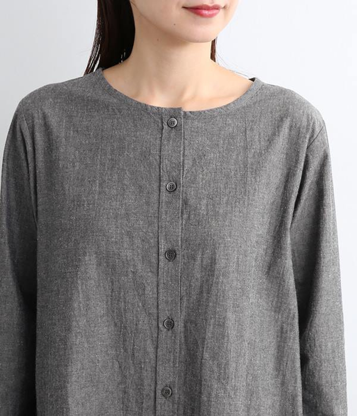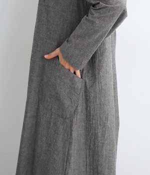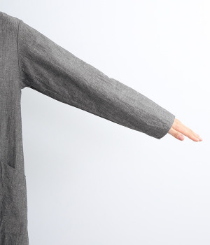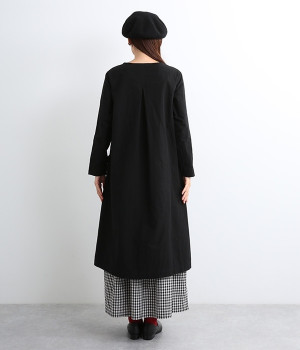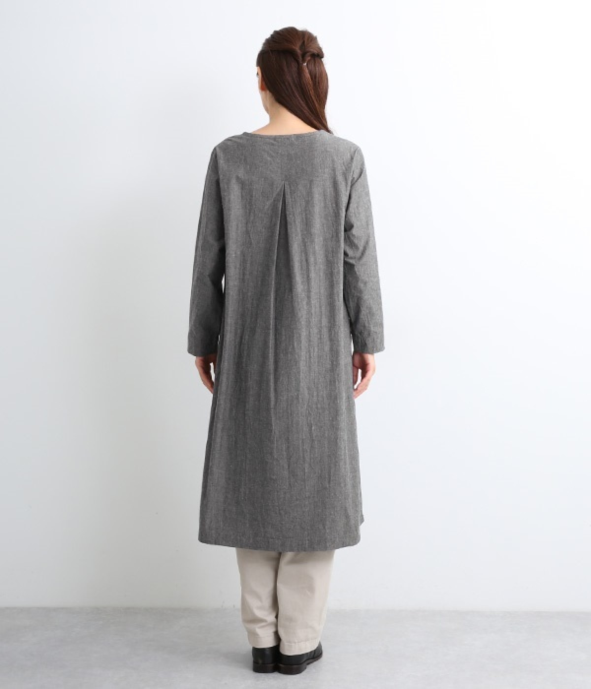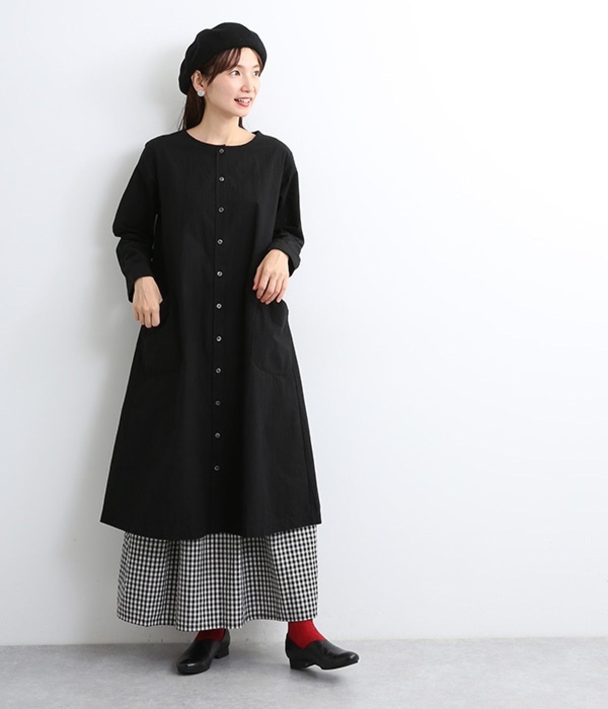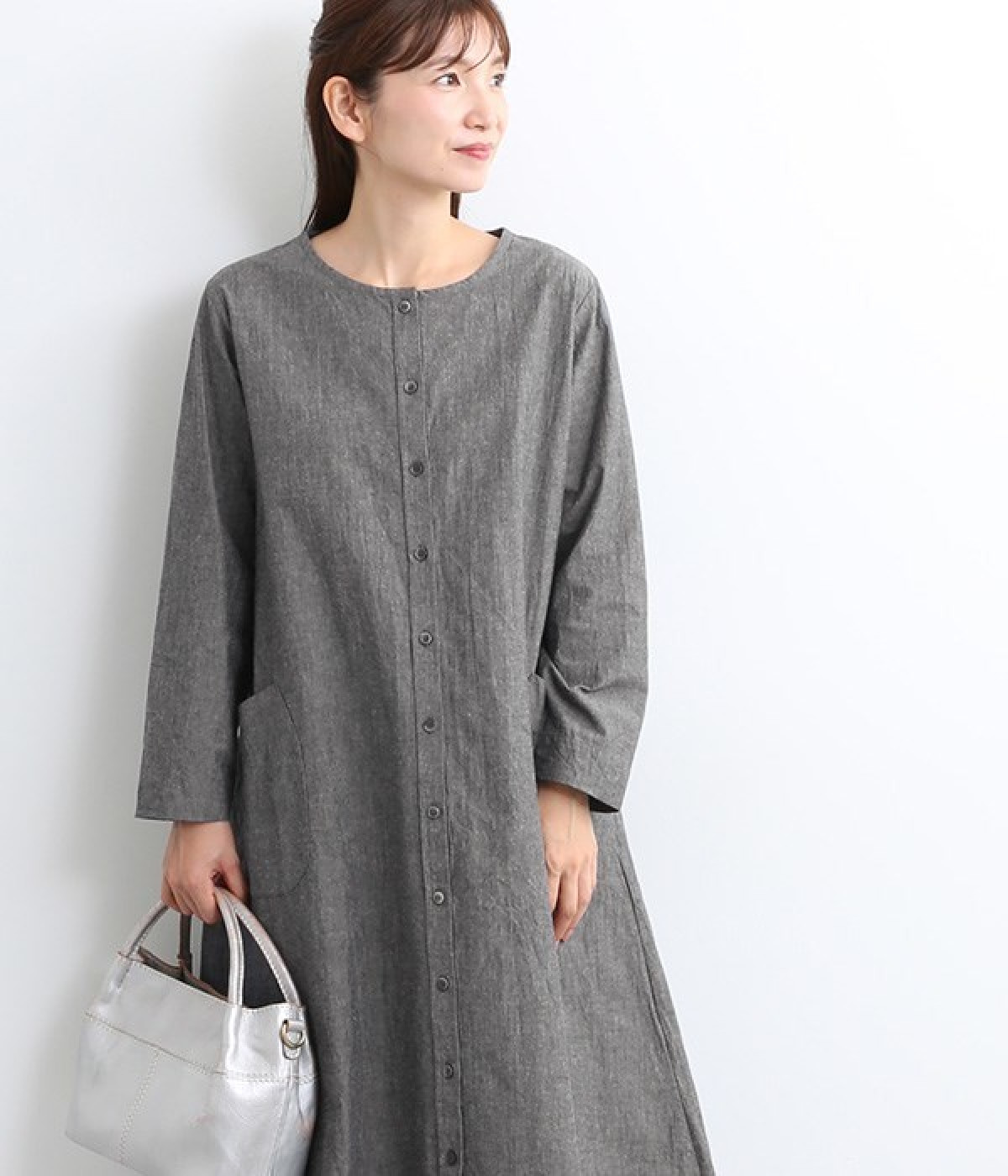 ワイドでゆったりと着られるボリューミーなシルエットが特徴のワンピースです。前あきなのでコートワンピースのようにレイヤードが楽しめるデザイン。ゆとりのあるラウンドカラーは顔まわりをすっきりと見せ、タートルネックなどカットソーをインナーに合わせることもできます。コットンベースにリネンを混ぜたやわらかく軽い着心地で、レイヤードスタイルを重たく見せません。