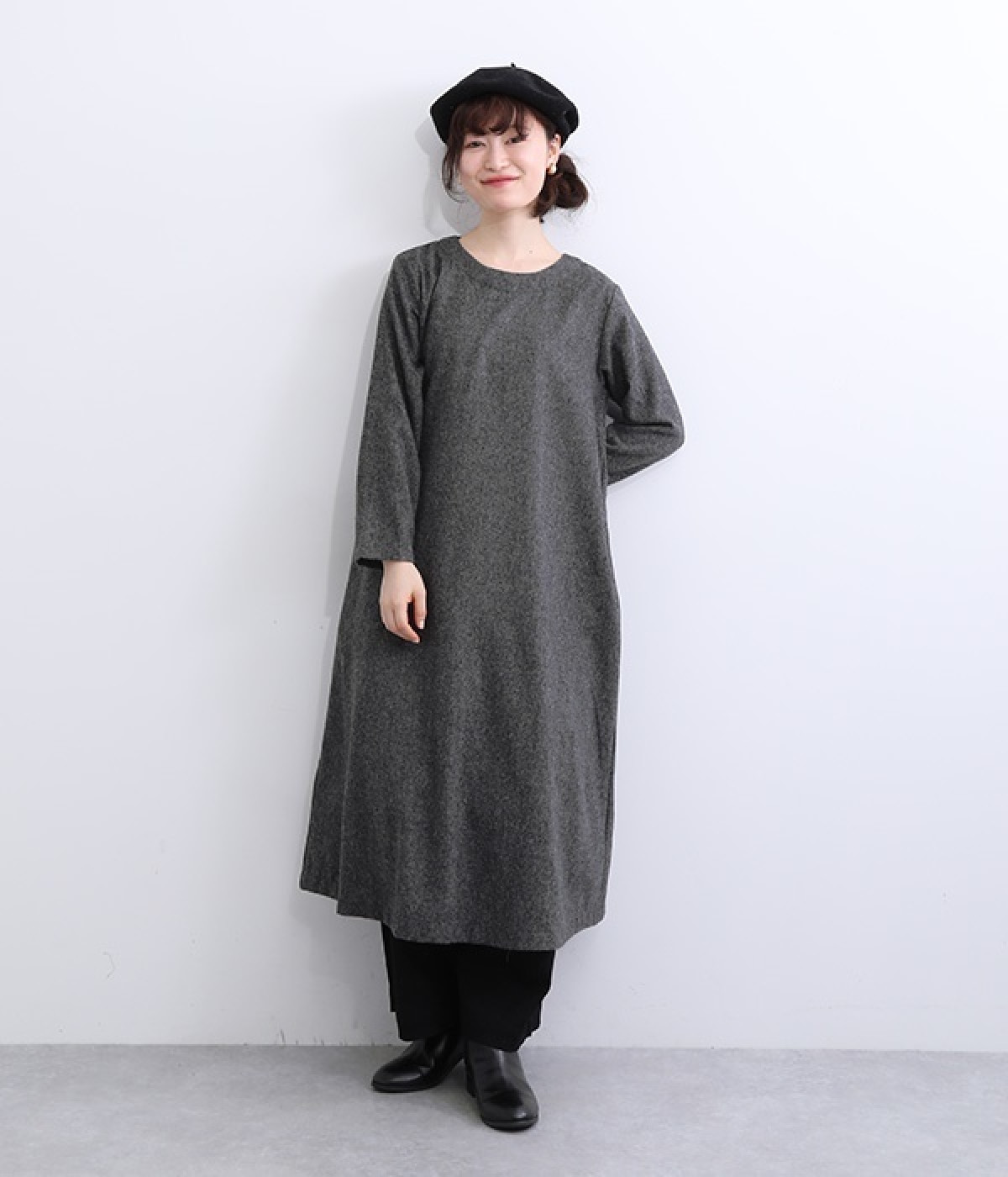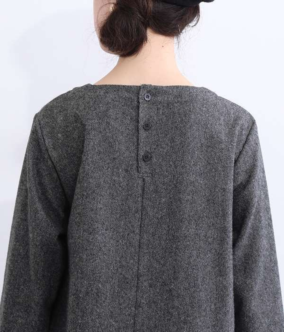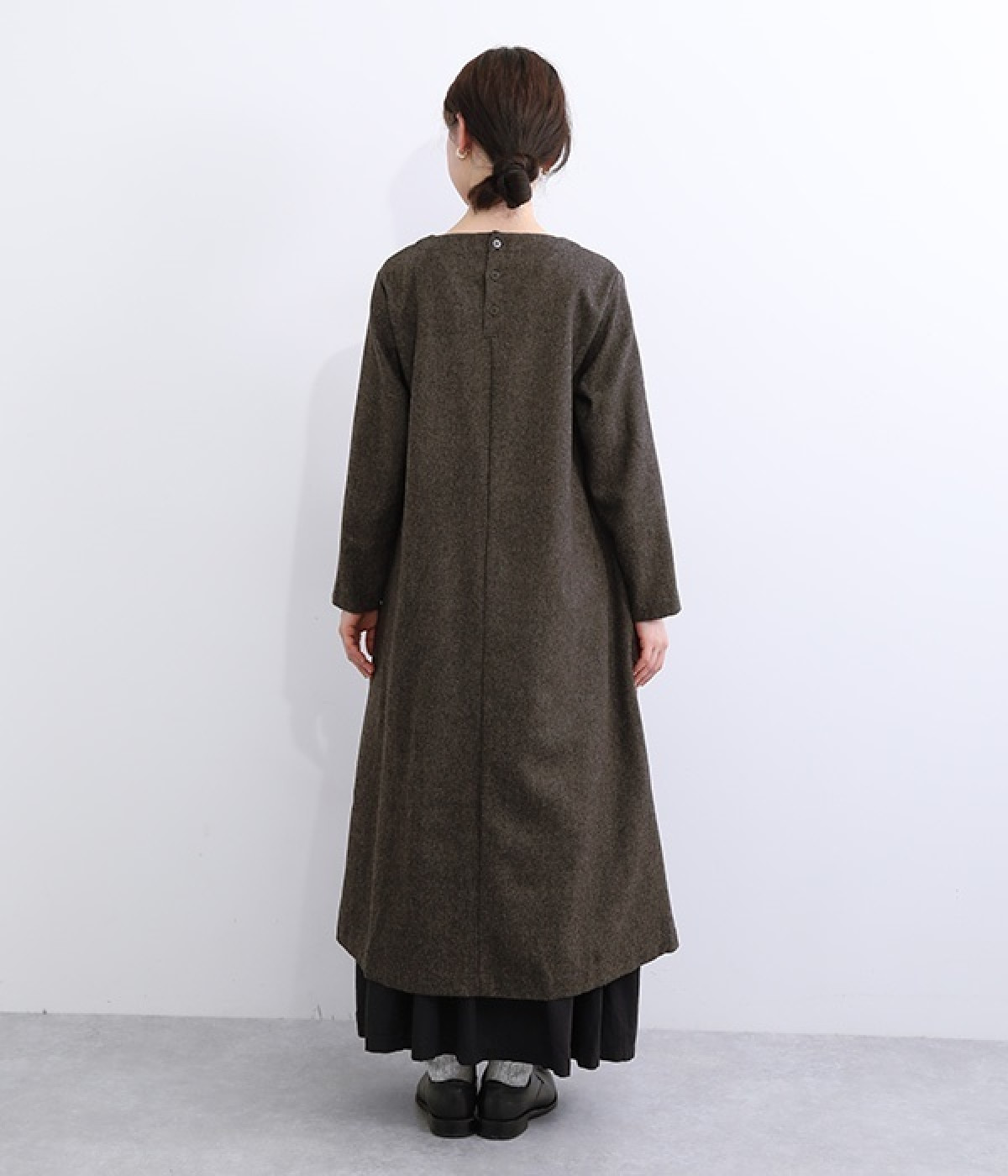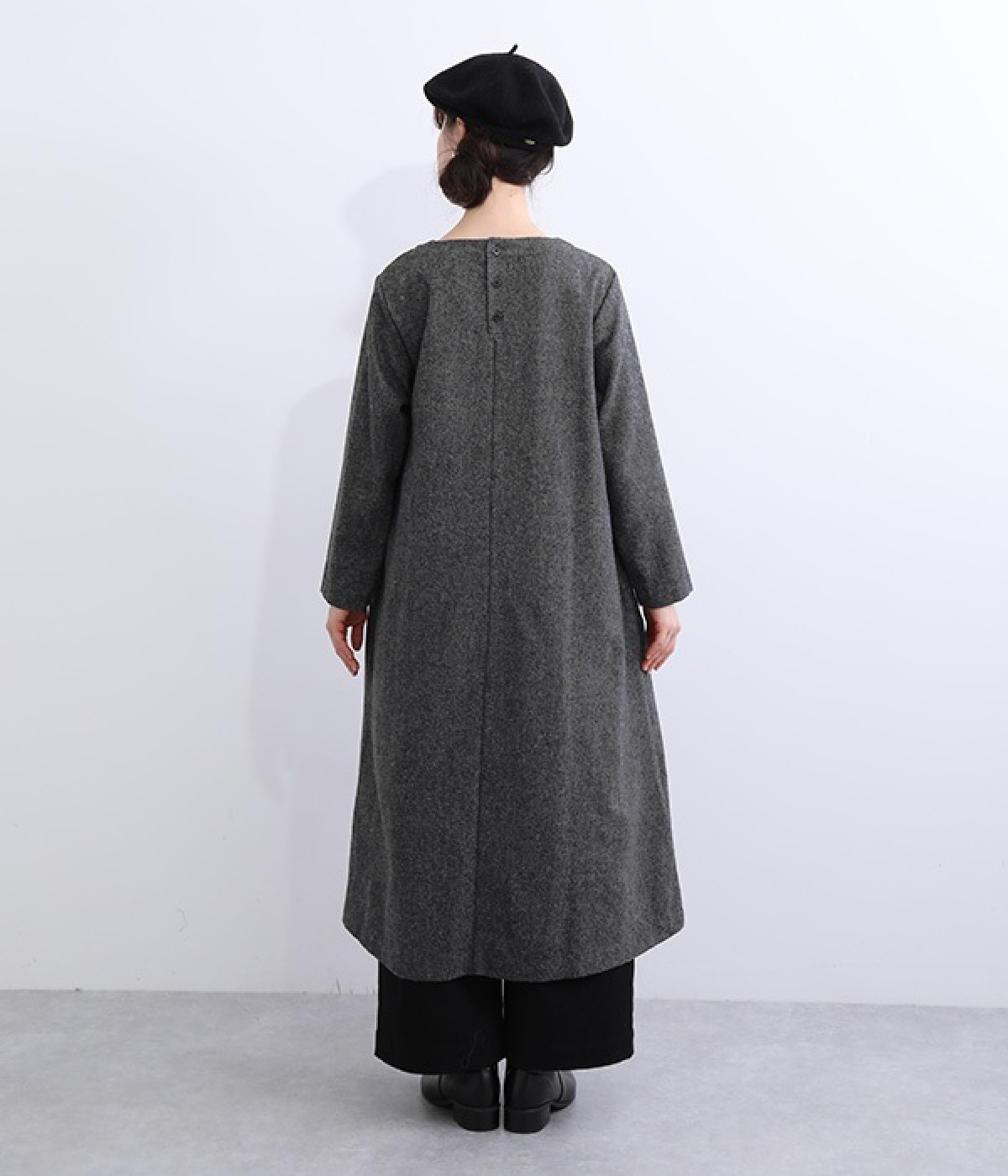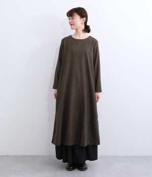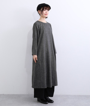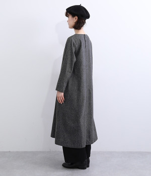 着こなし次第でカジュアルにもフォーマルにも楽しめるワンピースです。ネップのツイード生地を採用し、あたたかみと品の良さがある風合いに仕上がっています。シンプルなデザインが生地の持つクラシカルな雰囲気を引き立て、アクセサリー合わせも楽しめる一枚。脱ぎ着をアシストしてくれる後ろボタン開きです。