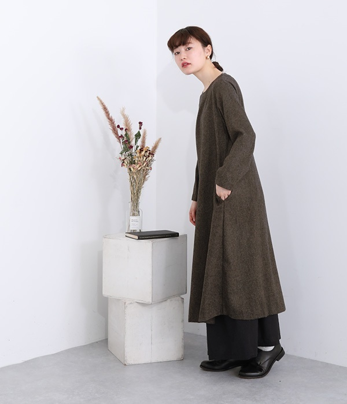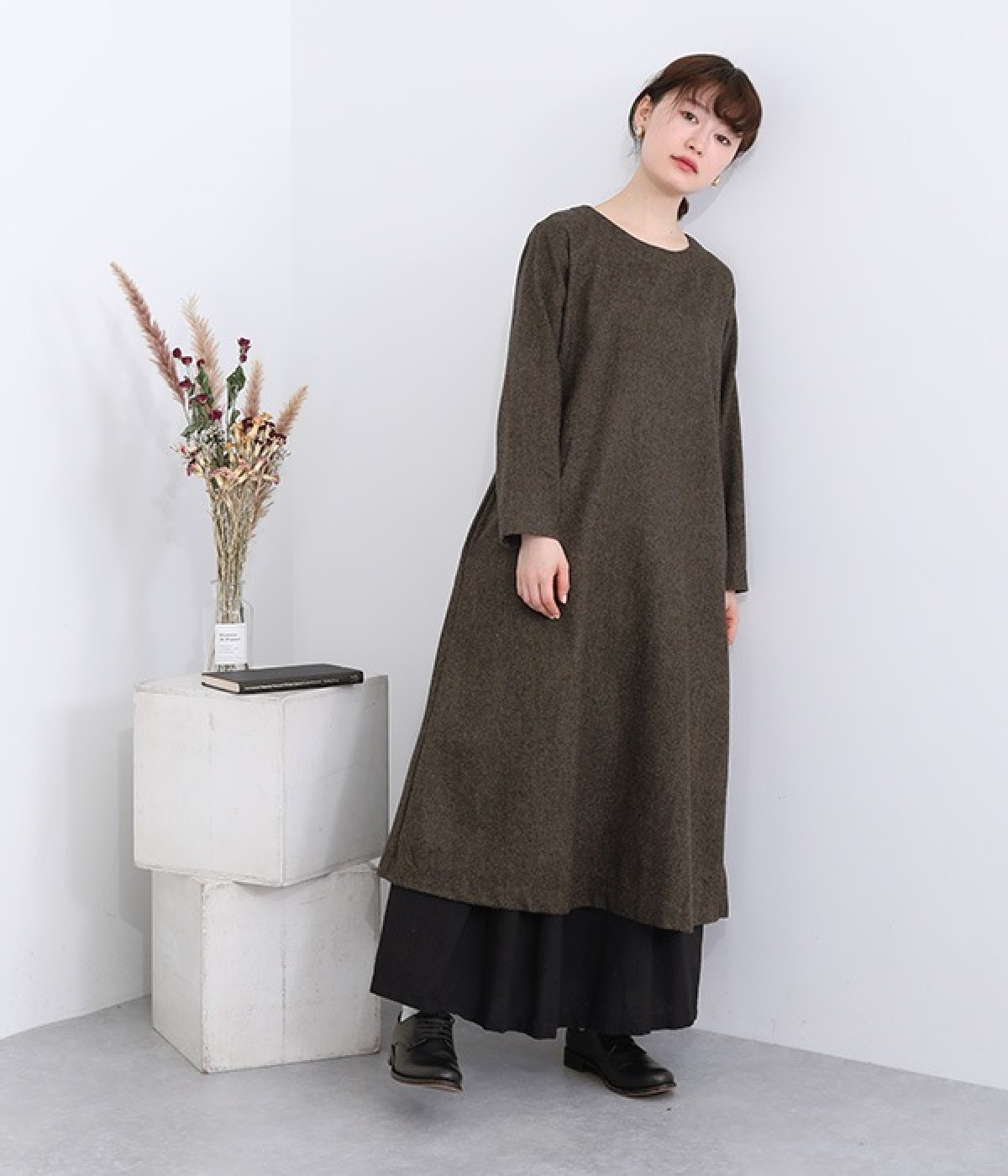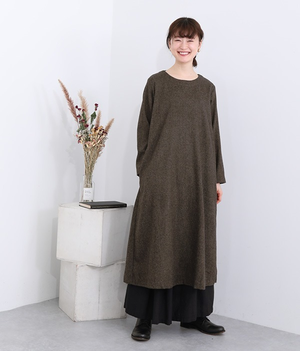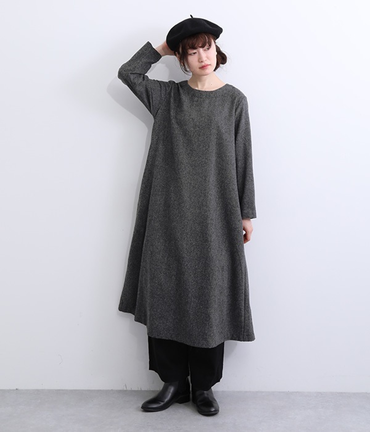 着こなし次第でカジュアルにもフォーマルにも楽しめるワンピースです。ネップのツイード生地を採用し、あたたかみと品の良さがある風合いに仕上がっています。シンプルなデザインが生地の持つクラシカルな雰囲気を引き立て、アクセサリー合わせも楽しめる一枚。脱ぎ着をアシストしてくれる後ろボタン開きです。