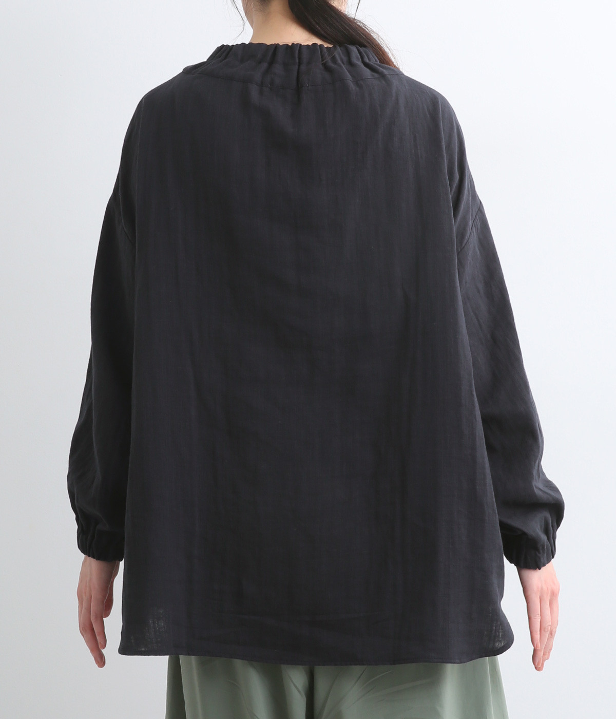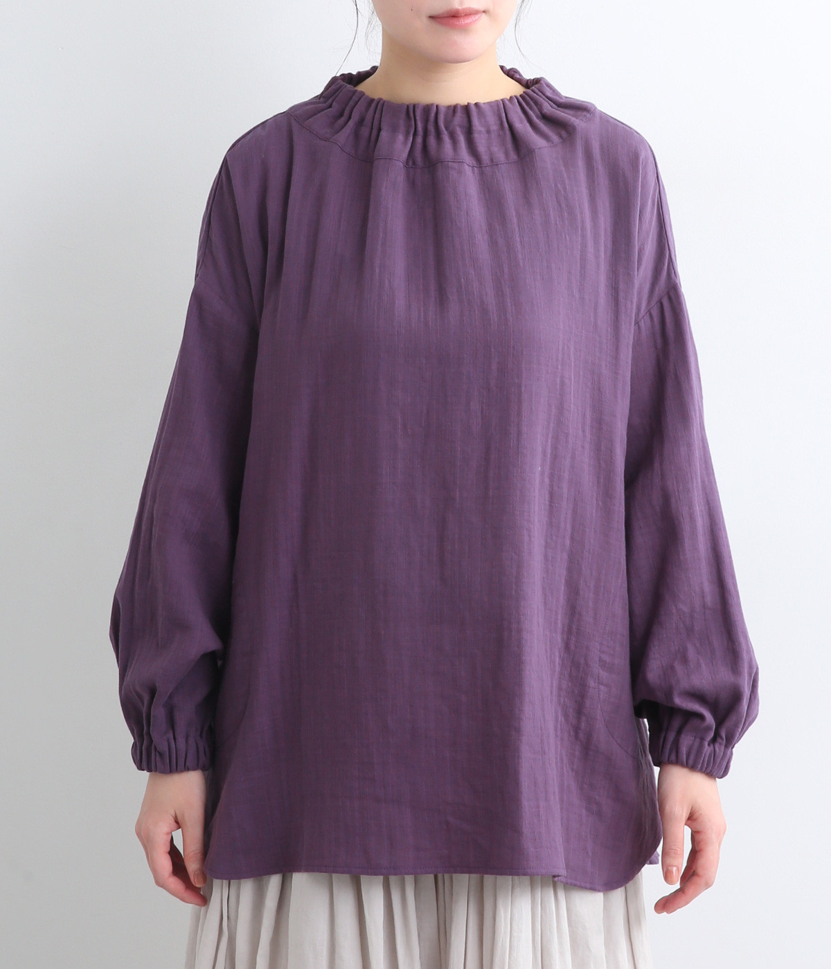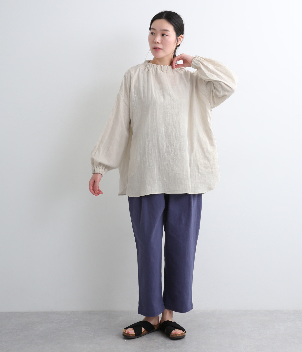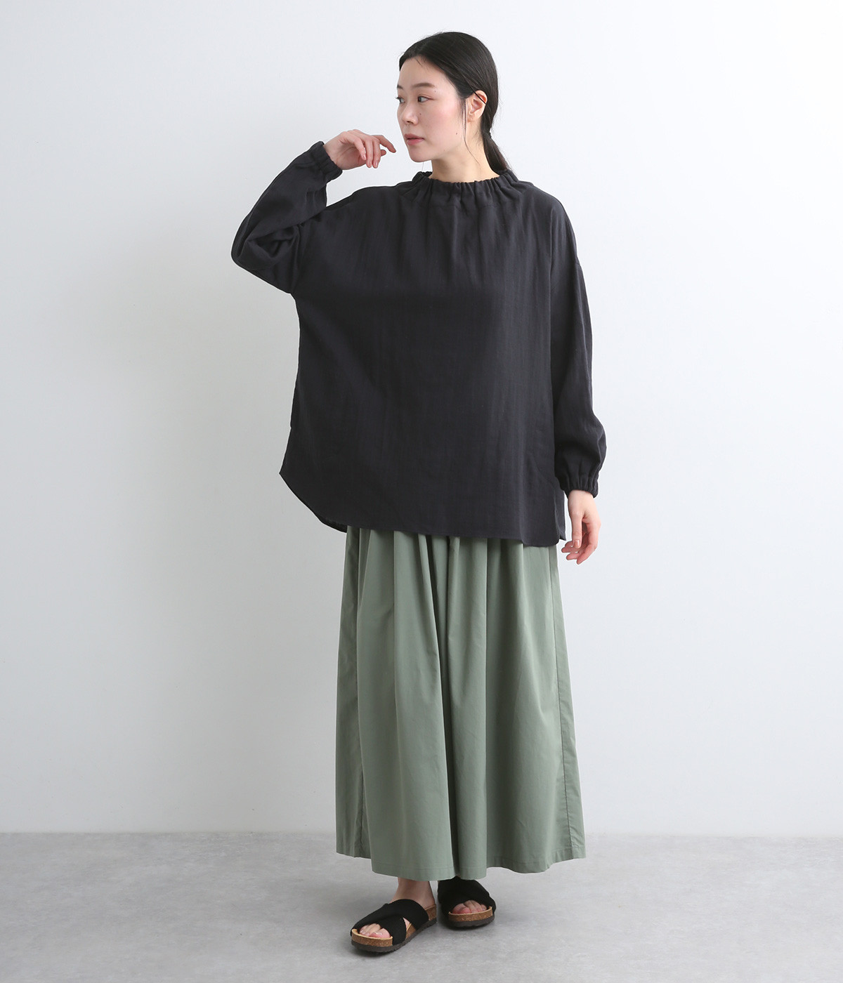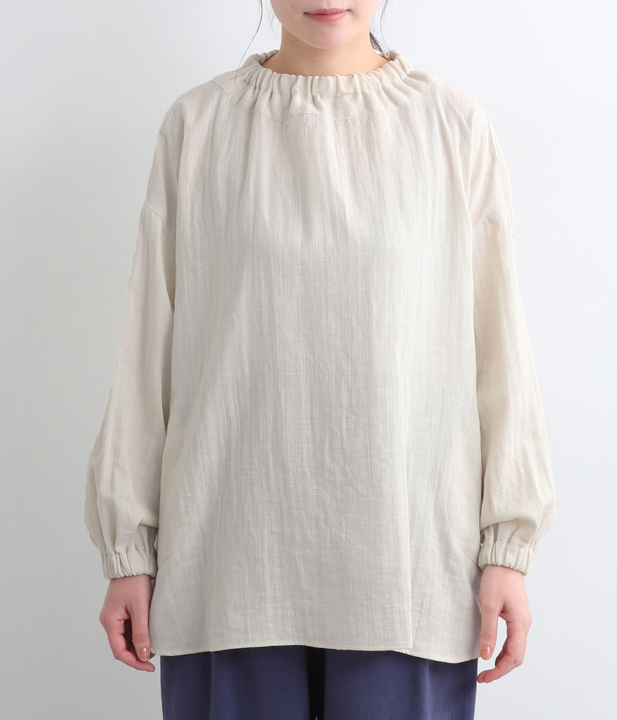 ゴムを入れてギャザーを寄せたボトルネックが印象的で、袖口も同様になっているのでたくし上げたアレンジも◎。ややゆったりとしたチュニック丈に便利なポケットをつけた、デイリー使いに最適な仕様です。