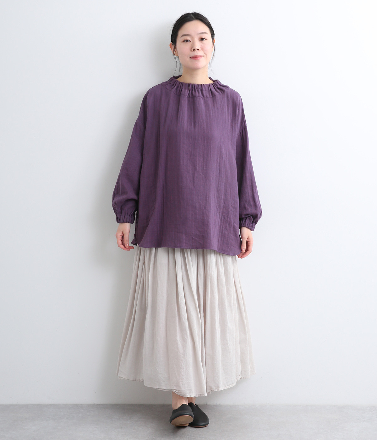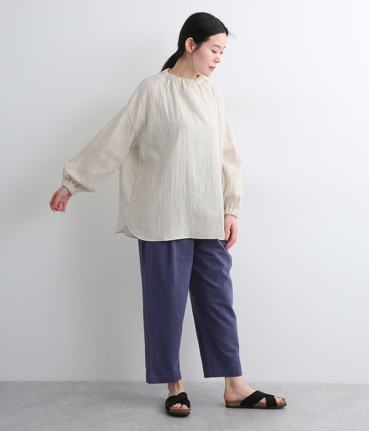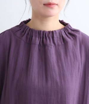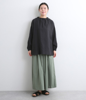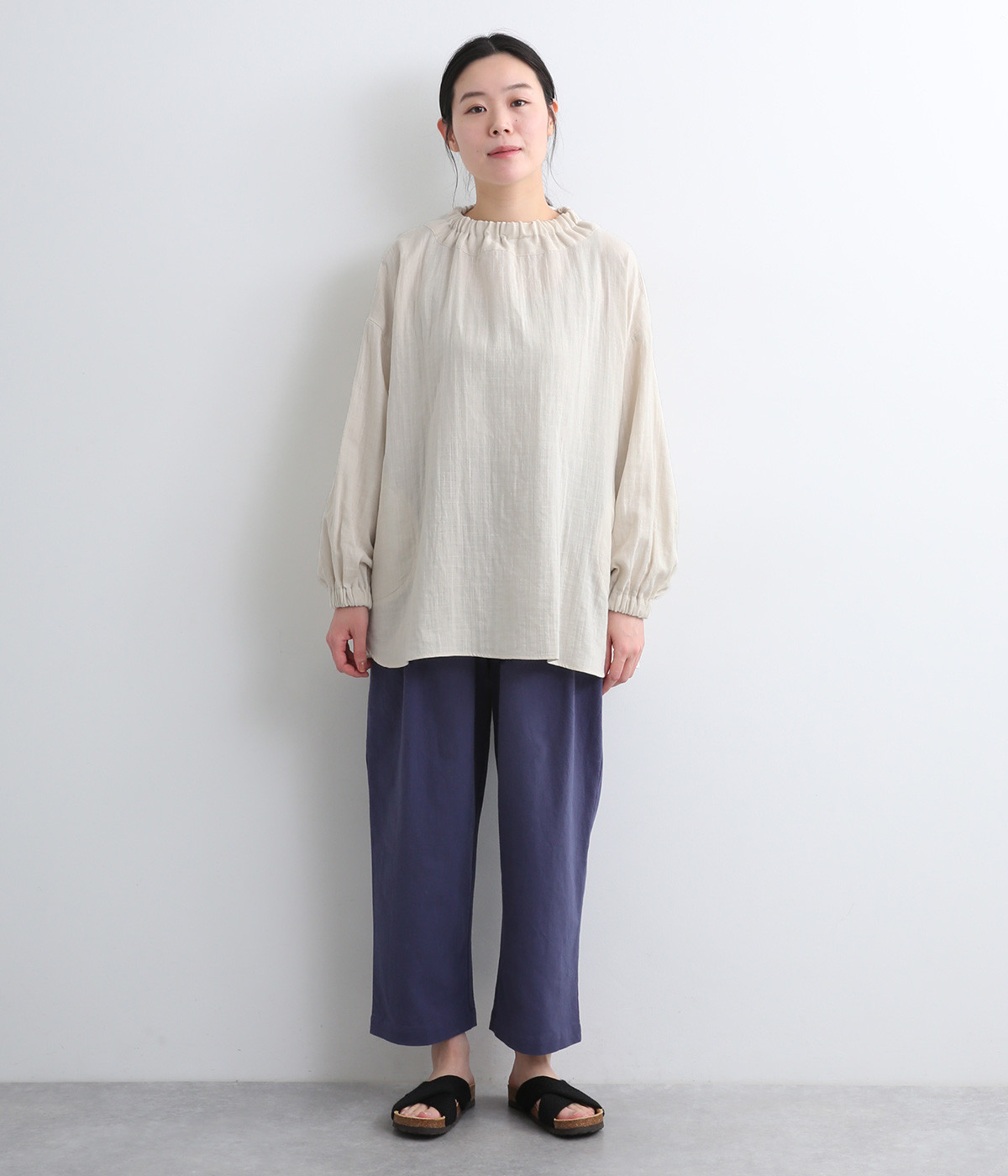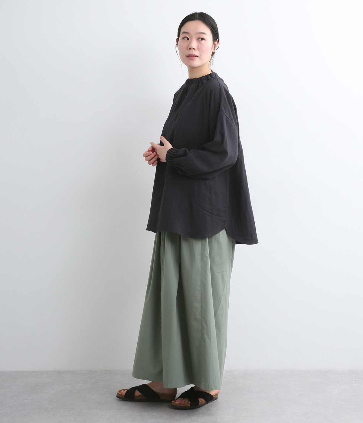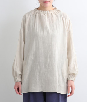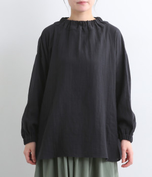 ゴムを入れてギャザーを寄せたボトルネックが印象的で、袖口も同様になっているのでたくし上げたアレンジも◎。ややゆったりとしたチュニック丈に便利なポケットをつけた、デイリー使いに最適な仕様です。