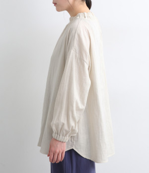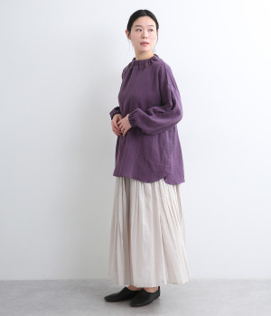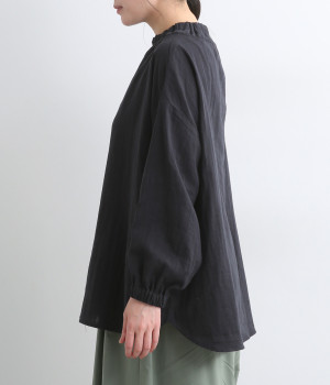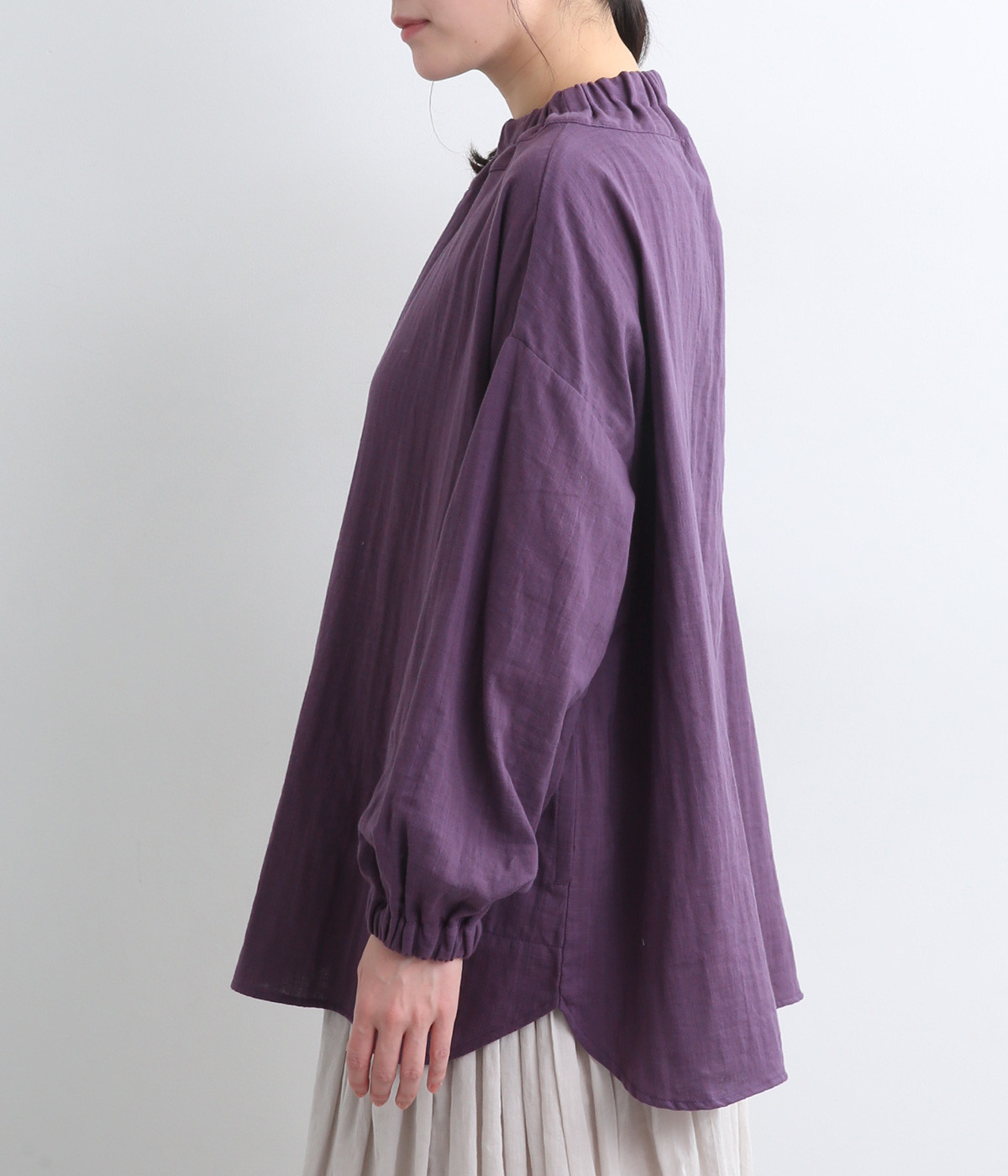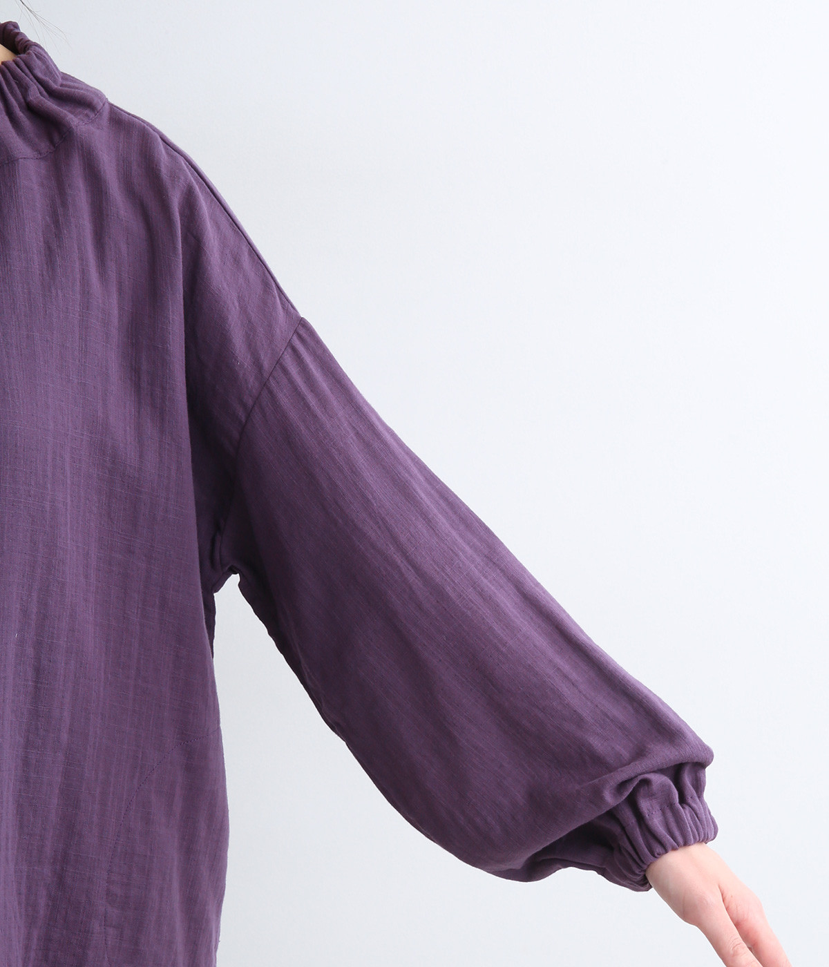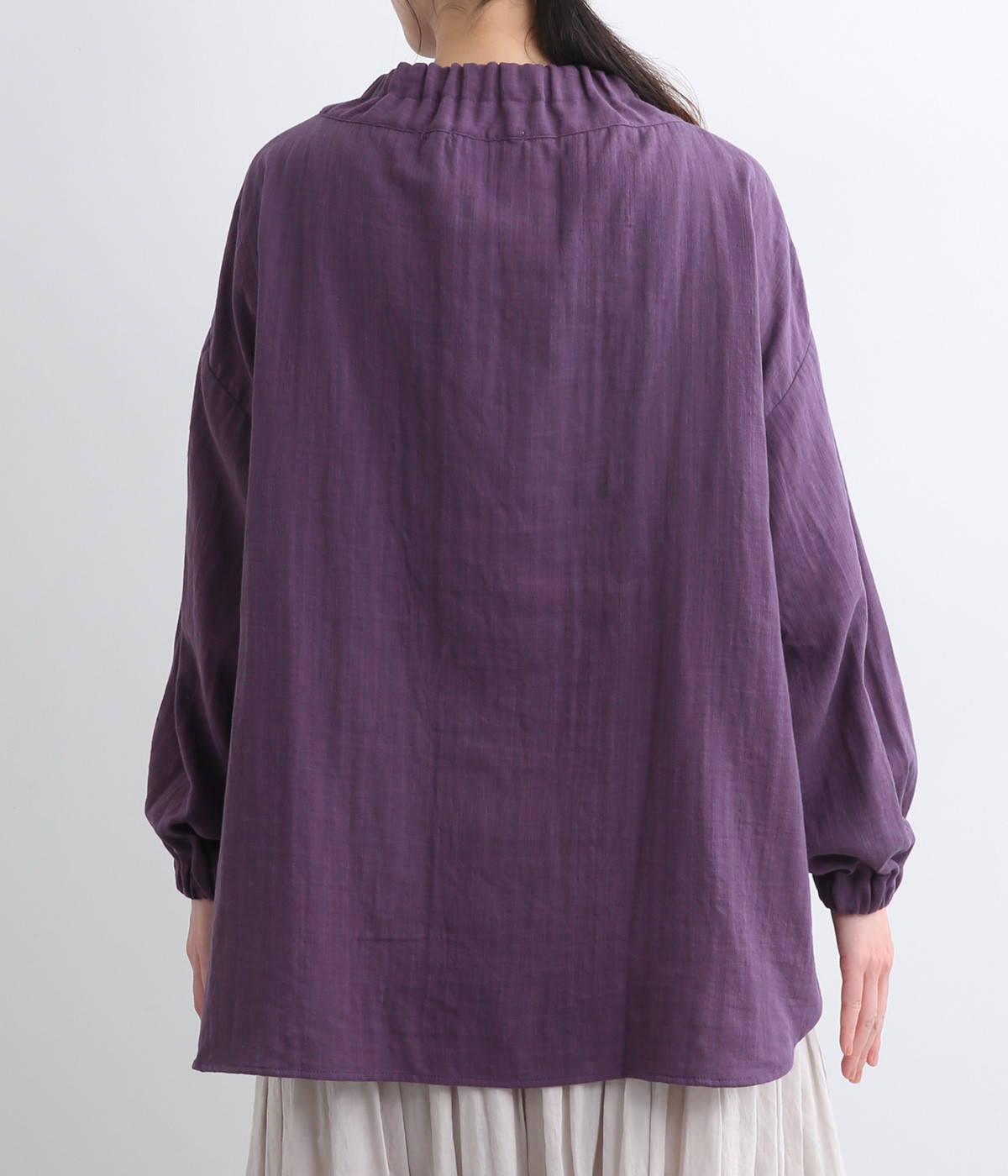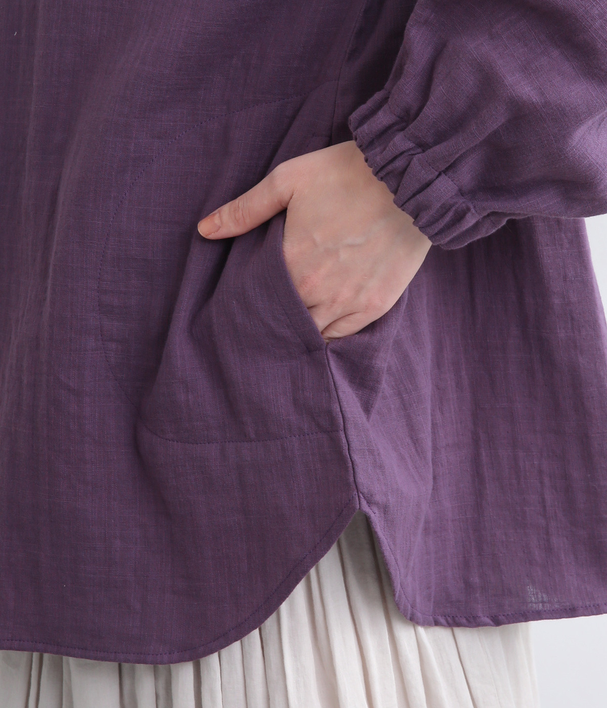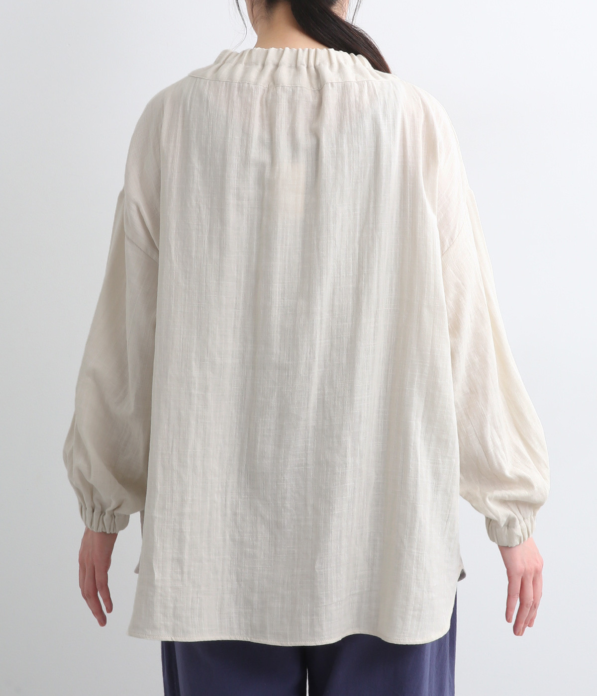 ゴムを入れてギャザーを寄せたボトルネックが印象的で、袖口も同様になっているのでたくし上げたアレンジも◎。ややゆったりとしたチュニック丈に便利なポケットをつけた、デイリー使いに最適な仕様です。