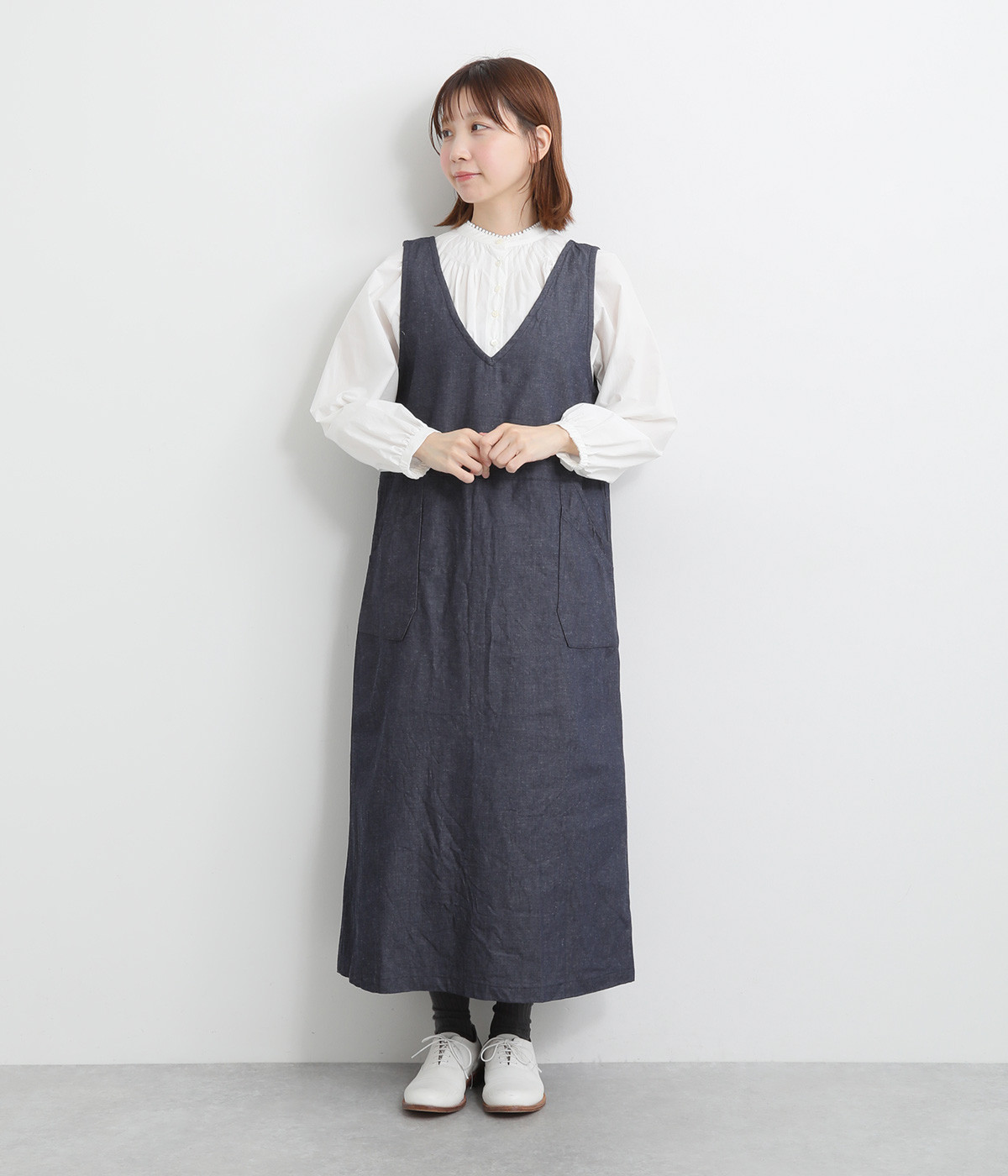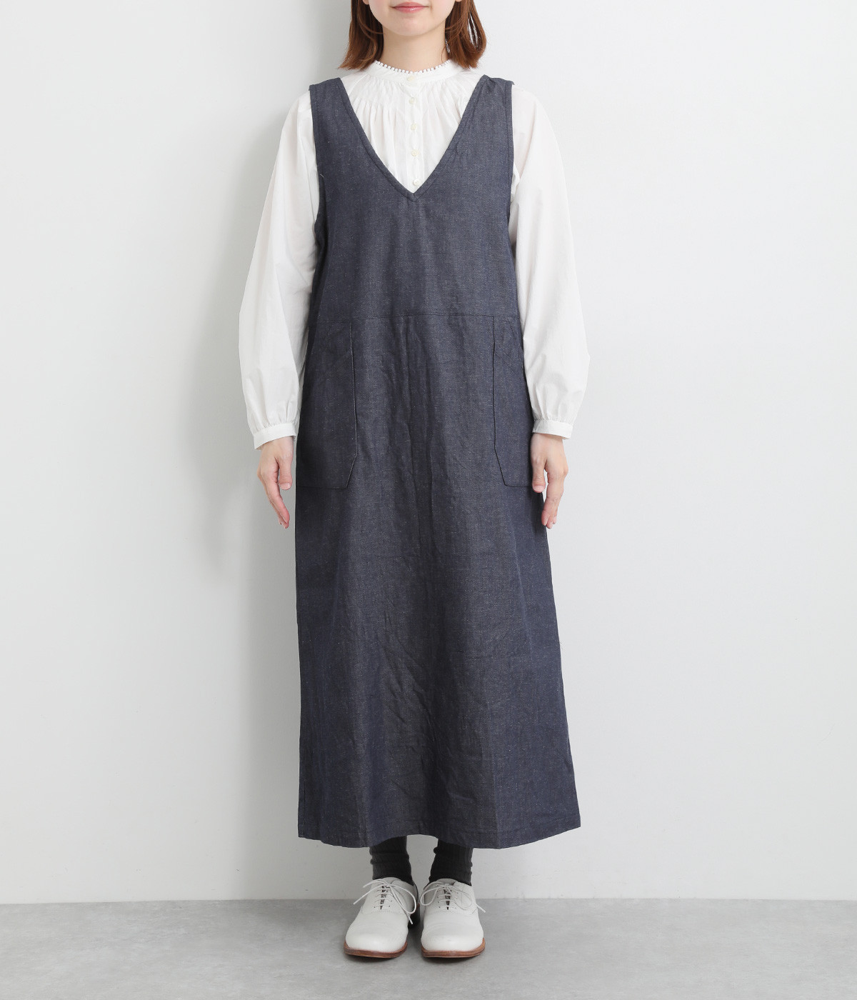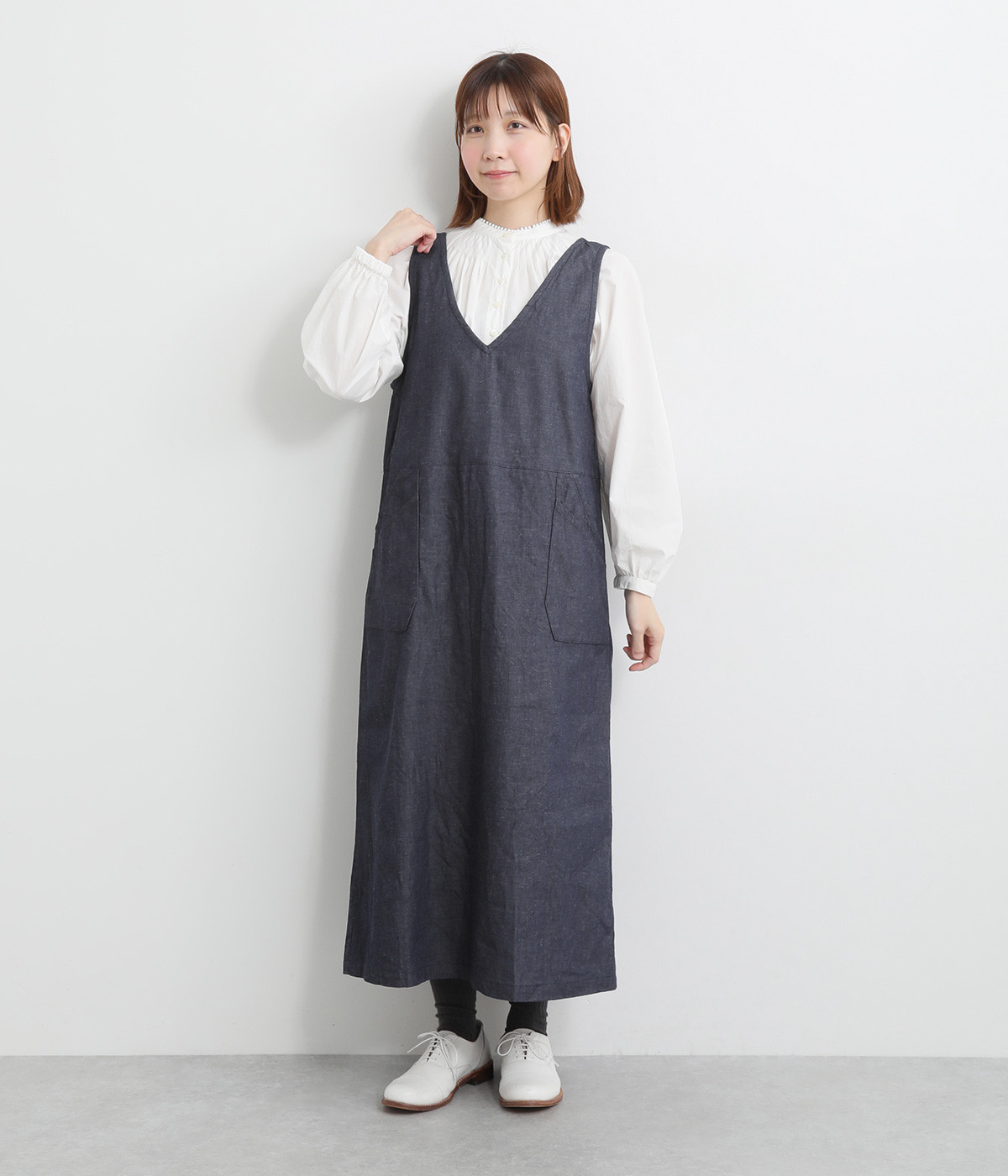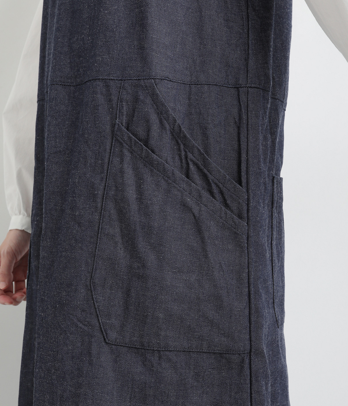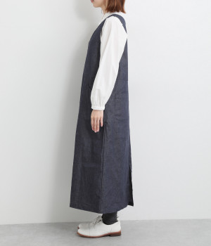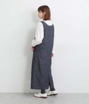 すっきりとした縦長シルエットが大人顔なジャンパースカートです。重ねポケットでさり気なくデザイン性をプラス。足さばきのいい後ろスリットに、インナー合わせが楽しめるVネックが着こなしやすいポイントです。
