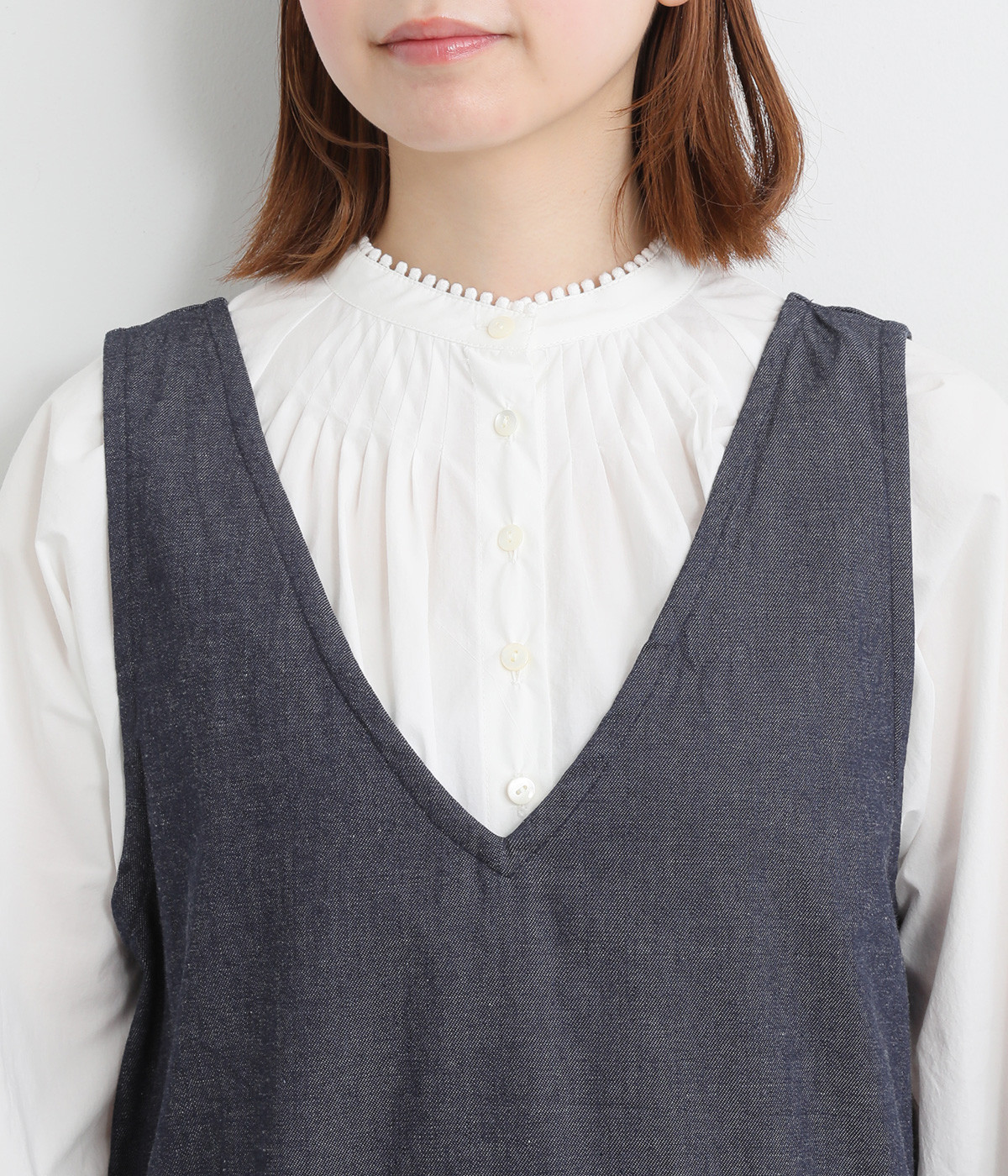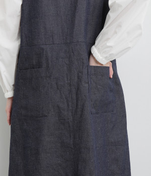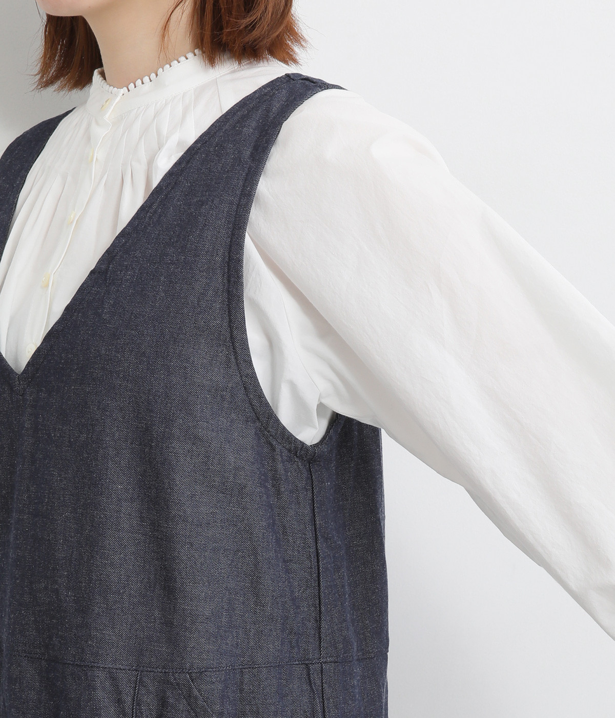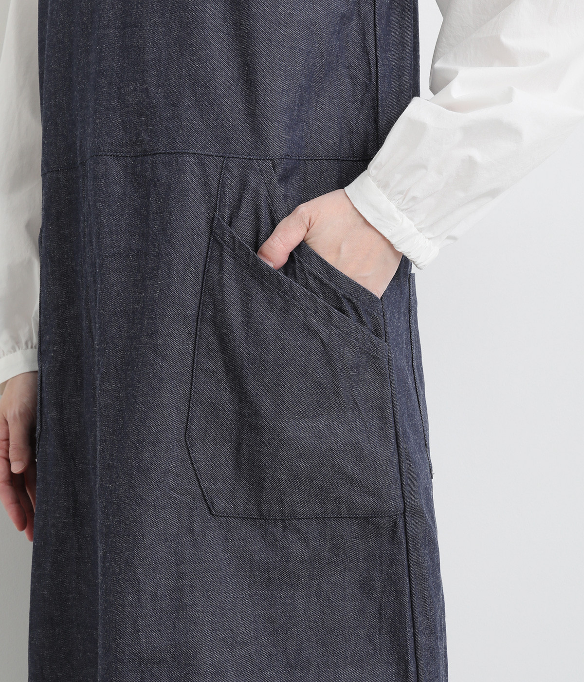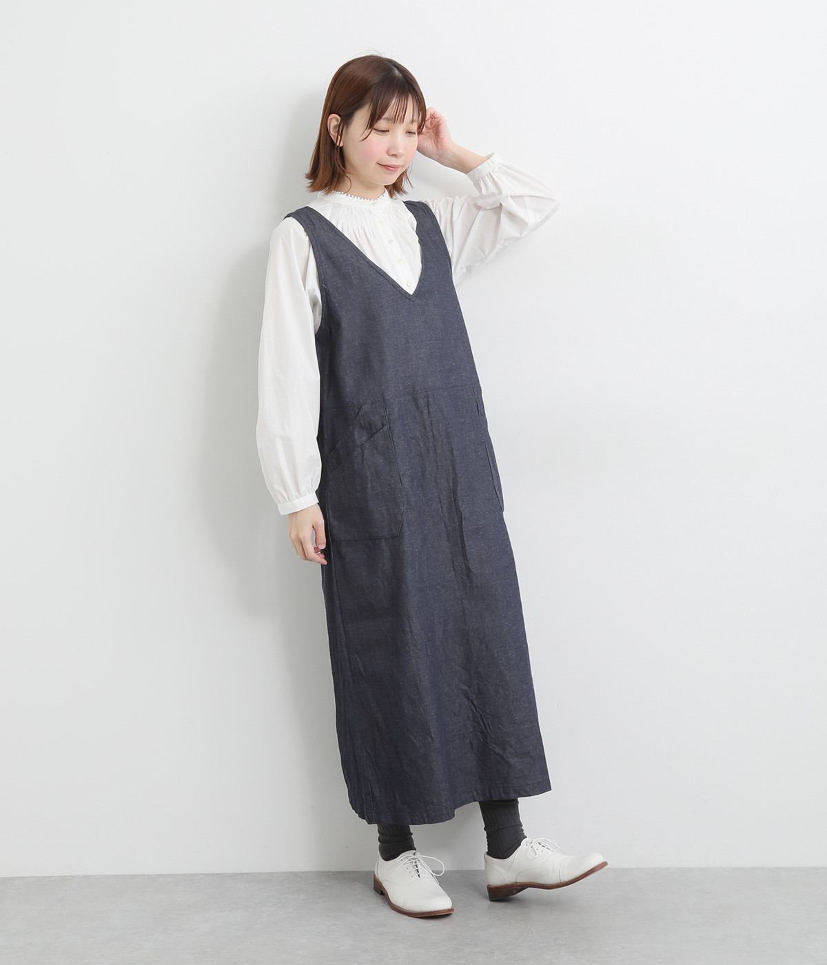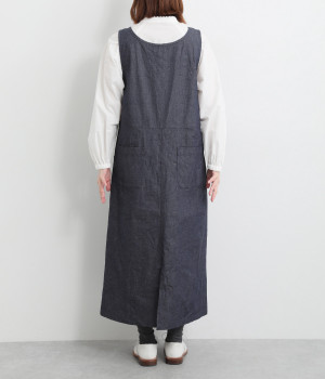 すっきりとした縦長シルエットが大人顔なジャンパースカートです。重ねポケットでさり気なくデザイン性をプラス。足さばきのいい後ろスリットに、インナー合わせが楽しめるVネックが着こなしやすいポイントです。