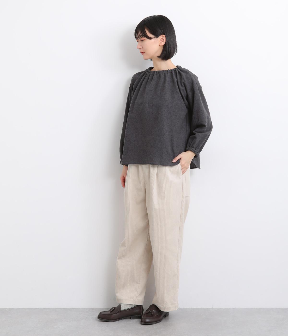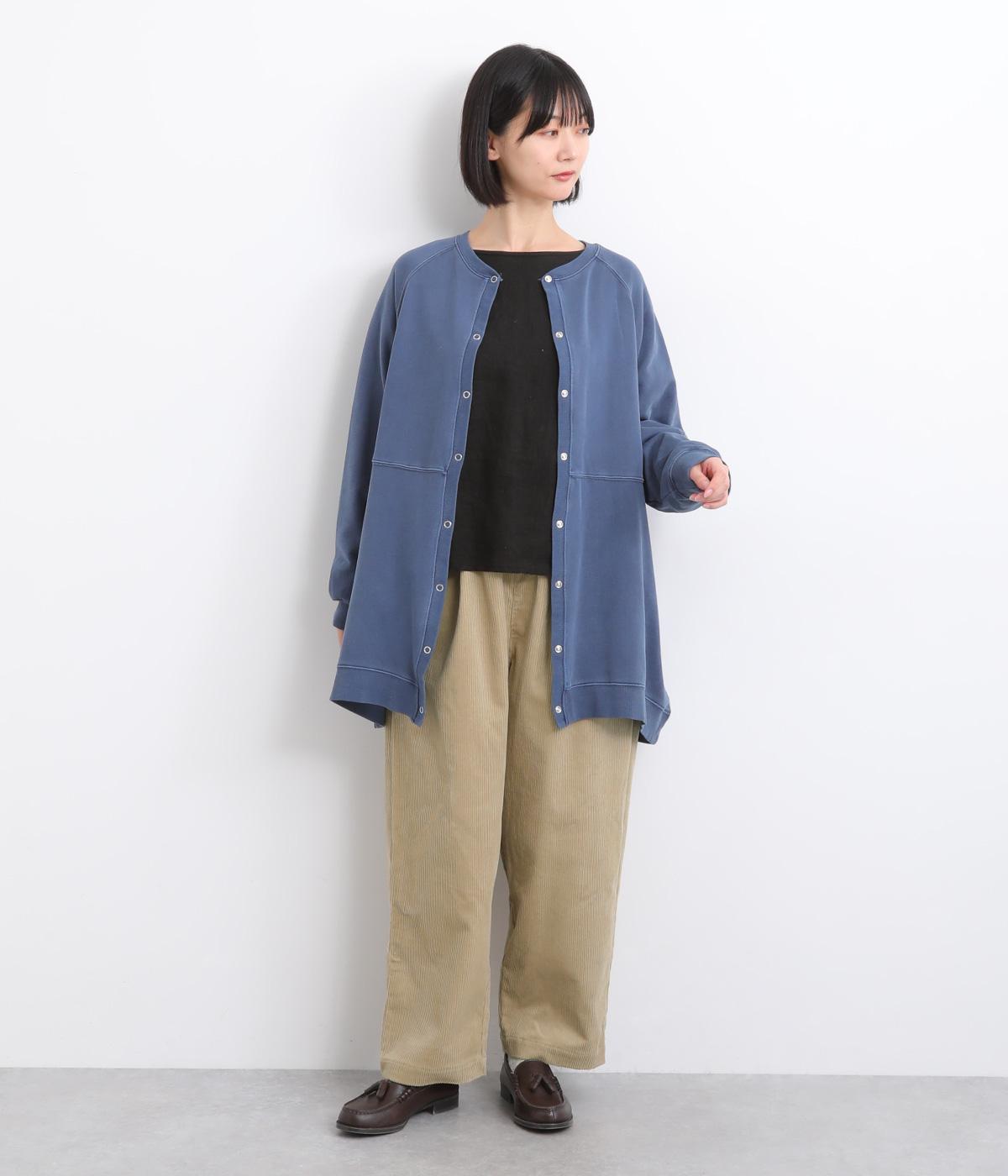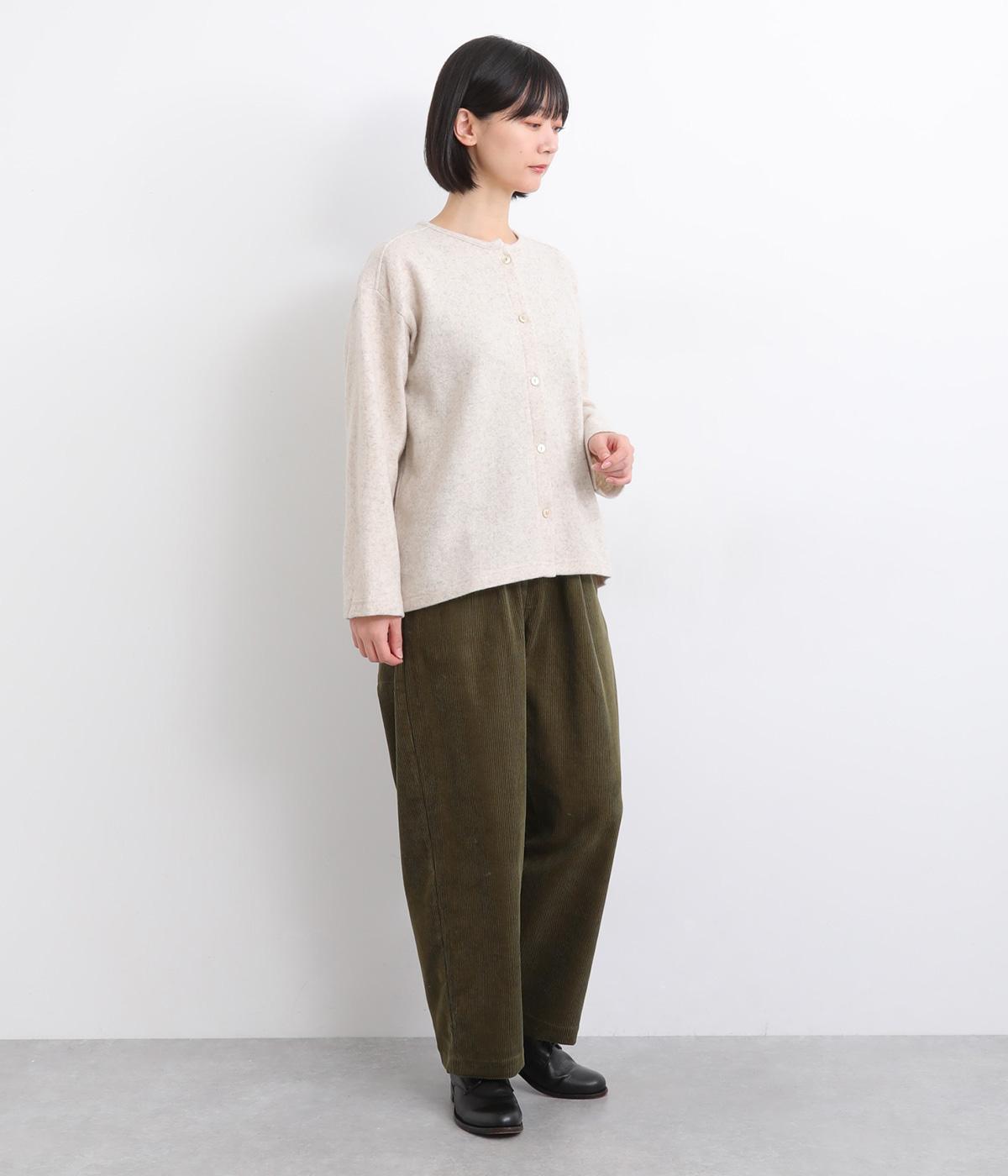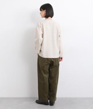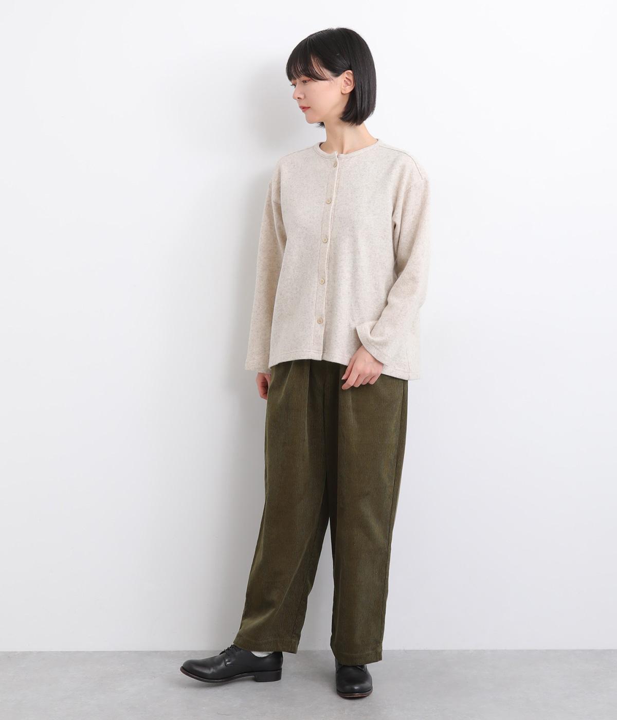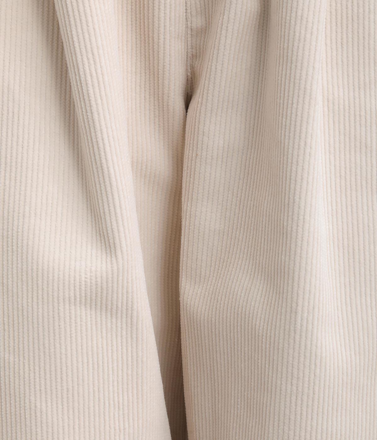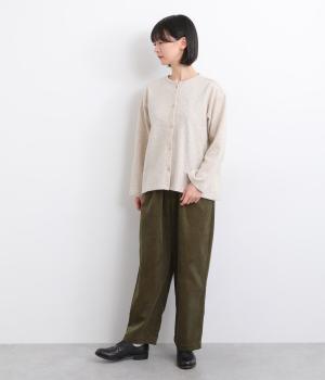 中畝のコットンコーデュロイが、あたたかみのある質感を引き立てます。やわらかさのなかにほどよい厚みがあり、肌あたりもやさしく快適です。凹凸のある表情が、季節感のある落ち着いた雰囲気に。