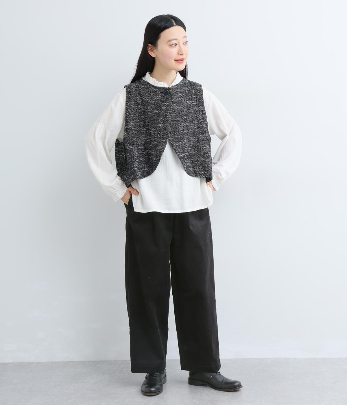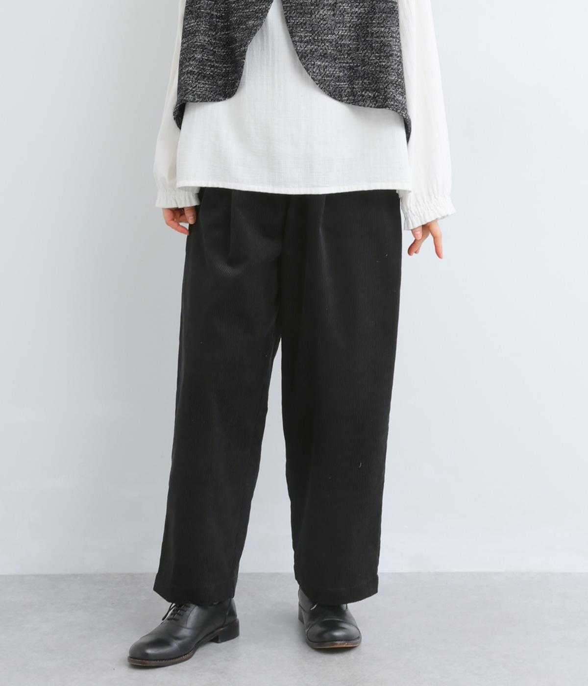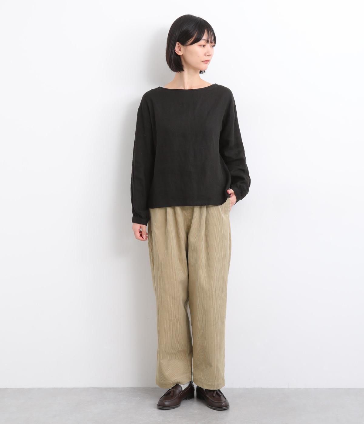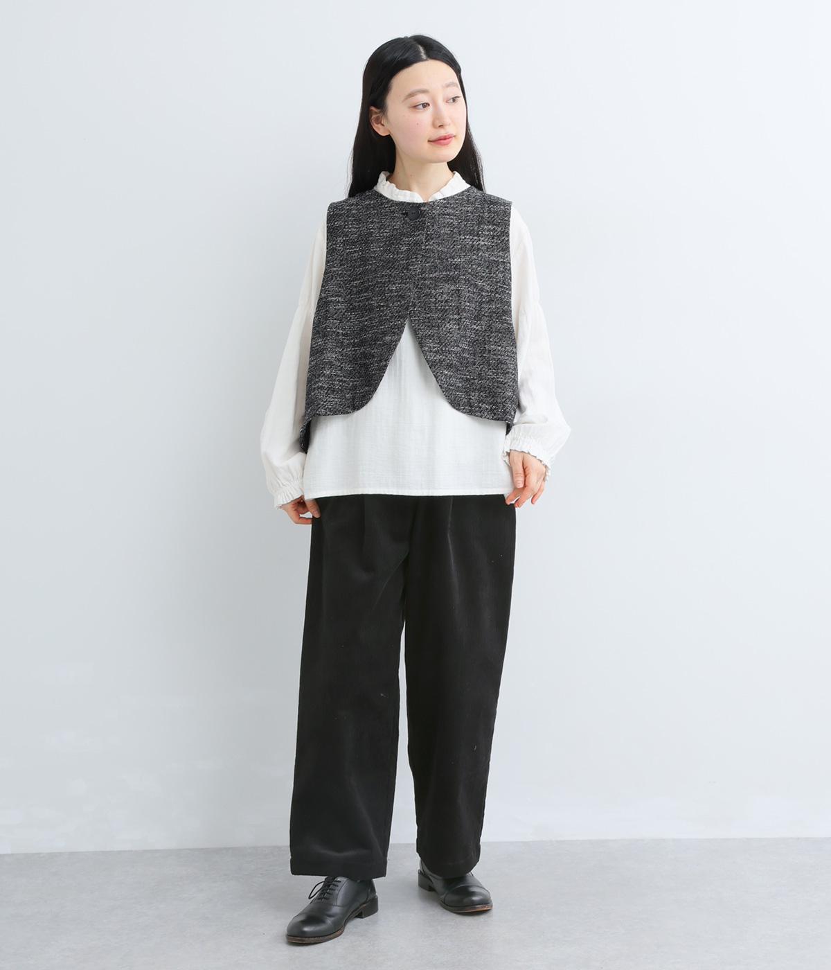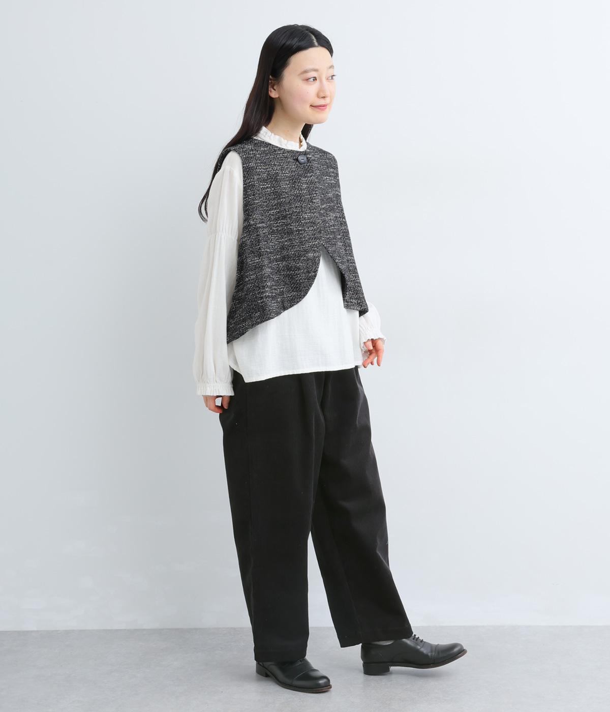中畝のコットンコーデュロイが、あたたかみのある質感を引き立てます。やわらかさのなかにほどよい厚みがあり、肌あたりもやさしく快適です。凹凸のある表情が、季節感のある落ち着いた雰囲気に。