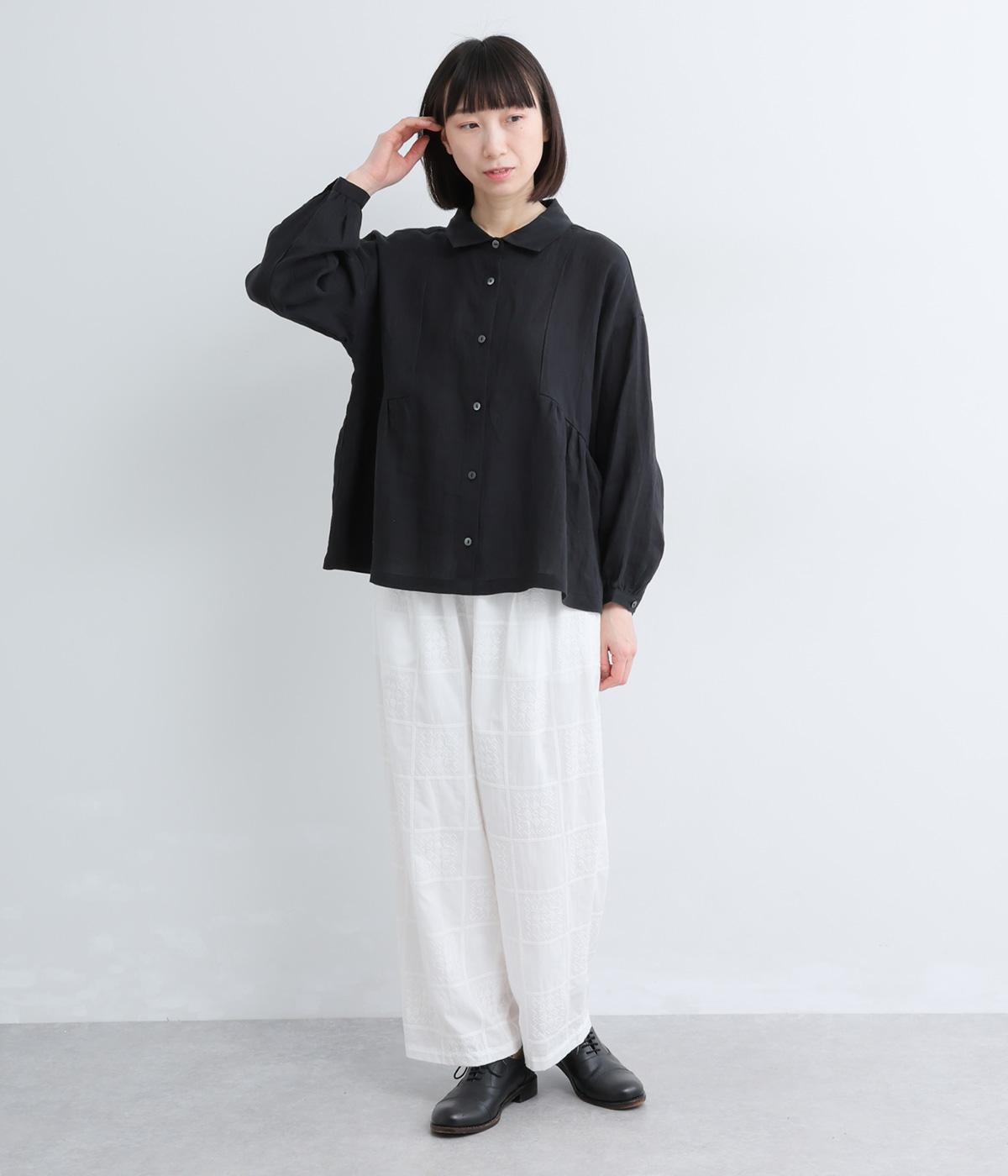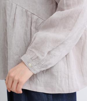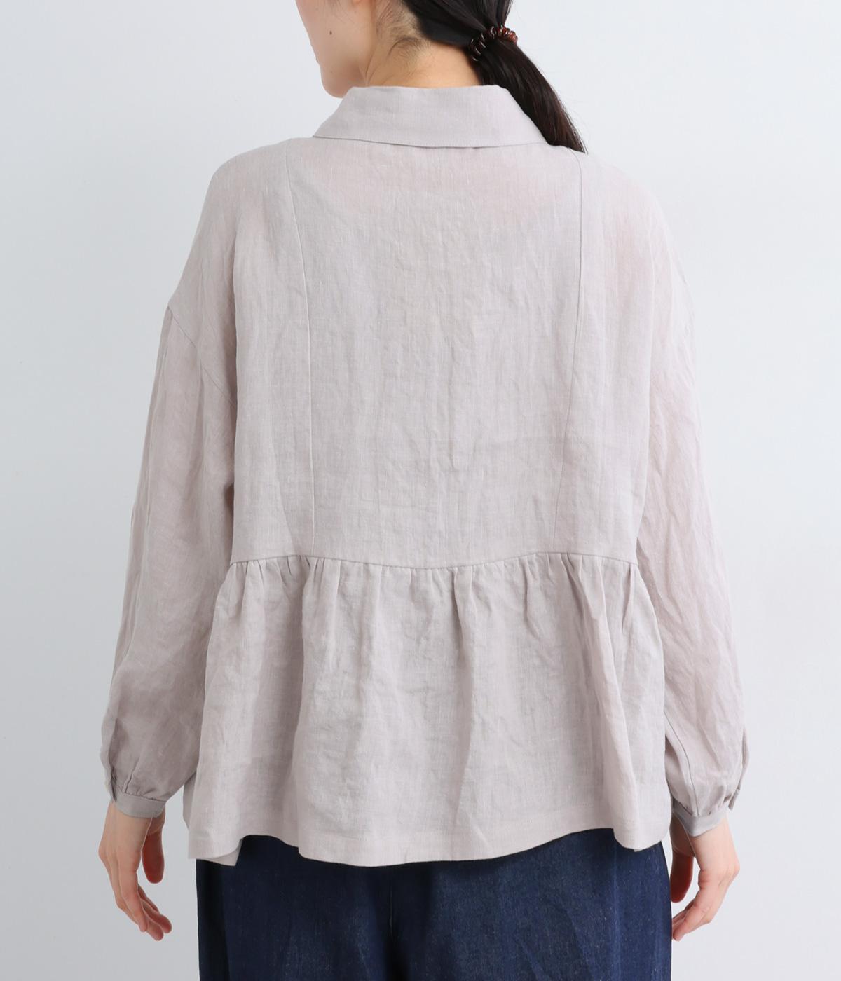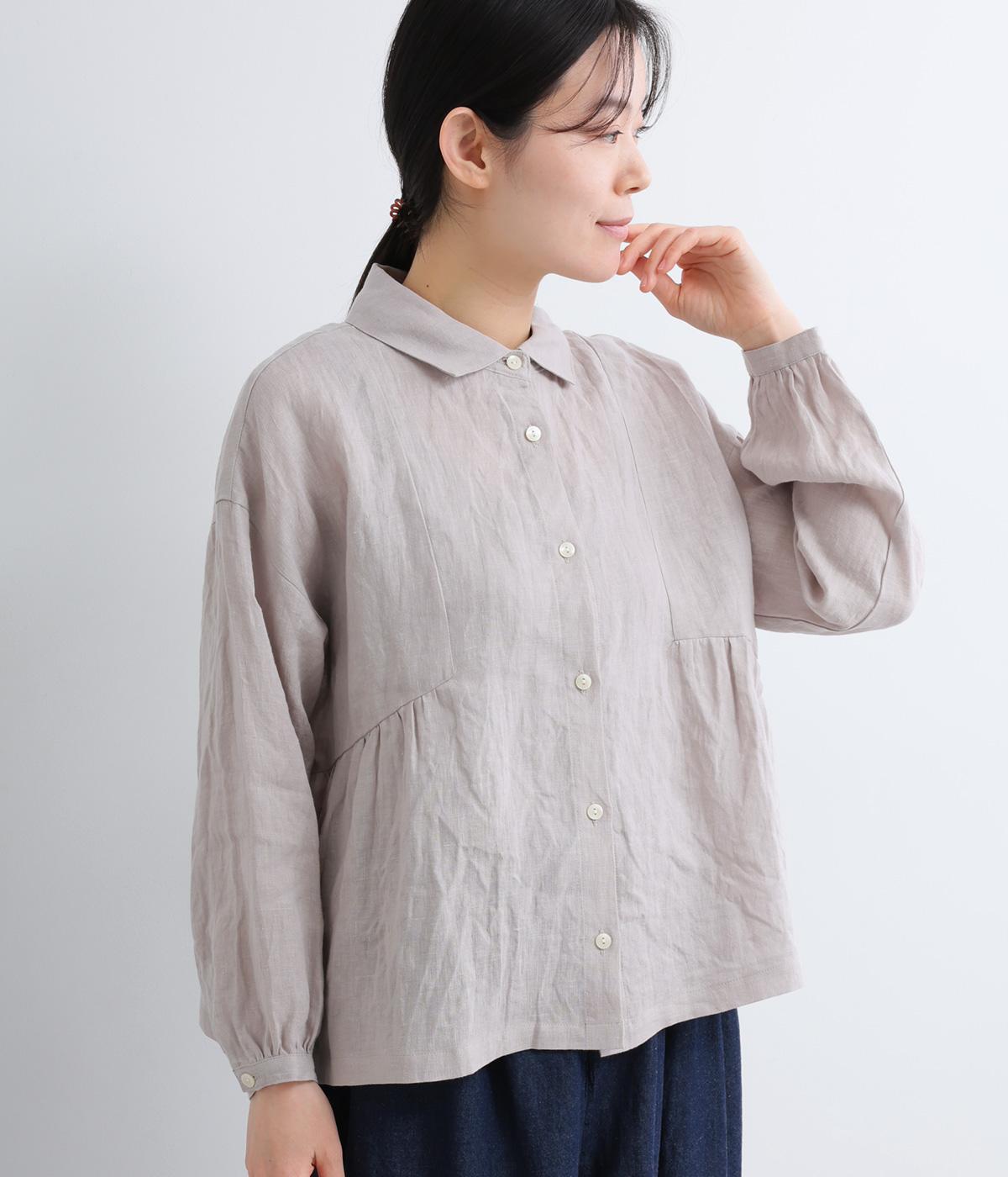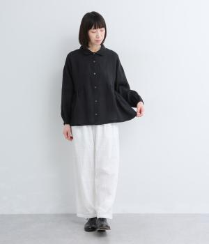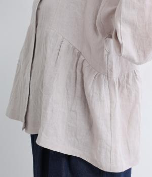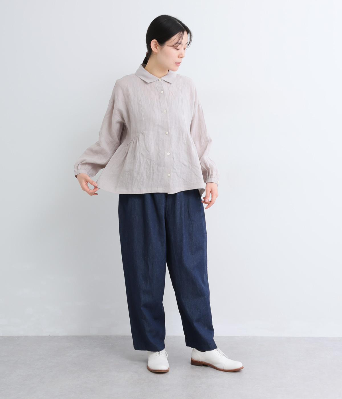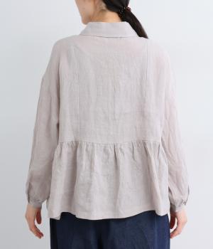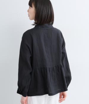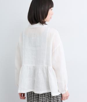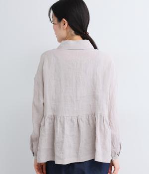 サイド切り替えにギャザーを寄せてゆるやかなペプラムシルエットに仕立てたブラウス。ナチュラル素材が心地よく、デザインでほどよく華やかさを足しました。襟つきできちんと感を出し、気負わずデイリーに着られる仕上がりになっています。