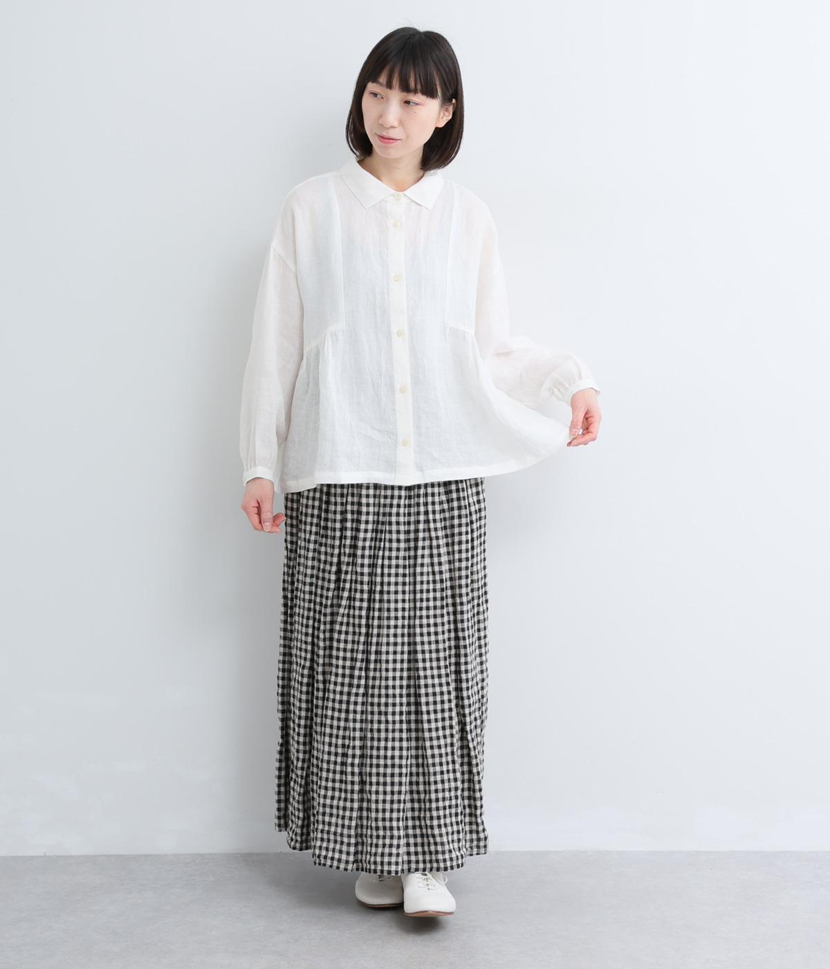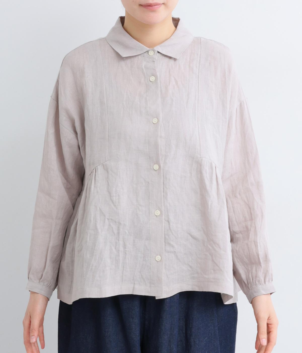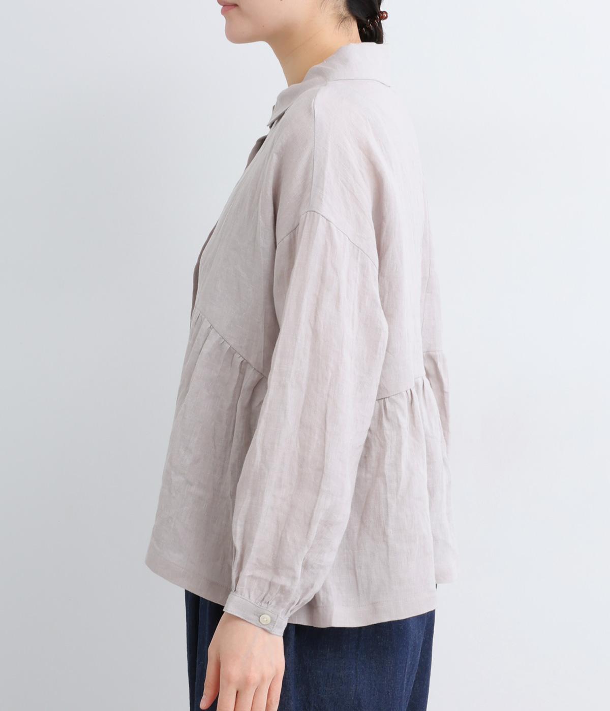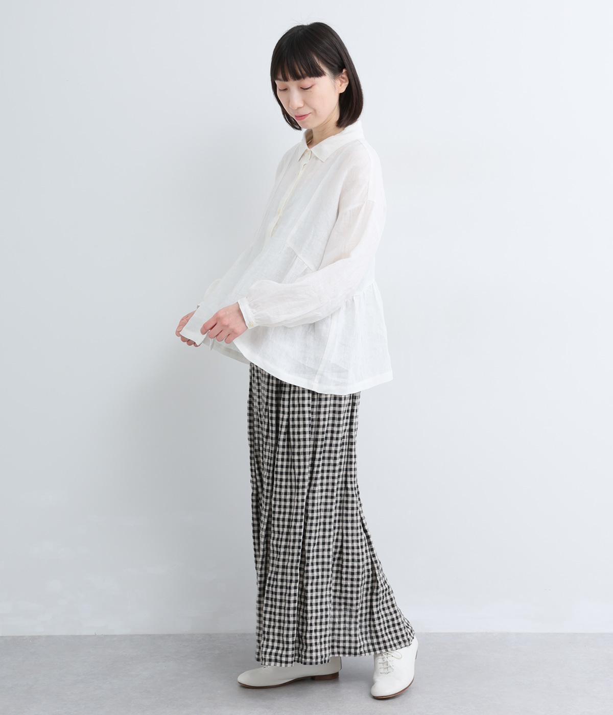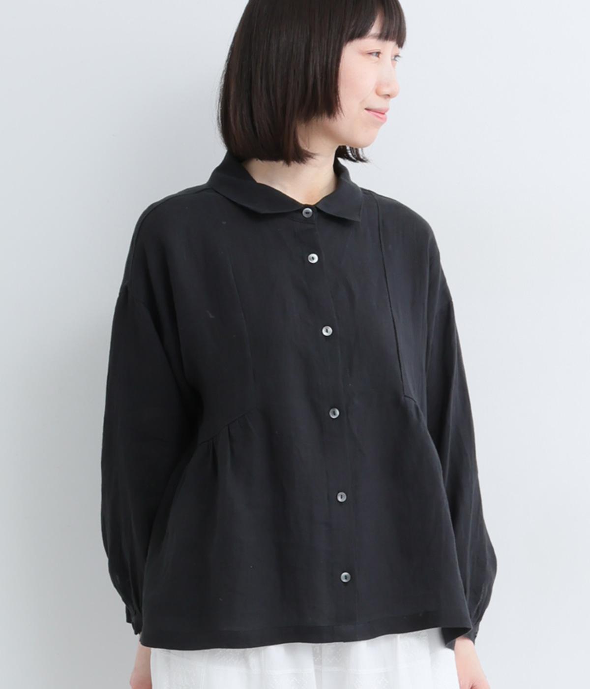サイド切り替えにギャザーを寄せてゆるやかなペプラムシルエットに仕立てたブラウス。ナチュラル素材が心地よく、デザインでほどよく華やかさを足しました。襟つきできちんと感を出し、気負わずデイリーに着られる仕上がりになっています。