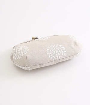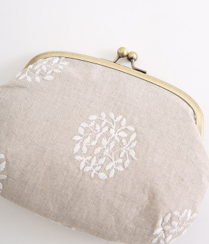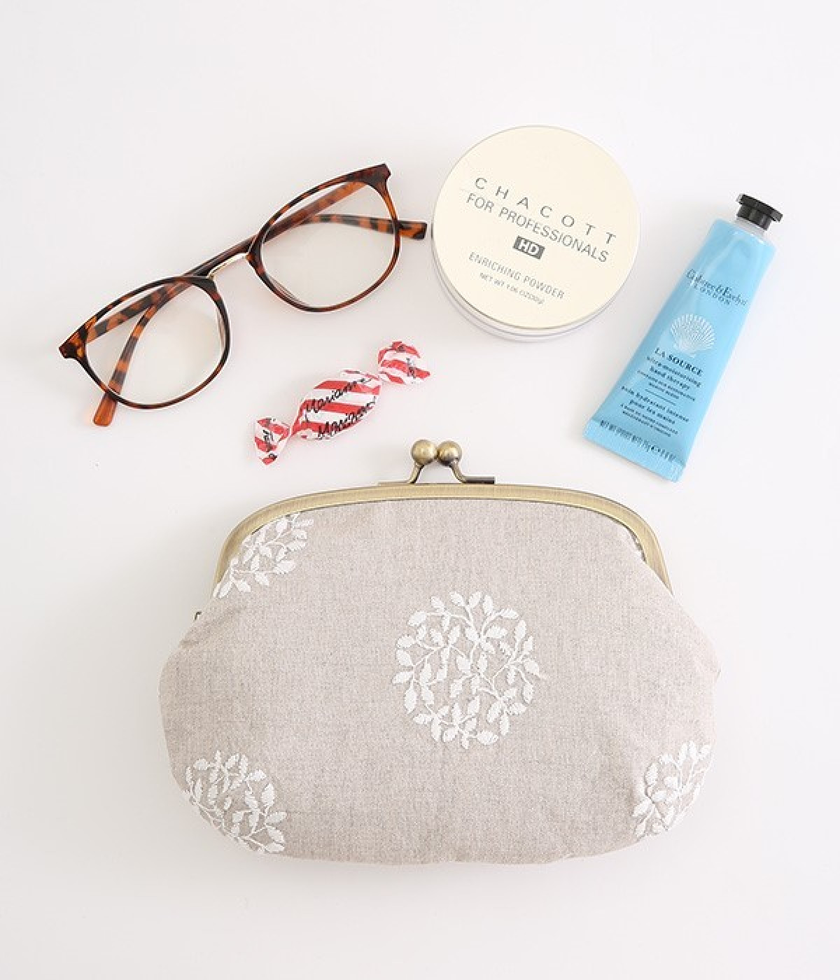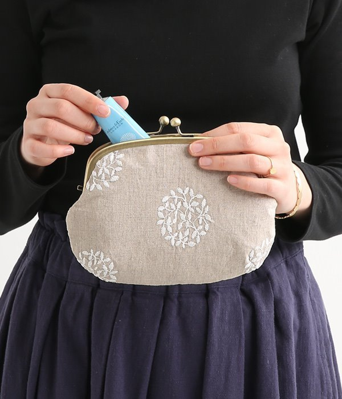 ナチュラルな風合いの麻に繊細な刺しゅうを施したがま口ポーチです。ふんわりとしたシルエットがかわいらしく、収納力もたっぷり。眼鏡やハンドクリームなどの必需品入れや、布マスクや消毒液などの除菌グッズ入れ、メイク用品を入れるポーチとしてなど、幅広い用途で使えます。口が大きく開くので取り出しやすく使い勝手抜群。使い続けるほどになじんでいく、リネンの経年変化も楽しめます。