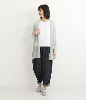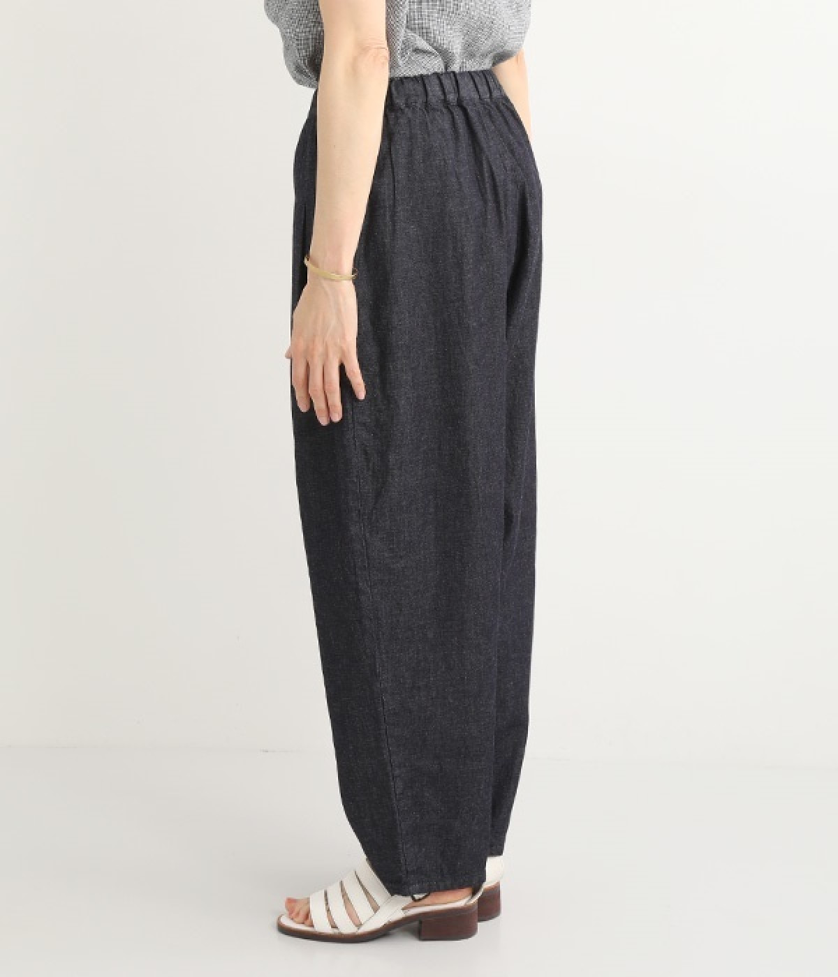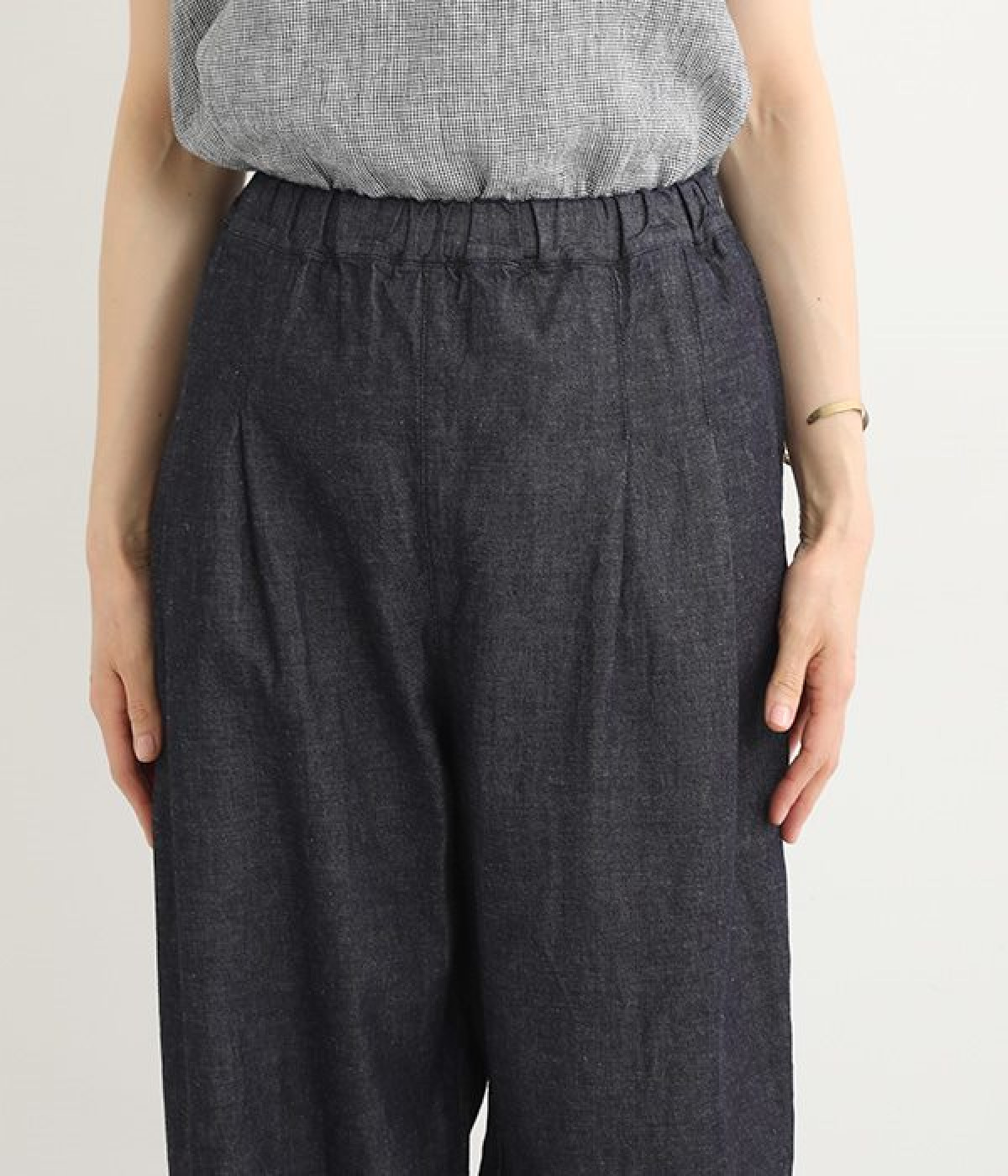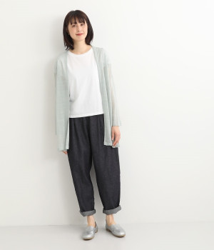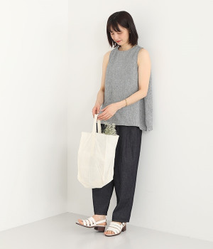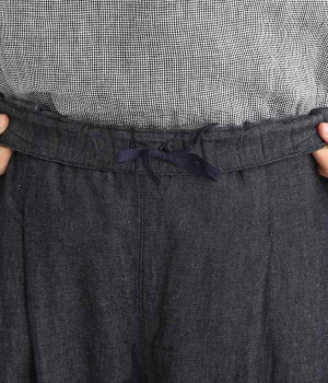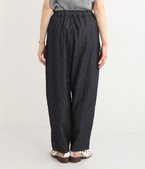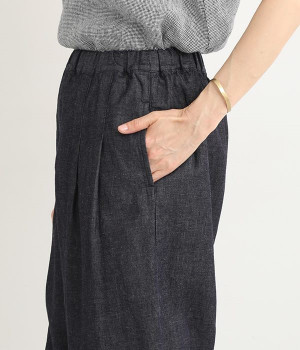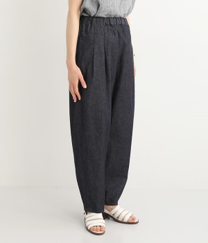 ナチュラルなやわらかさが魅力のコットンリネンデニムで仕立てたパンツです。ウエストにタックを寄せてゆったりとさせ、裾に向かってすっきりと見せたテーパードシルエットが特徴。ボリュームがあるので、裾をラフにロールアップしたりとお好みで分量のアレンジも楽しめます。ウエストはぐるりとゴム、調節可能な内ひも入りのイージー仕様です。