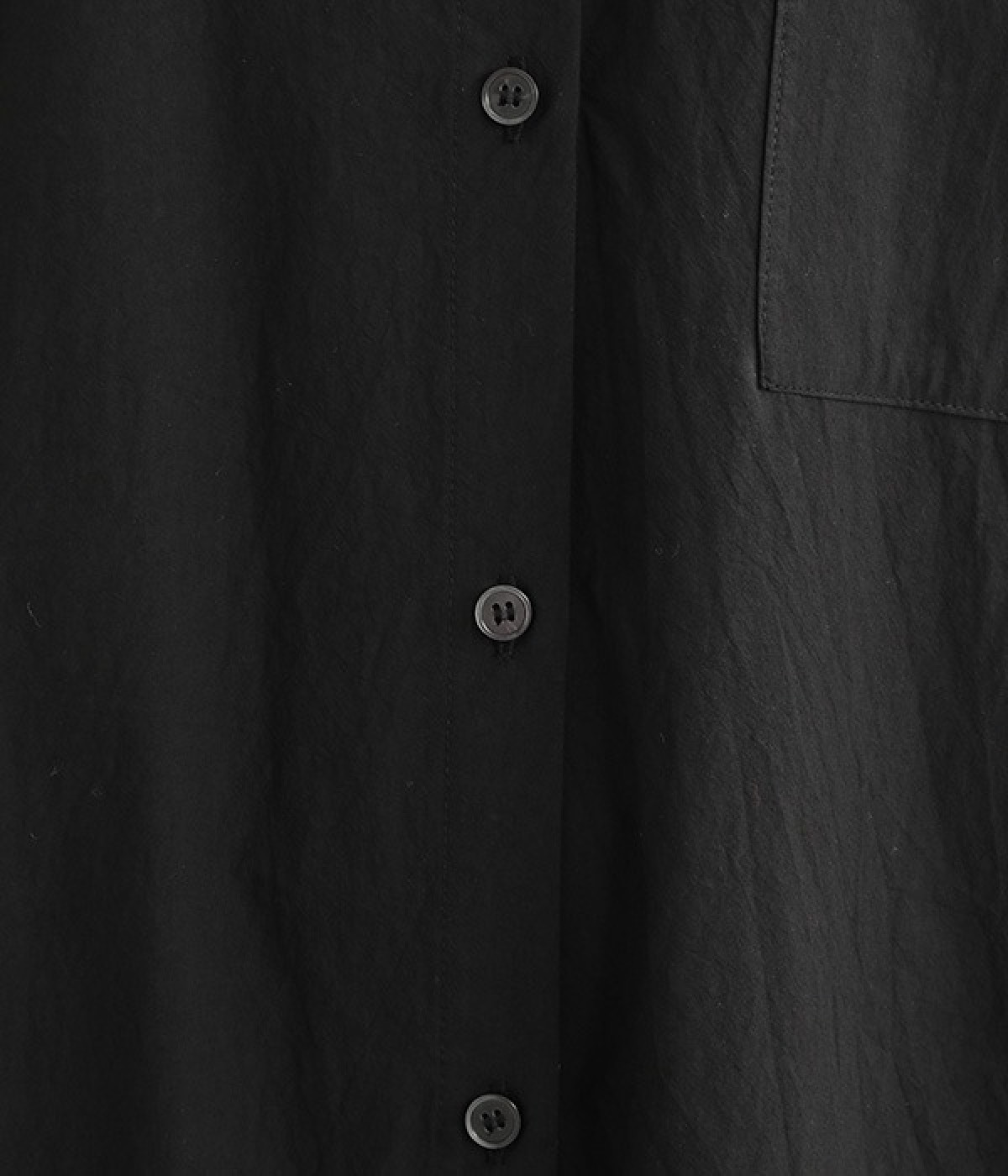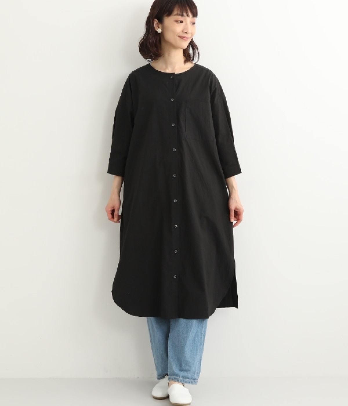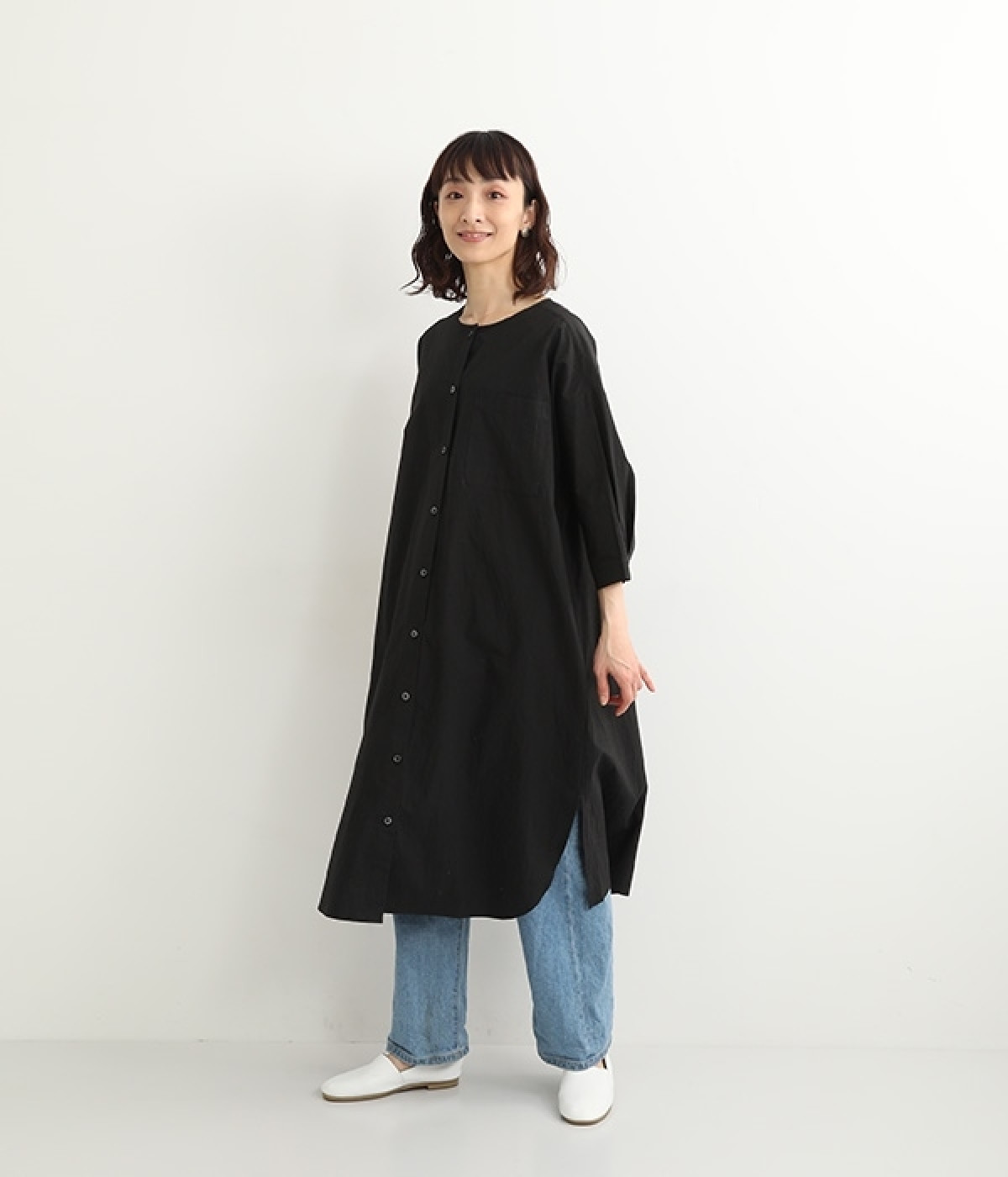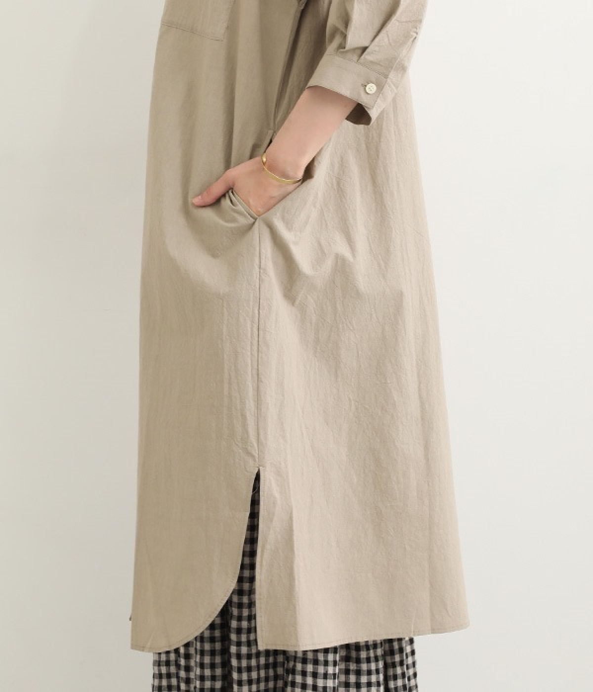 コットンタイプライター生地のハリを抑えたナチュラルな風合いが魅力のワンピースです。シンプルなシャツシルエットに、左胸の大きなポケットがアクセント。ゆとりのあるワイドシルエットで丈も長めなので、一枚でコーディネートが完成します。裾を大きくラウンドさせてスリットを入れた、さまざまなボトムとのレイヤードが楽しめるデザインです。