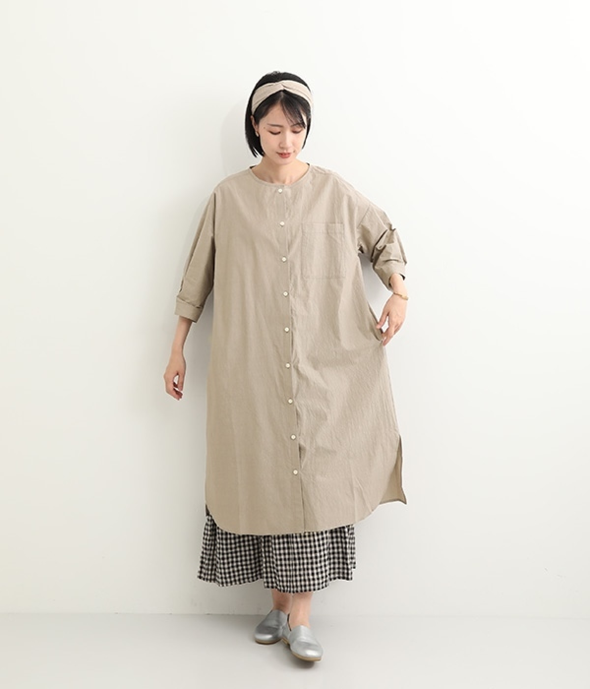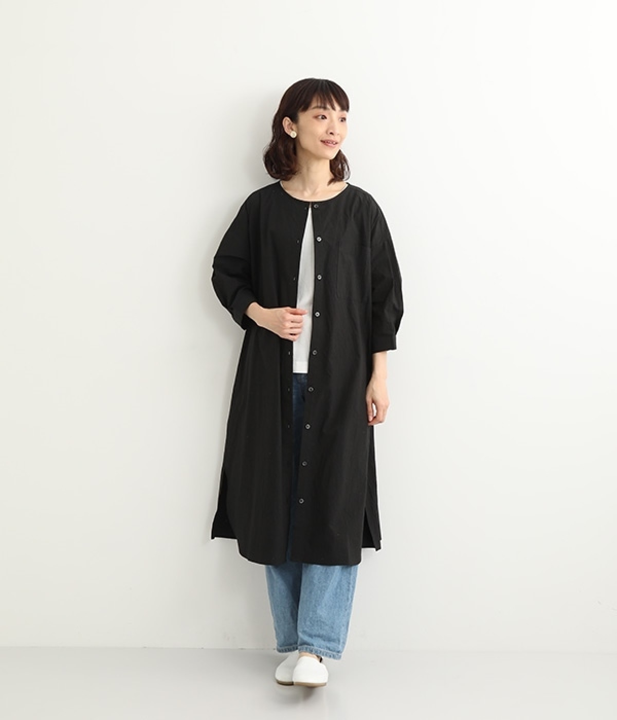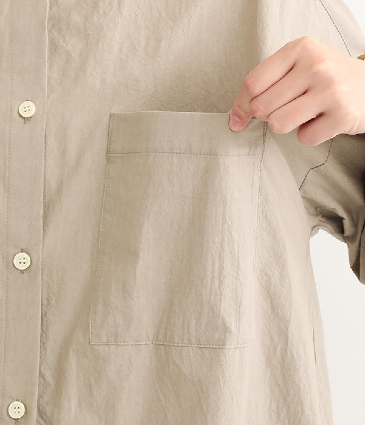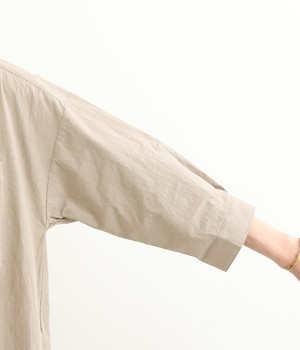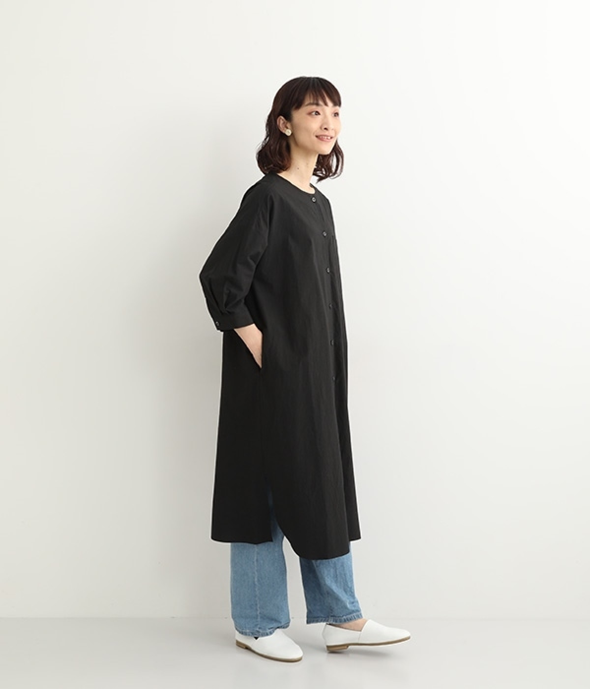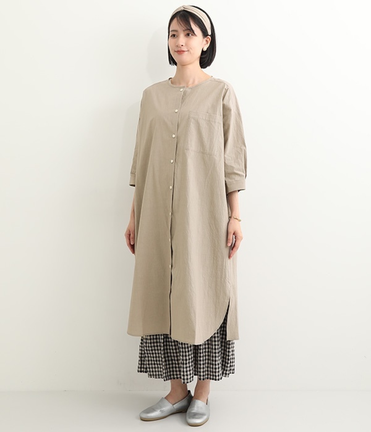 コットンタイプライター生地のハリを抑えたナチュラルな風合いが魅力のワンピースです。シンプルなシャツシルエットに、左胸の大きなポケットがアクセント。ゆとりのあるワイドシルエットで丈も長めなので、一枚でコーディネートが完成します。裾を大きくラウンドさせてスリットを入れた、さまざまなボトムとのレイヤードが楽しめるデザインです。