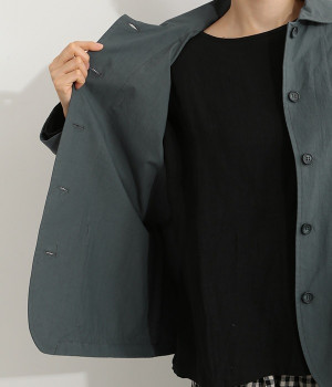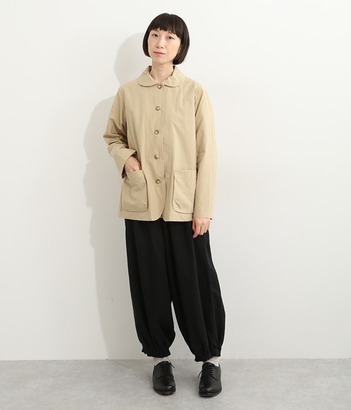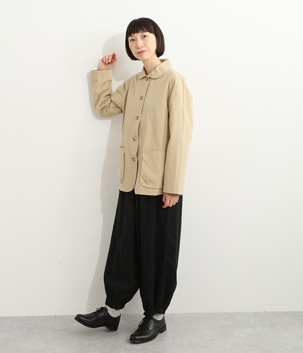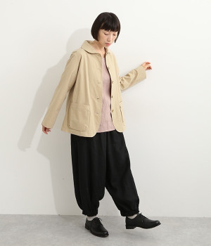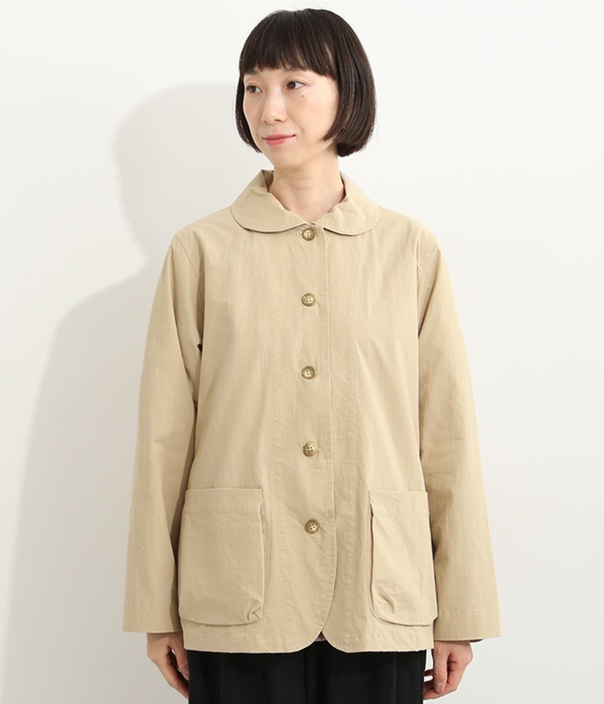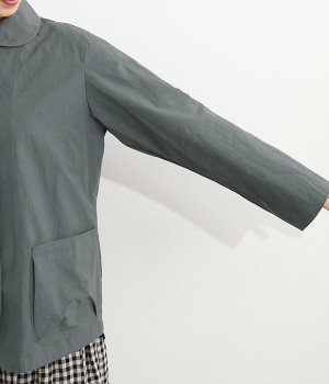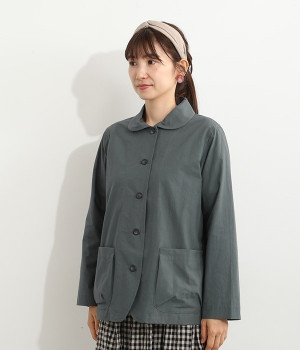 かわいらしくソフトな印象に見せてくれる丸襟を添えたジャケット。カーブした前合わせの裾ラインや角のないパッチポケットにも、やわらかさを意識したディテールが光ります。ボディや袖のシルエットはゆるくなりすぎないレギュラーシルエットを採用。シンプルで着まわしやすく、インナーに主張が強めのアイテムをしのばせてフロントからのぞかせるのもおすすめです。